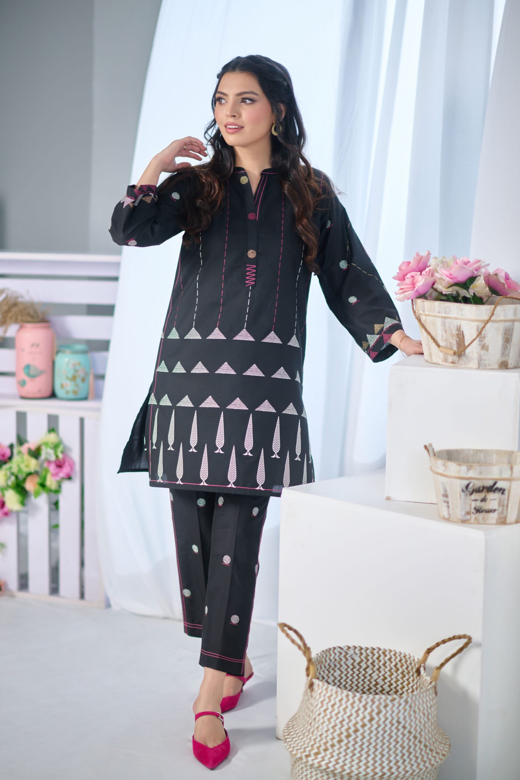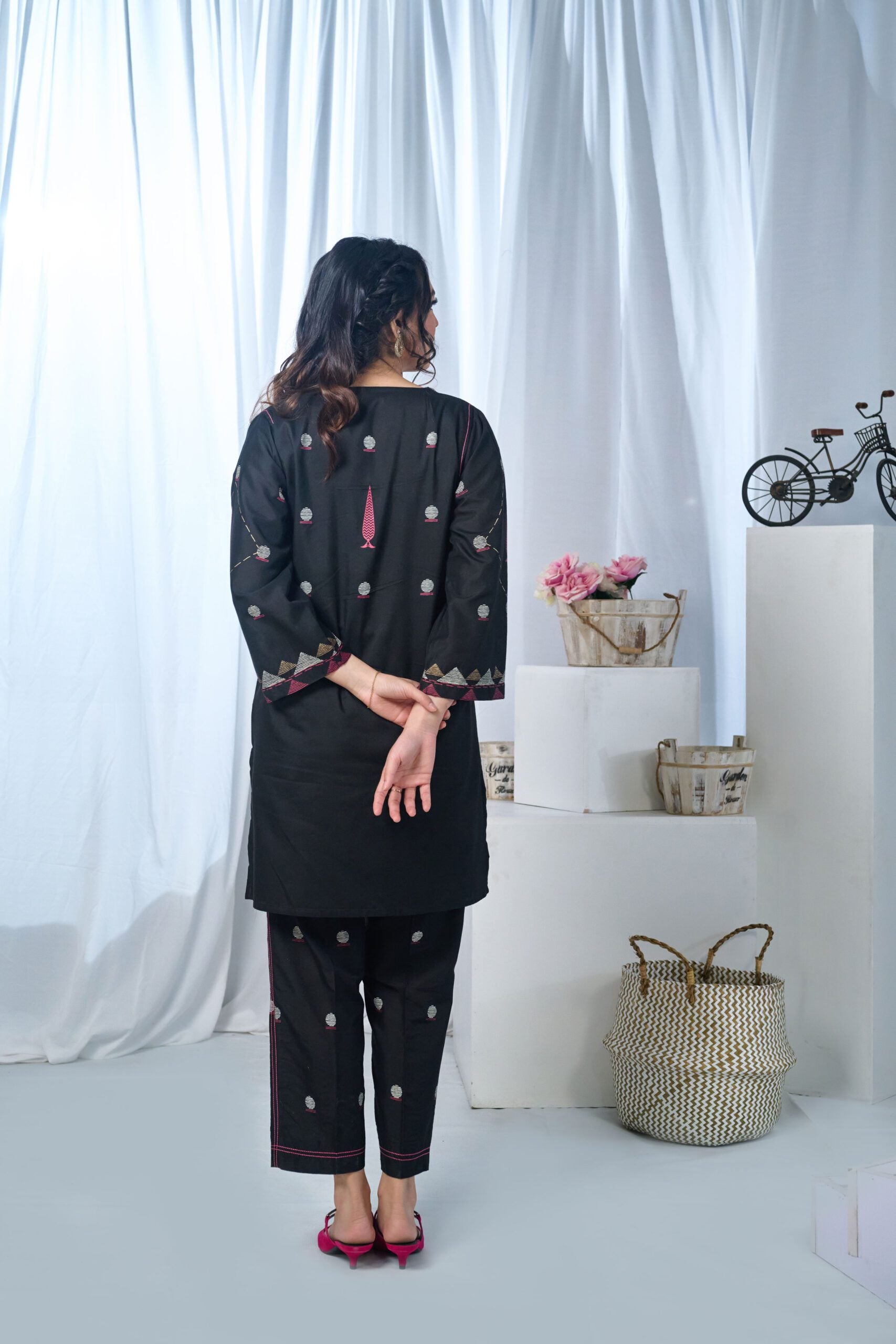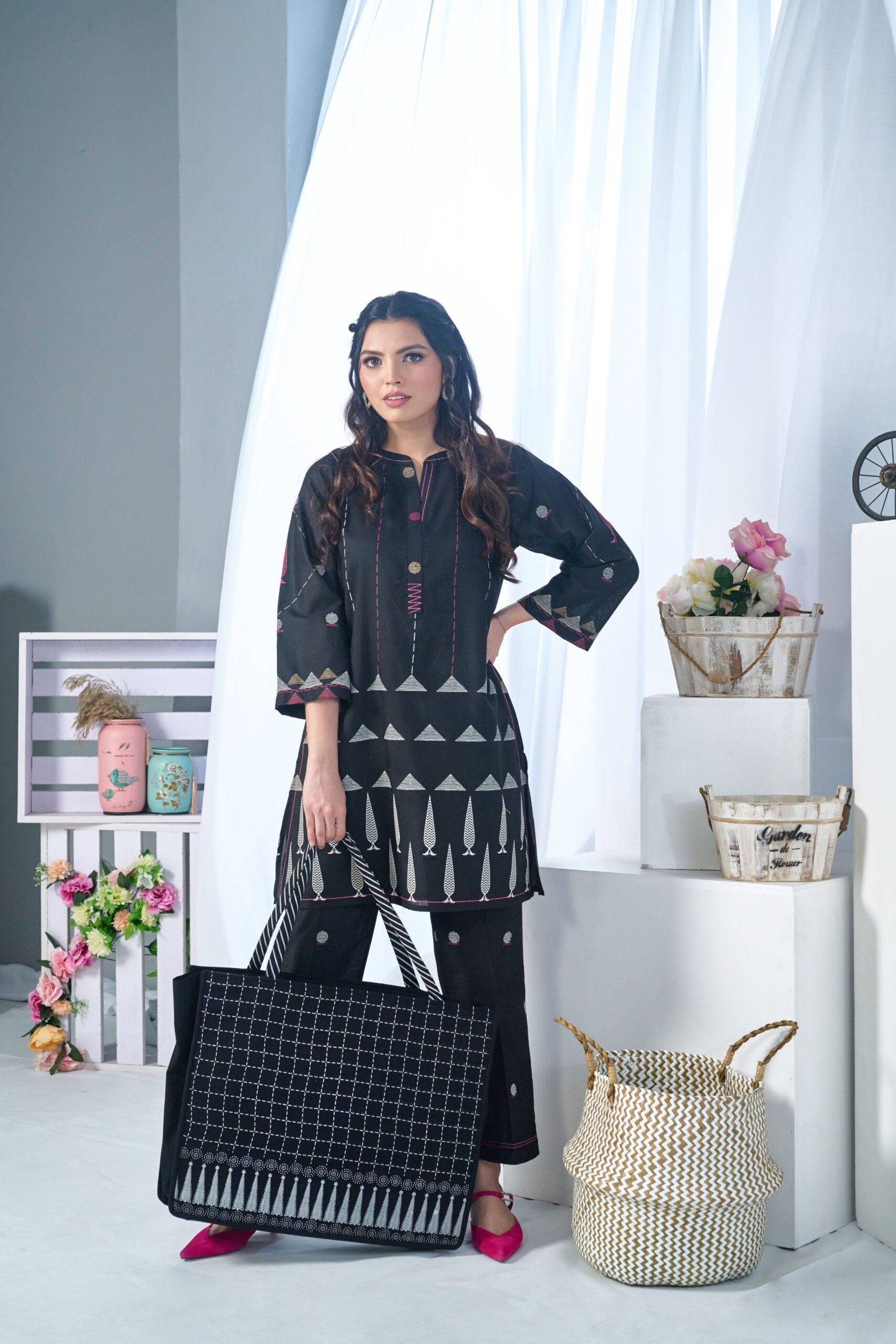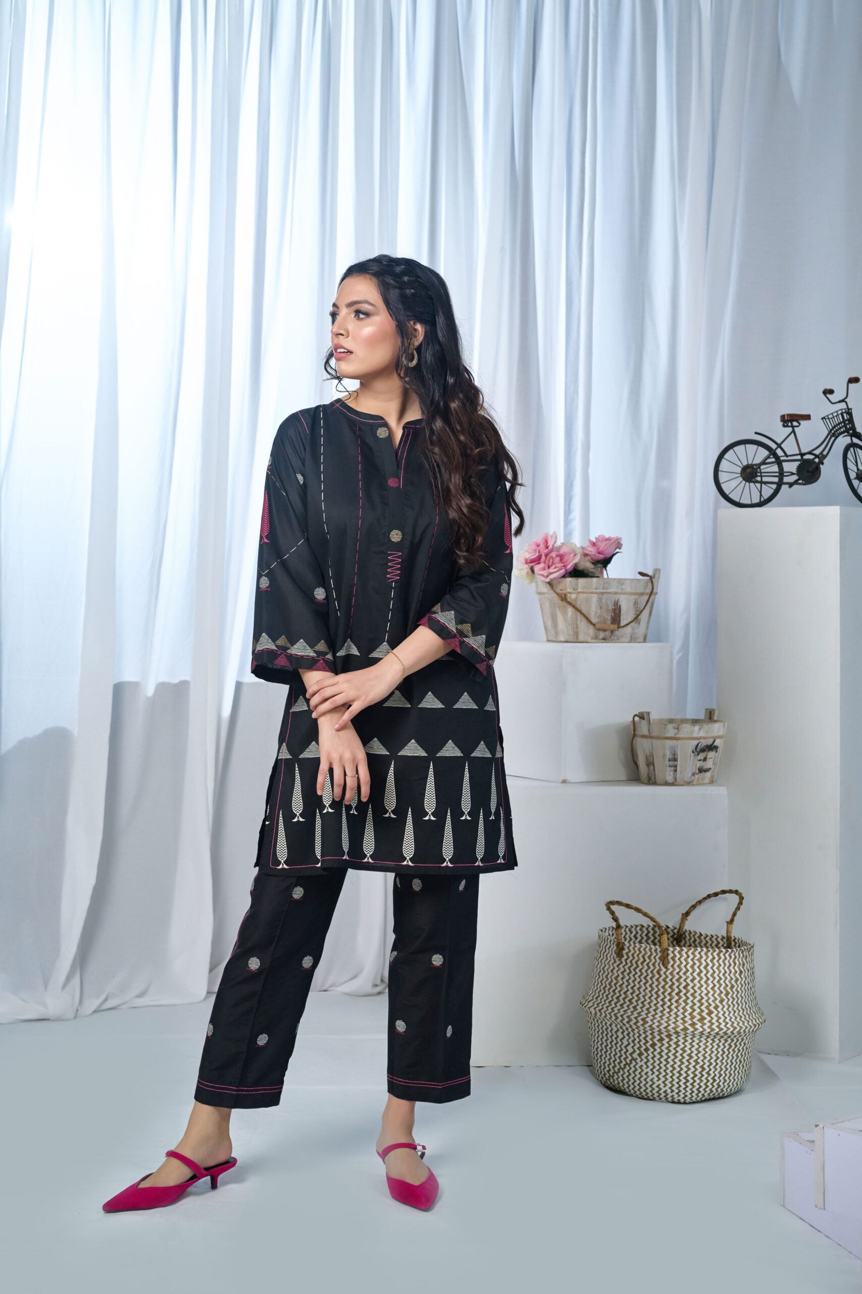 Black shirt and pant enhanced with soothing hand screen printed for classic look.