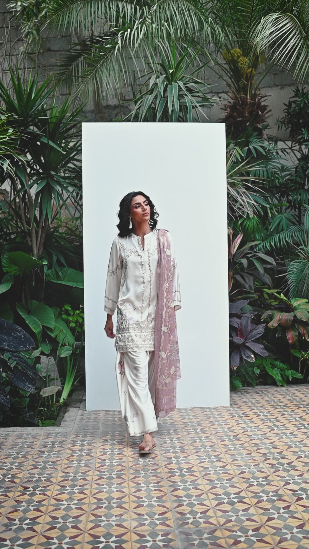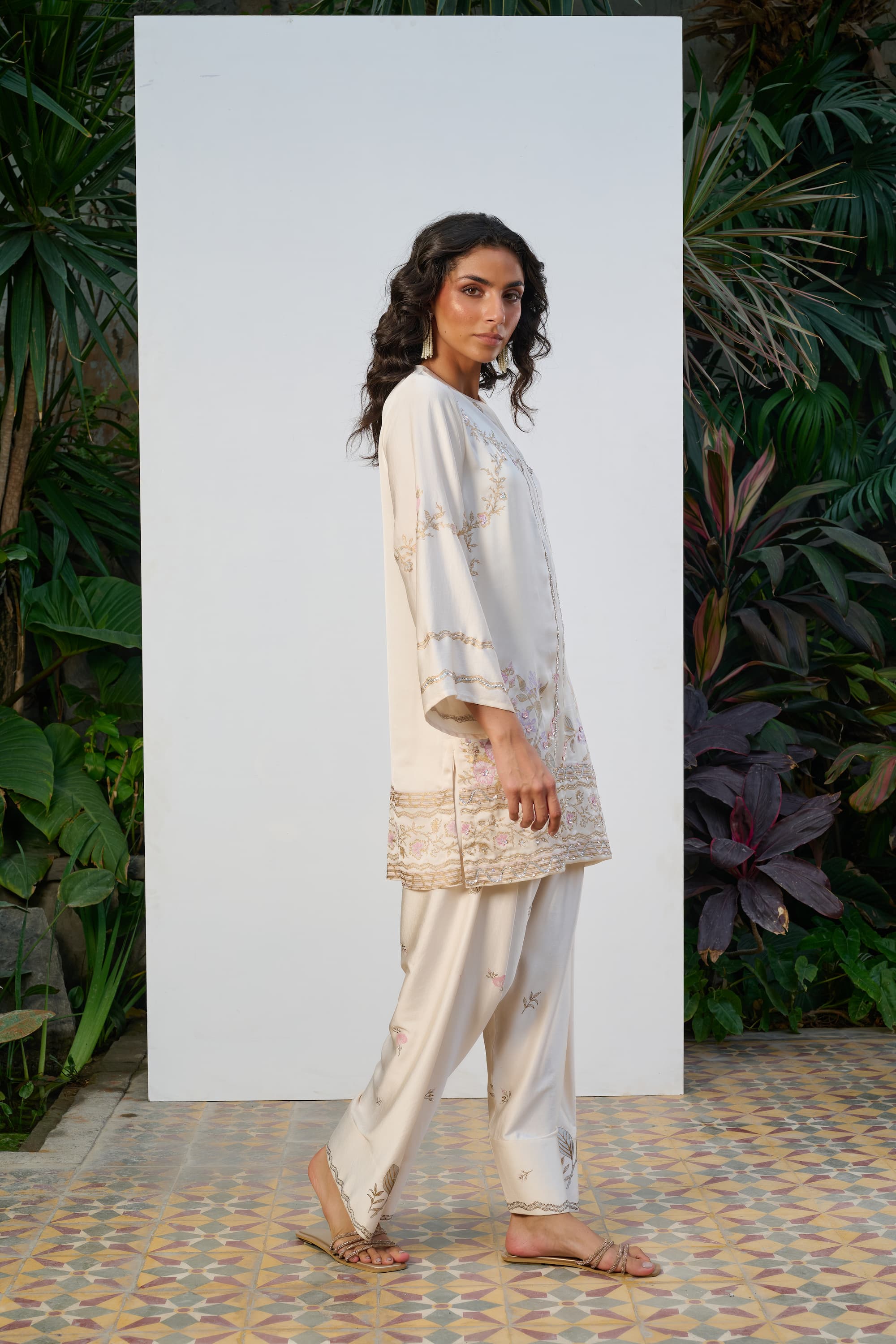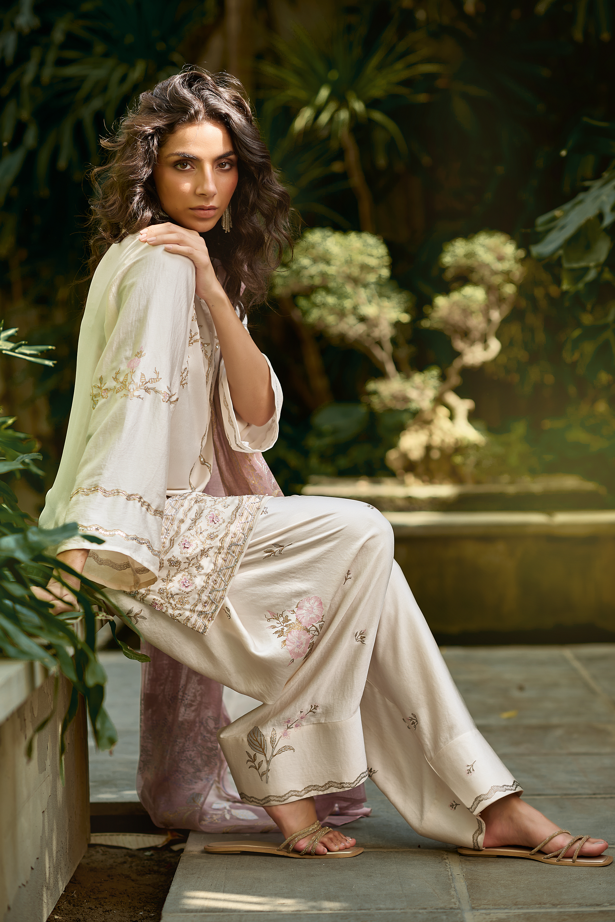 Ethereal and timeless, this off-white butter silk festive co-ord set is a celebration of refined craftsmanship and modern elegance. Meticulously hand screen printed in delicate shades of rose gold, silver, tea pink, and subtle hints of lilac, the ensemble radiates a soft, luminous charm.