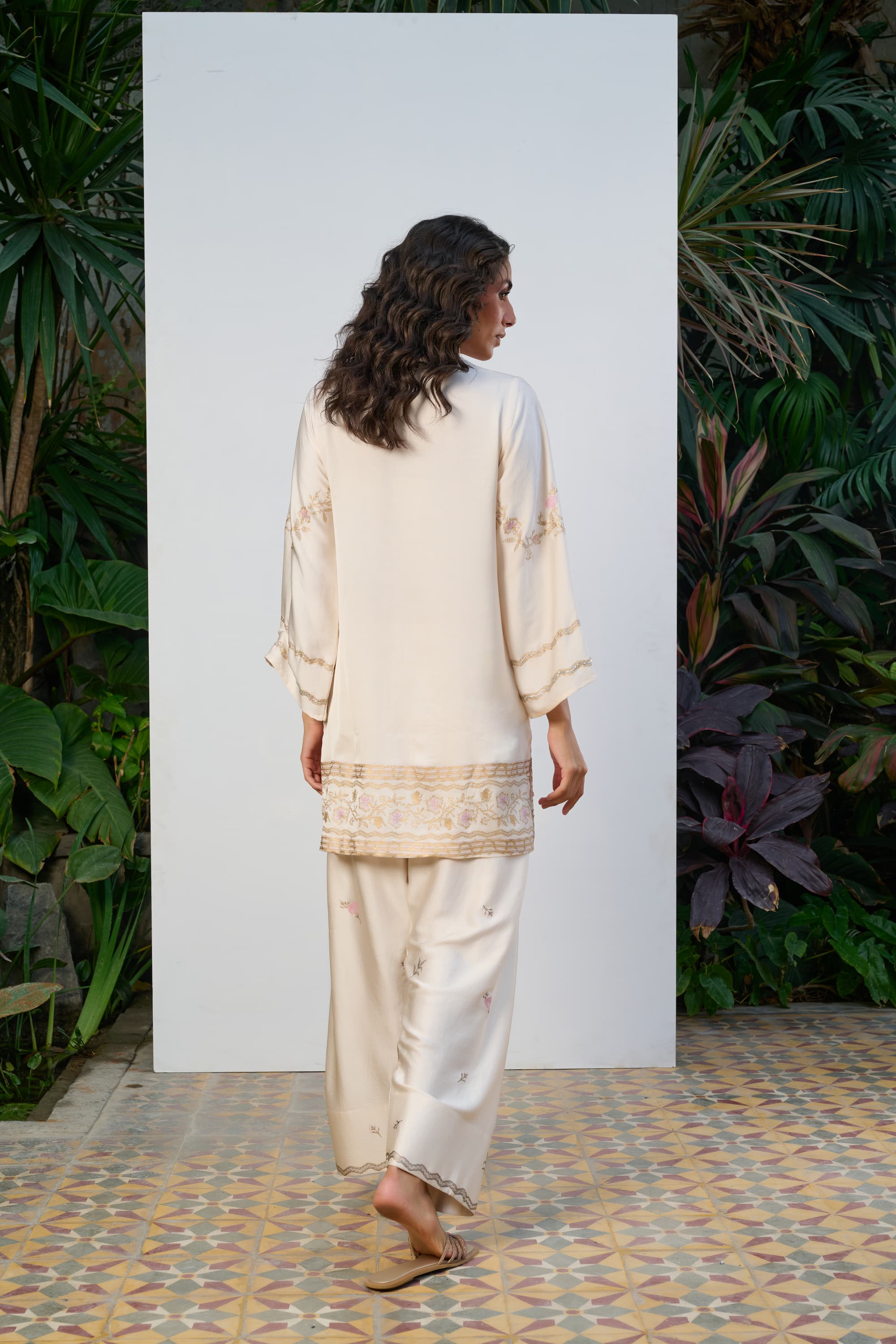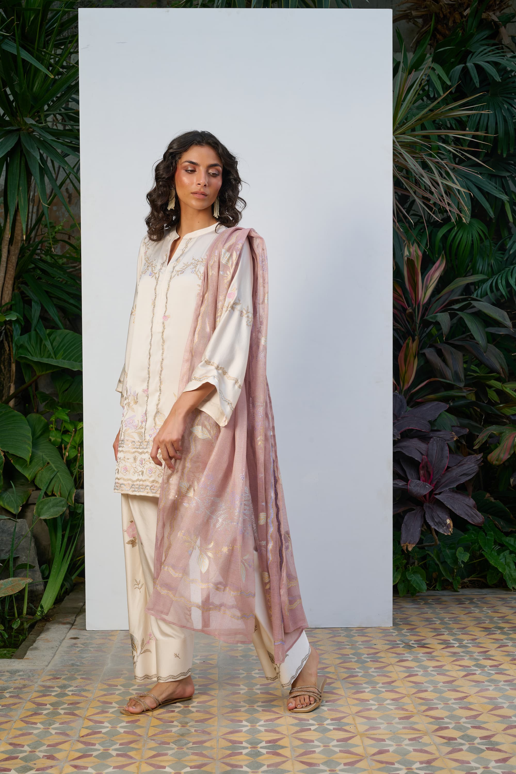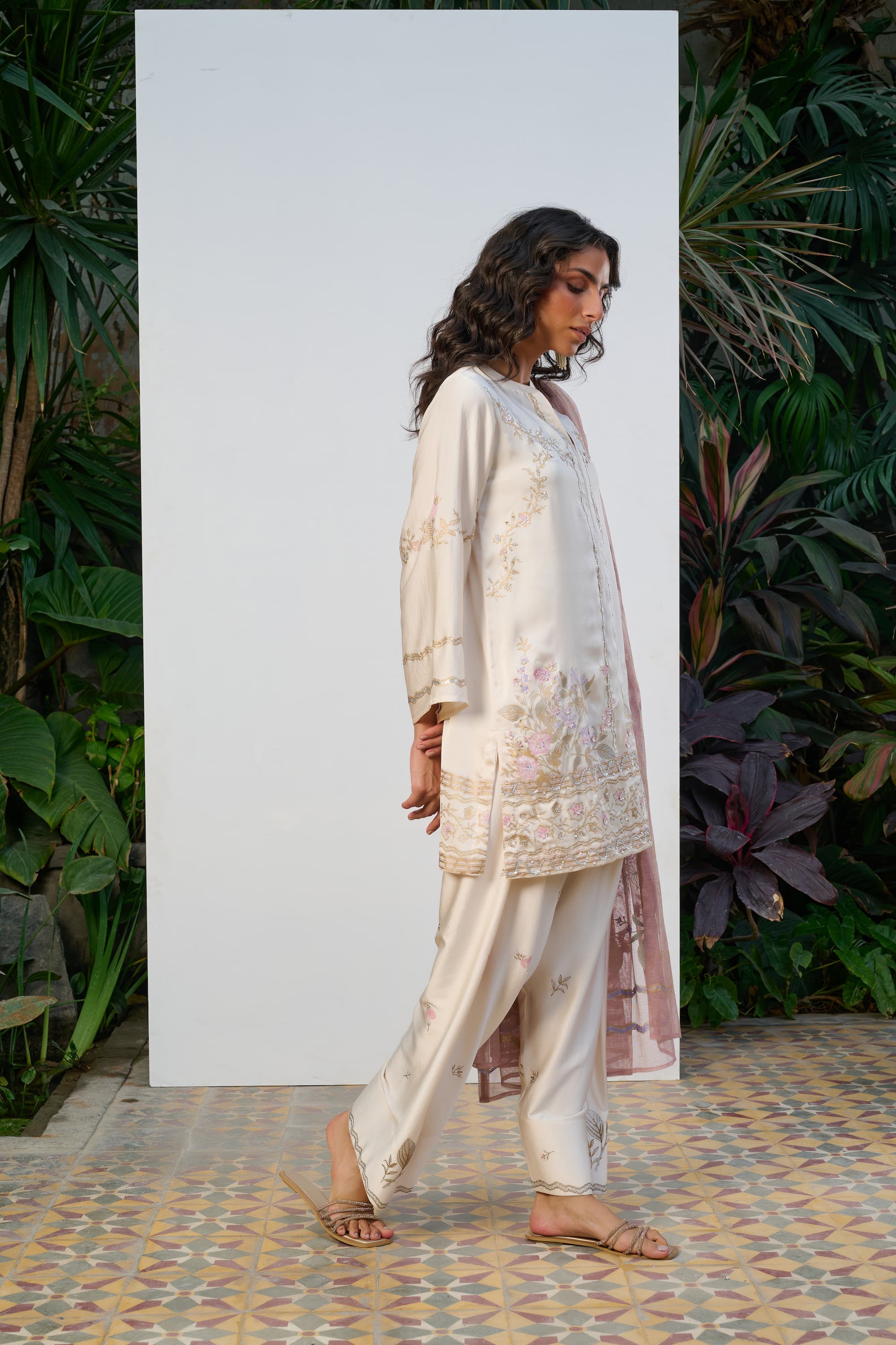 Ethereal and timeless, this off-white butter silk festive co-ord set is a celebration of refined craftsmanship and modern elegance. Meticulously hand screen printed in delicate shades of rose gold, silver, tea pink, and subtle hints of lilac, the ensemble radiates a soft, luminous charm.