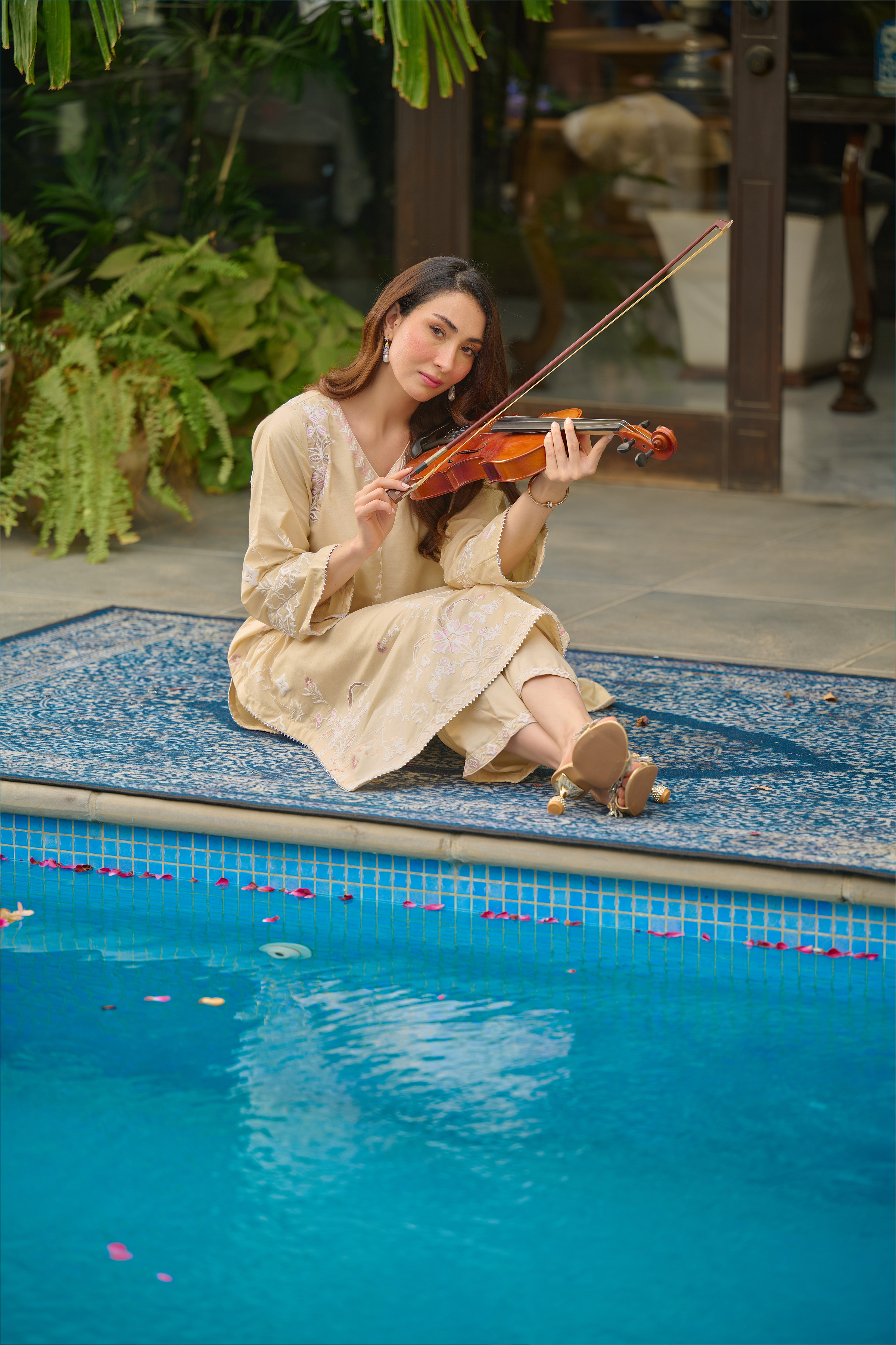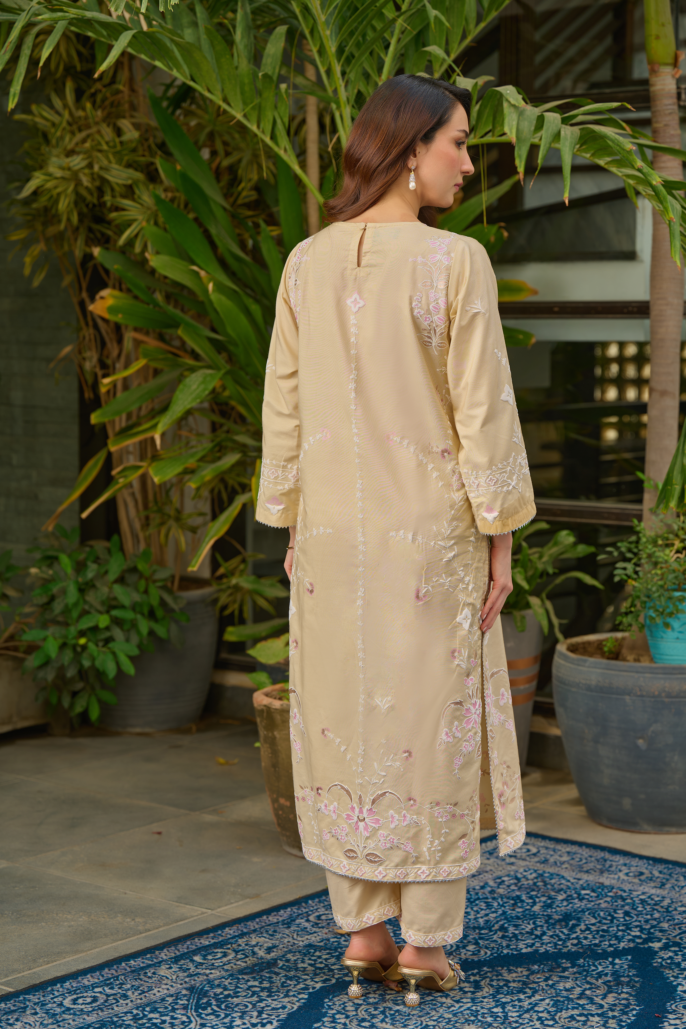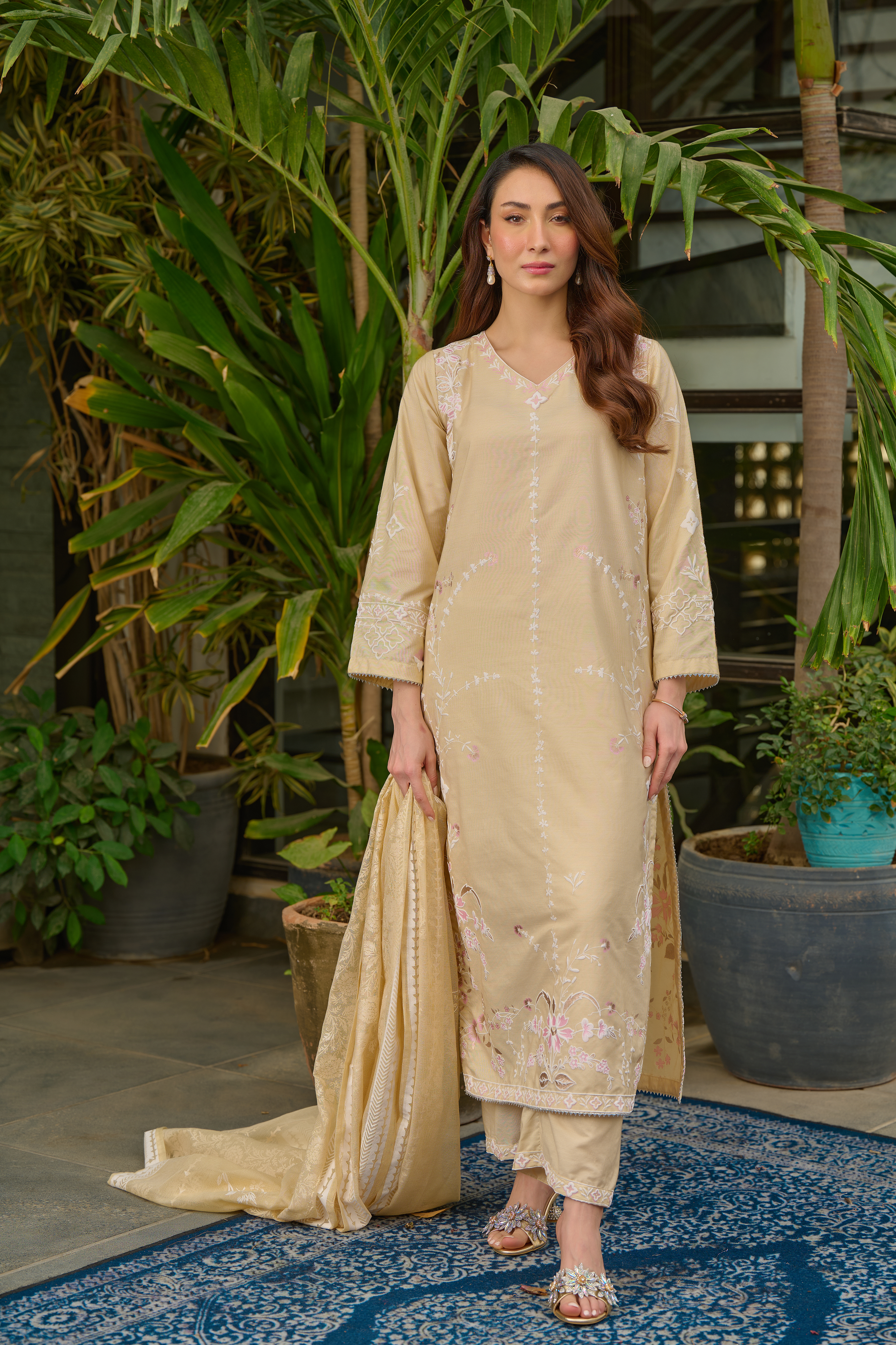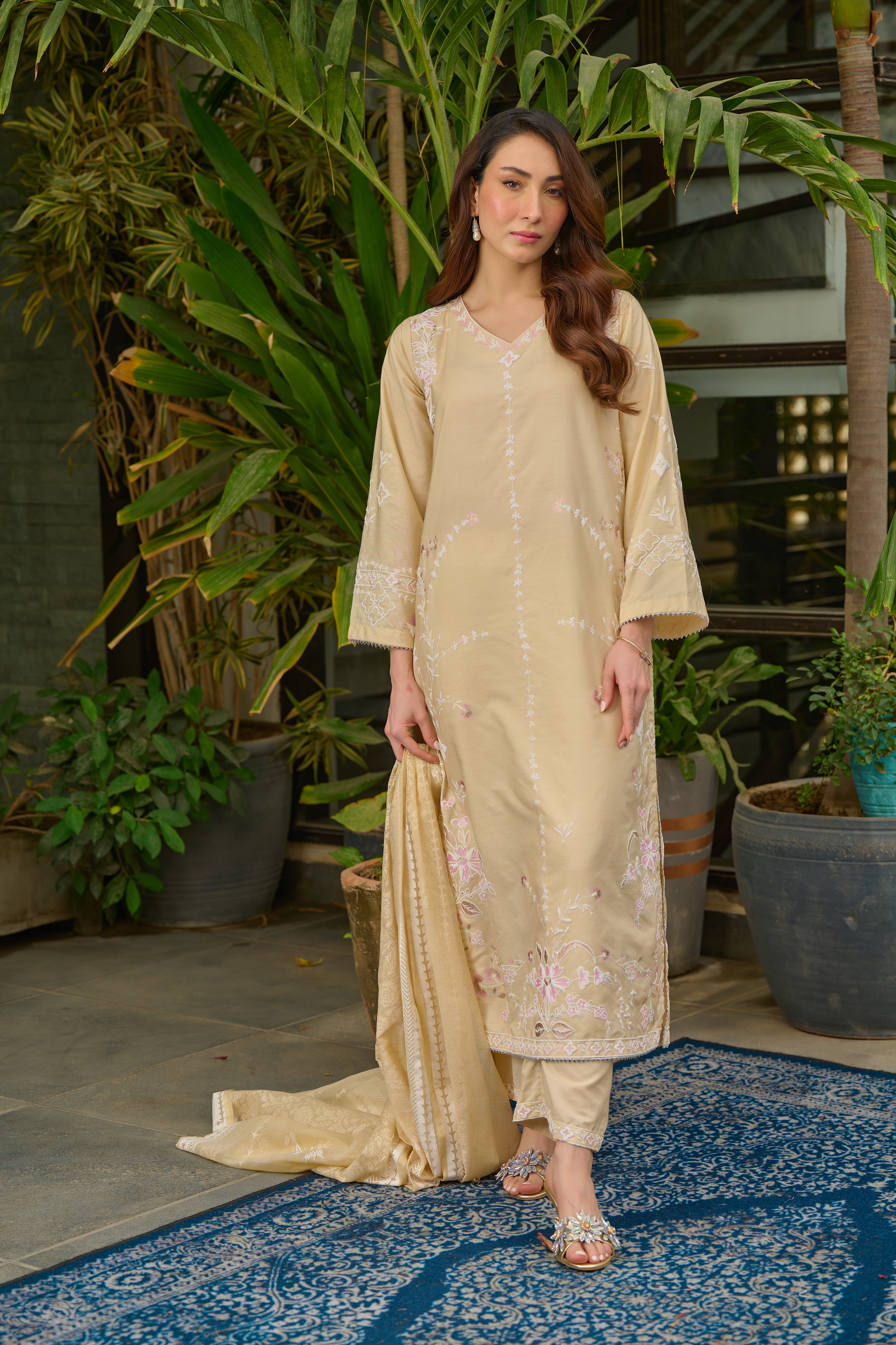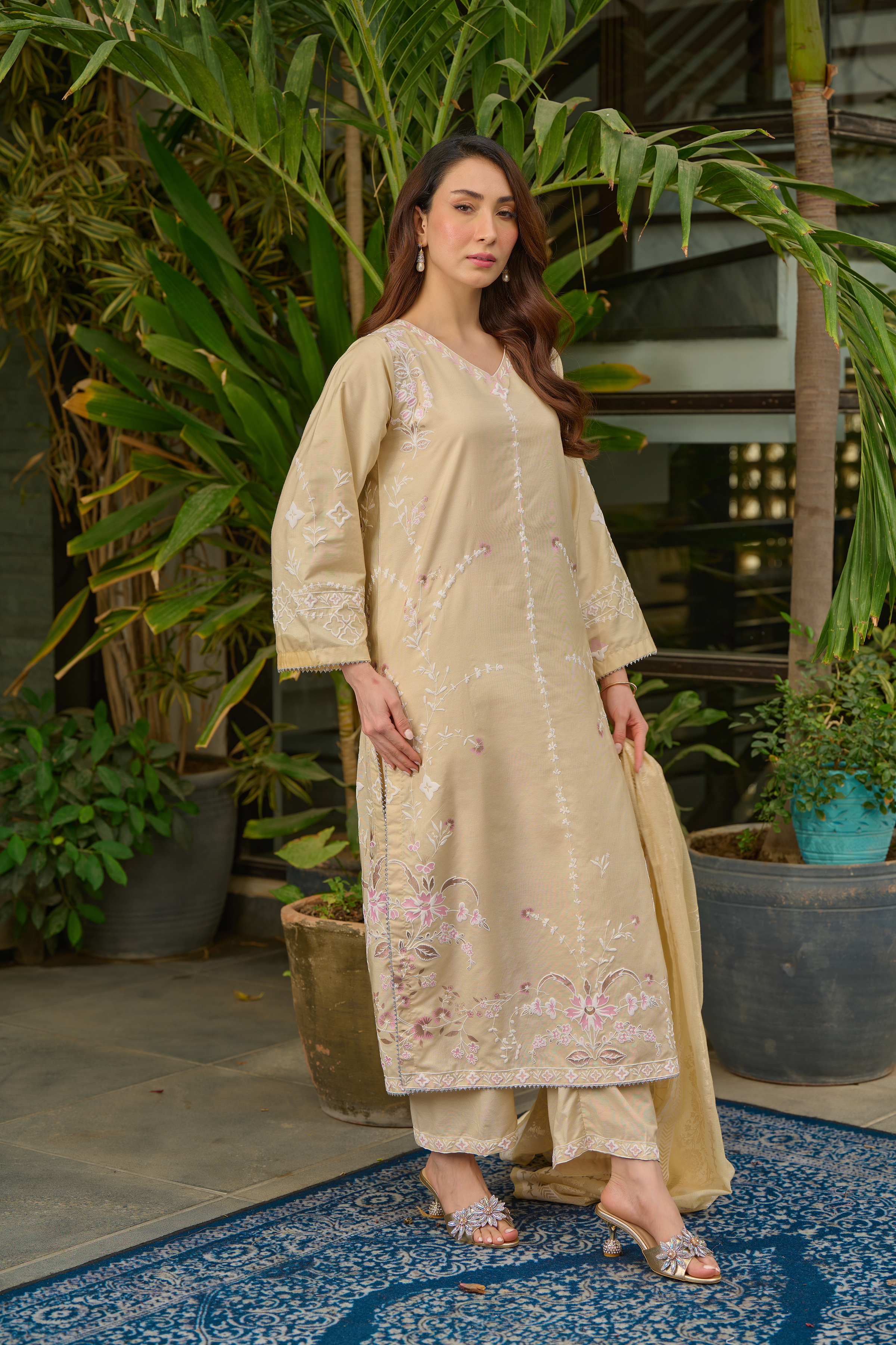 Description: Drape yourself in Beige set– Draped in elegance, this luxurious beige piece is adorned with intricate hand-screen prints in shimmering pearl and gold hues. The delicate detailing adds a touch of timeless sophistication, making it perfect for both daytime grace and evening allure. Crafted from premium fabric, it ensures effortless comfort while exuding modern ethnic charm. Pair it with statement accessories for a refined look or keep it minimal for understated elegance.