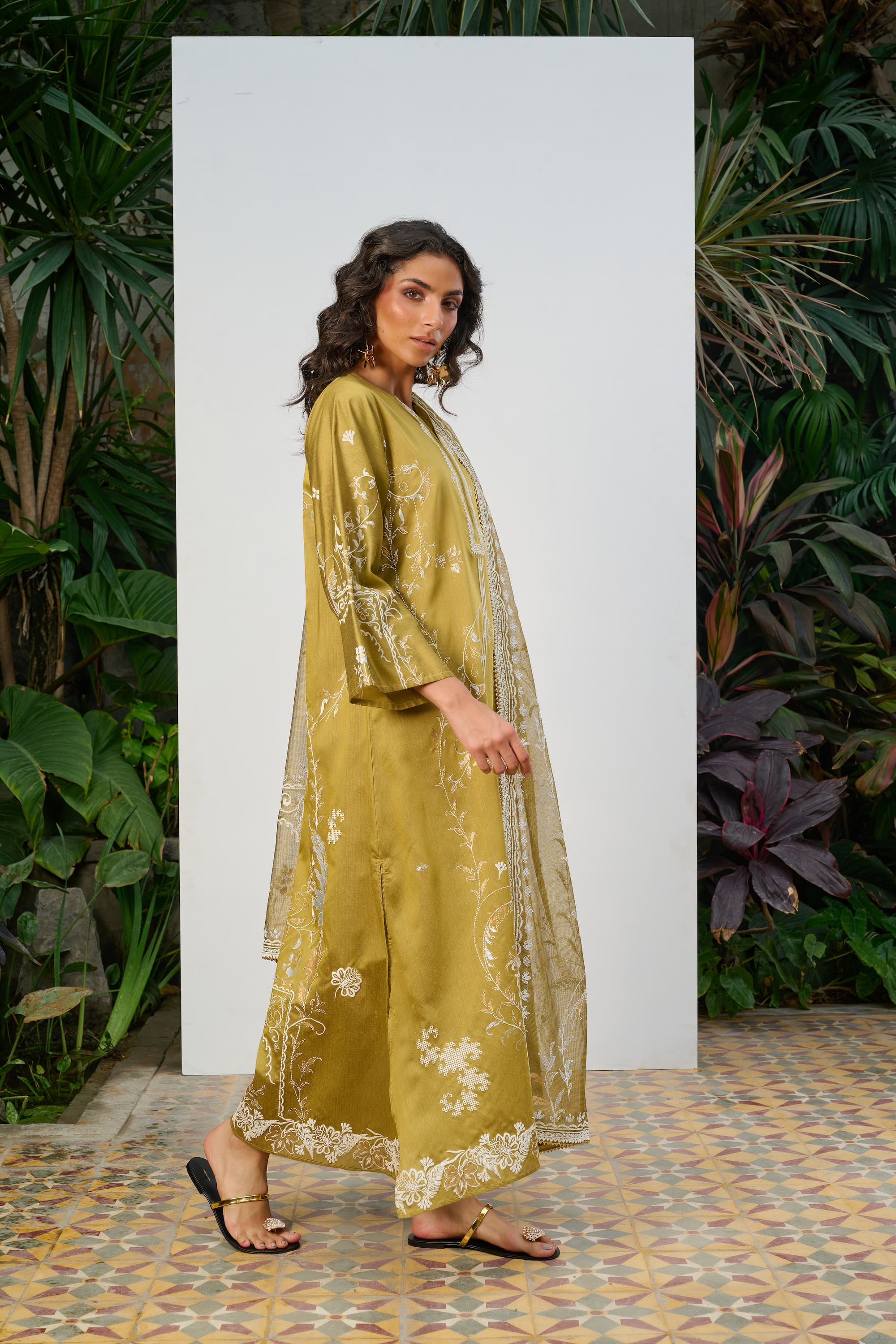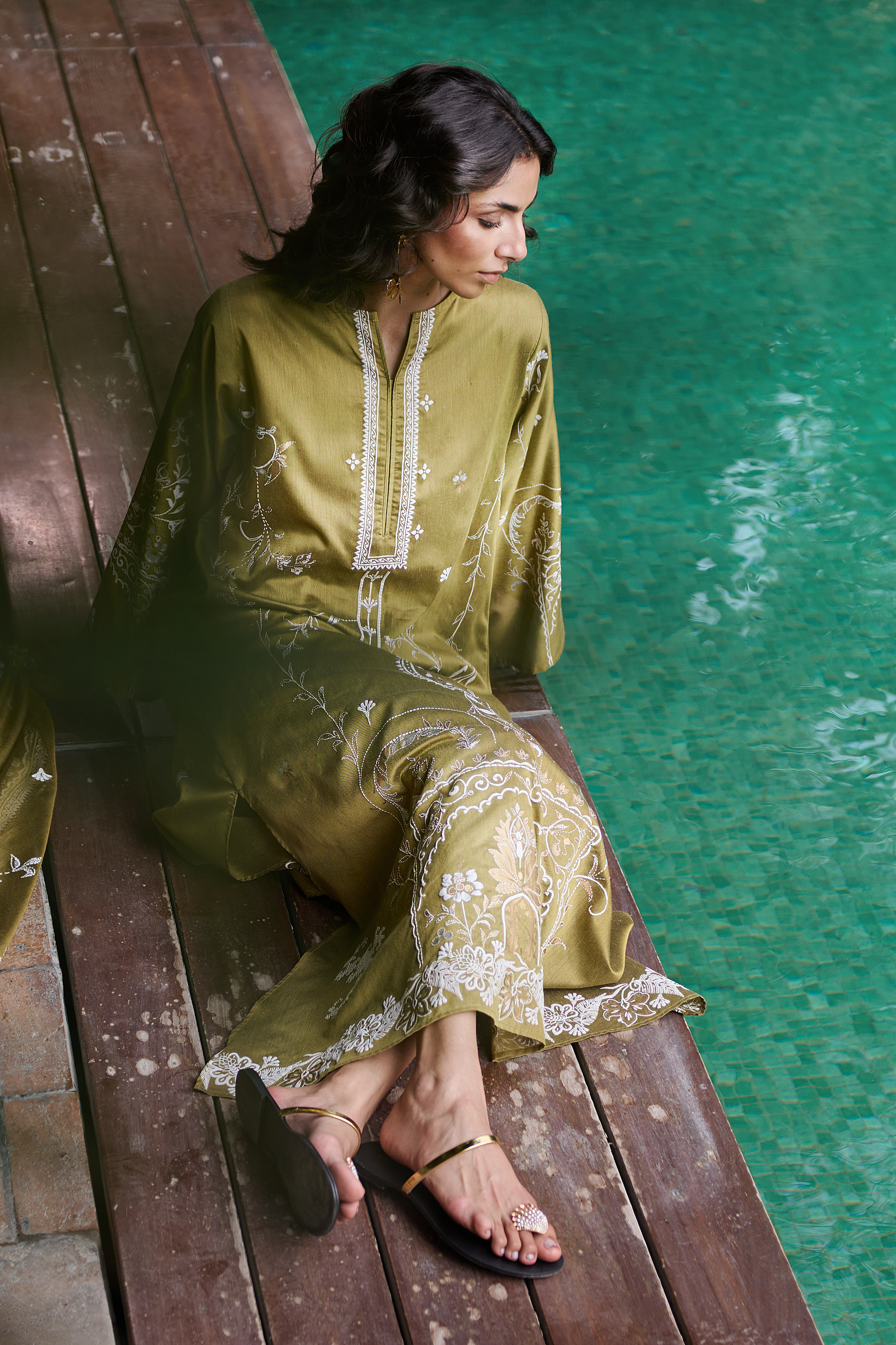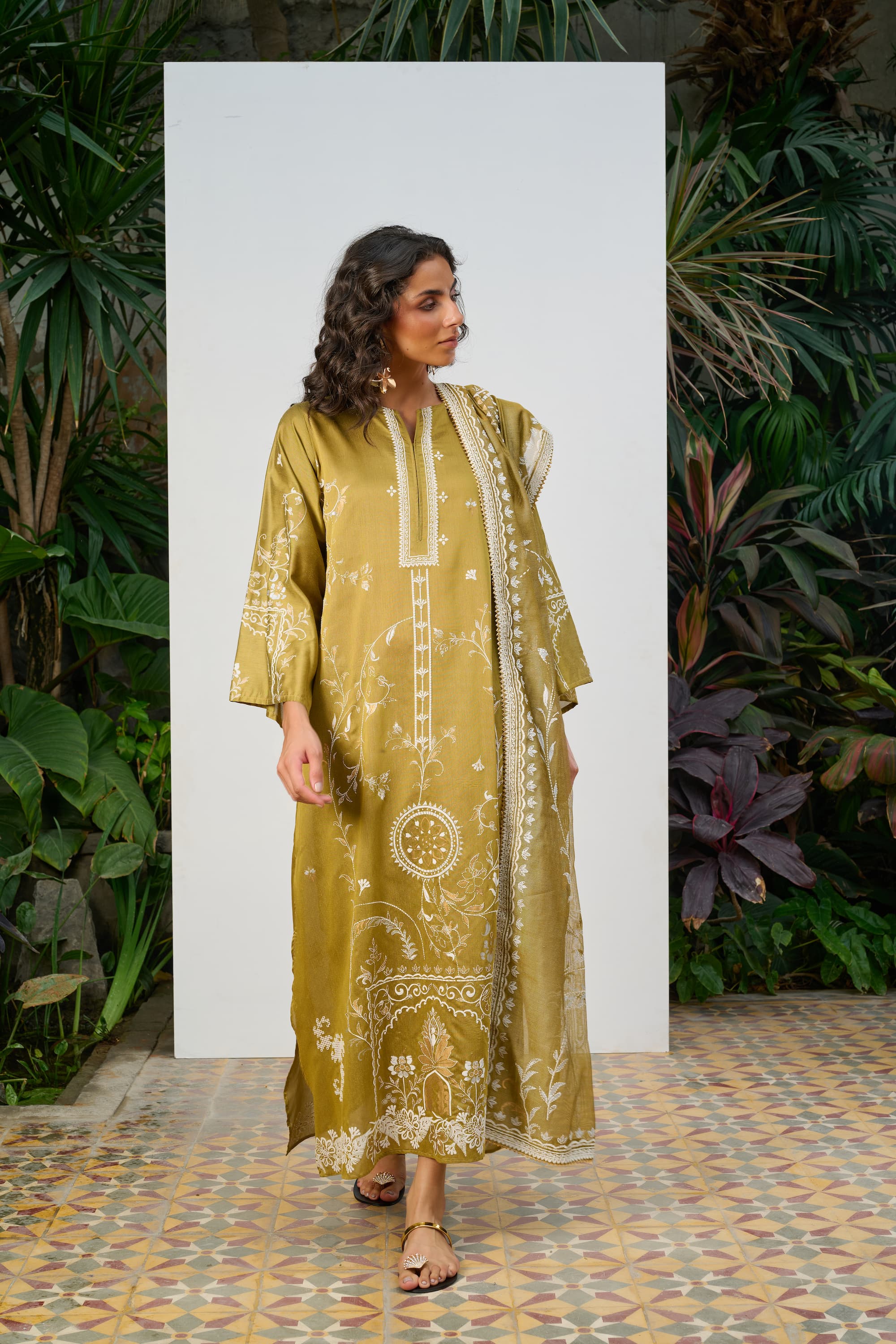 Elegant and festive, this olive green full-length set is a timeless blend of grace and craftsmanship. Beautifully designed and meticulously hand screen printed in refined shades of gold, silver, and off-white, the ensemble exudes a soft, luminous charm perfect for special occasions.
