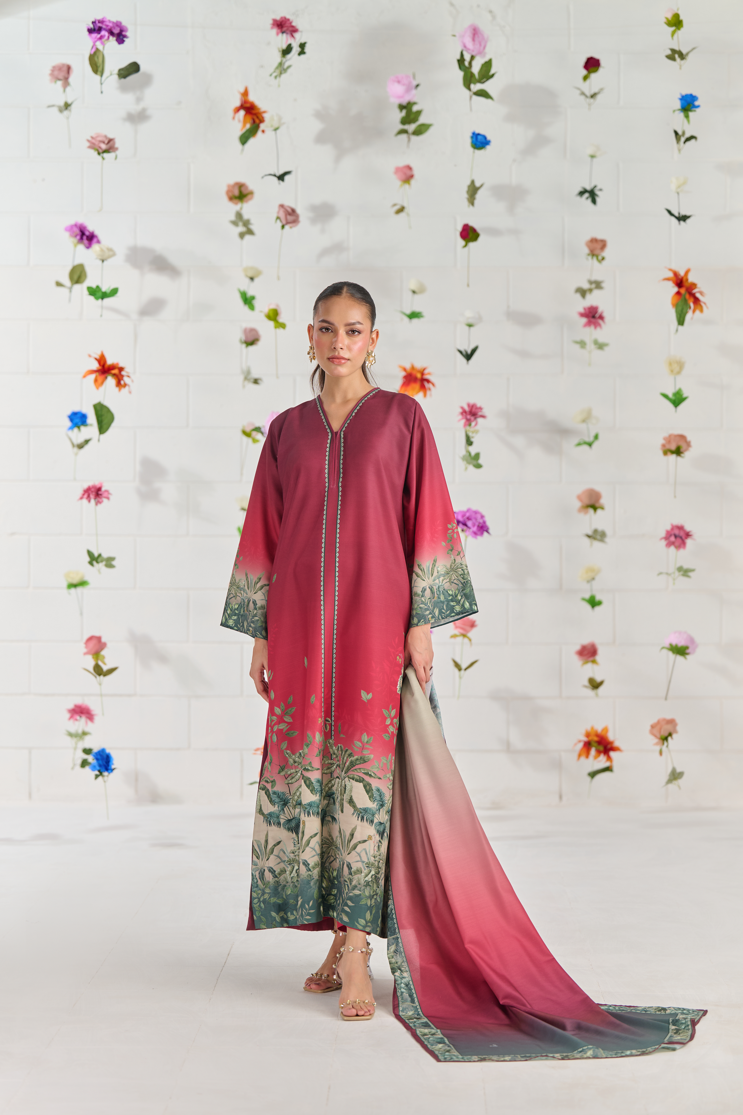Color: A rich mulberry red ombre base comes alive with a vibrant tropical print, blending deep hues with lively island-inspired patterns.