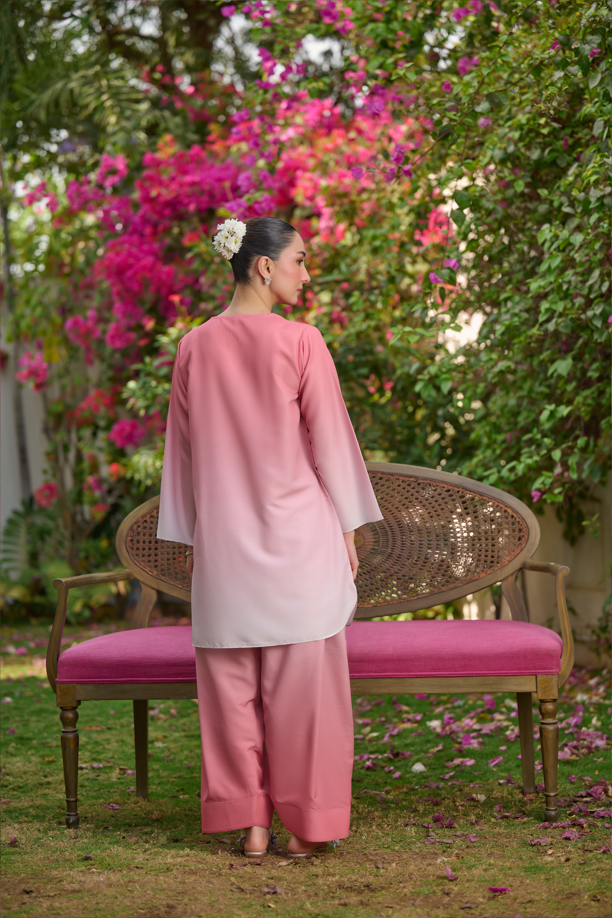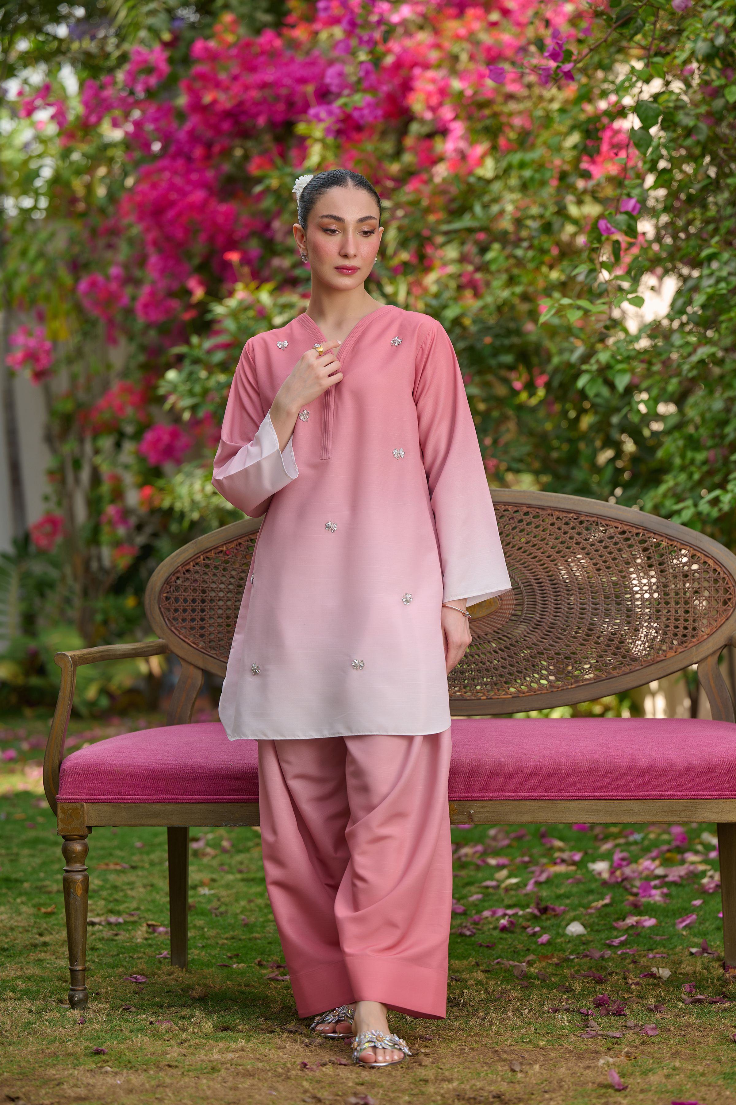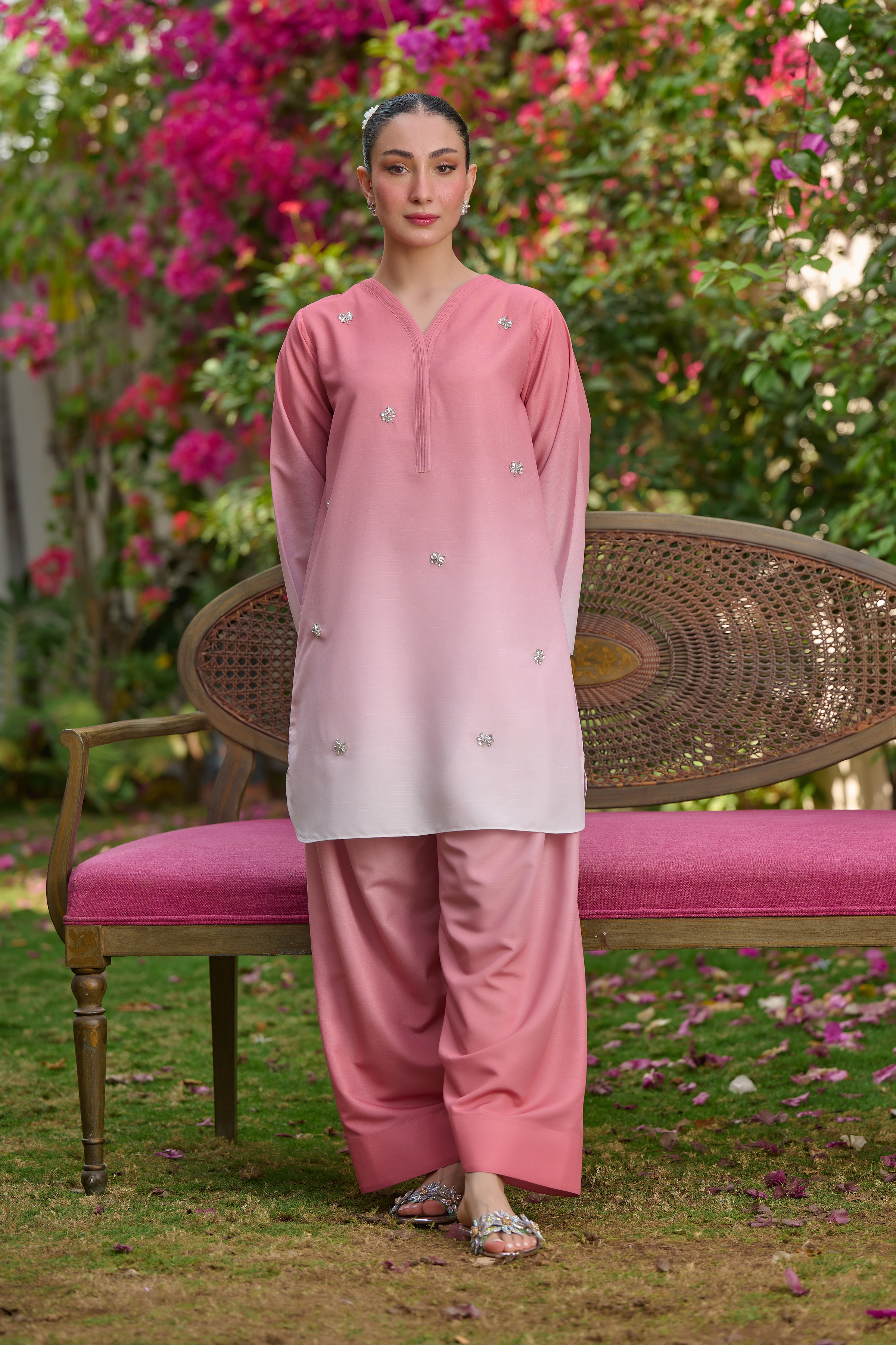 Description: Drape yourself in Coral Pink Ombre set– a classic outfit that speaks volumes in style.