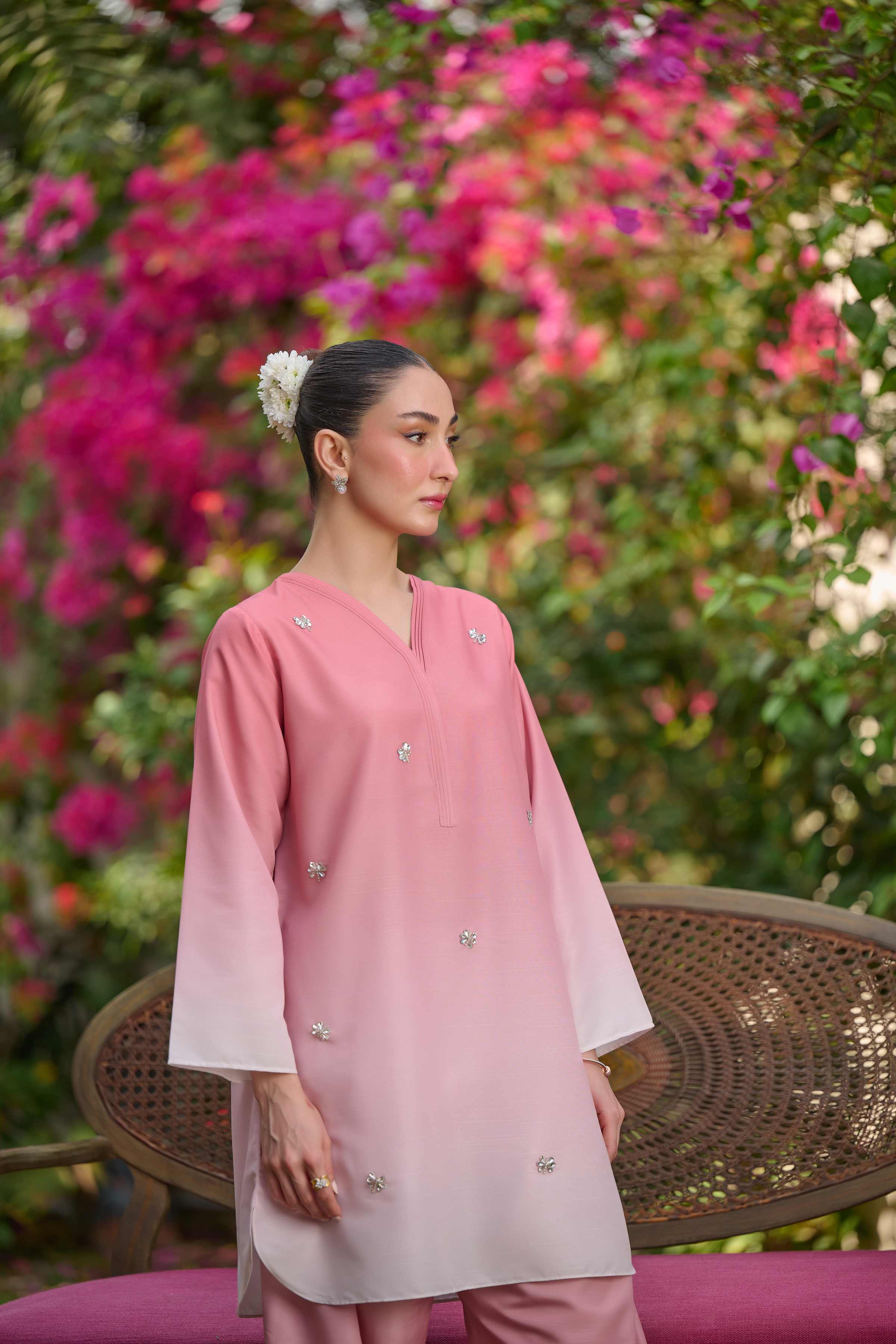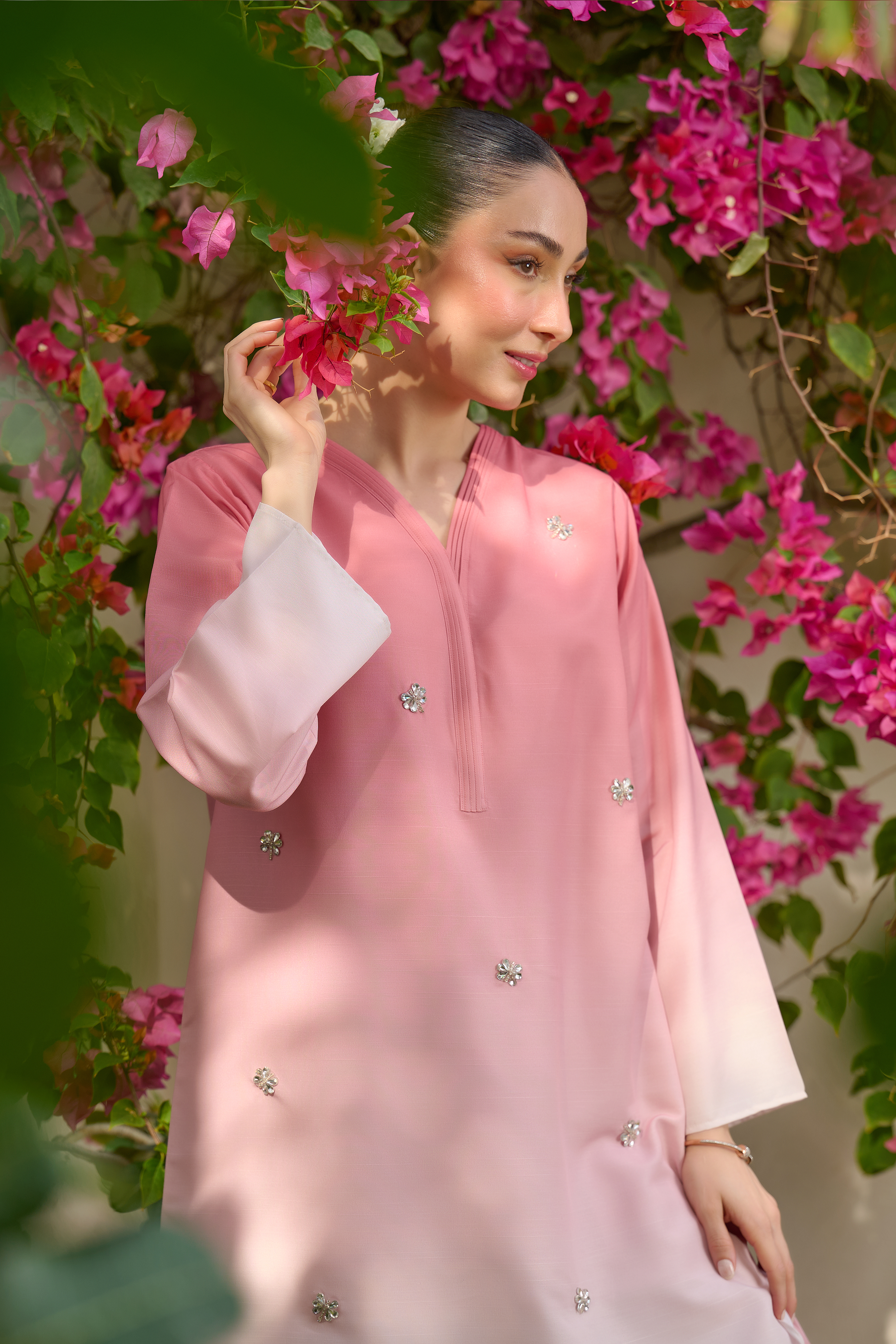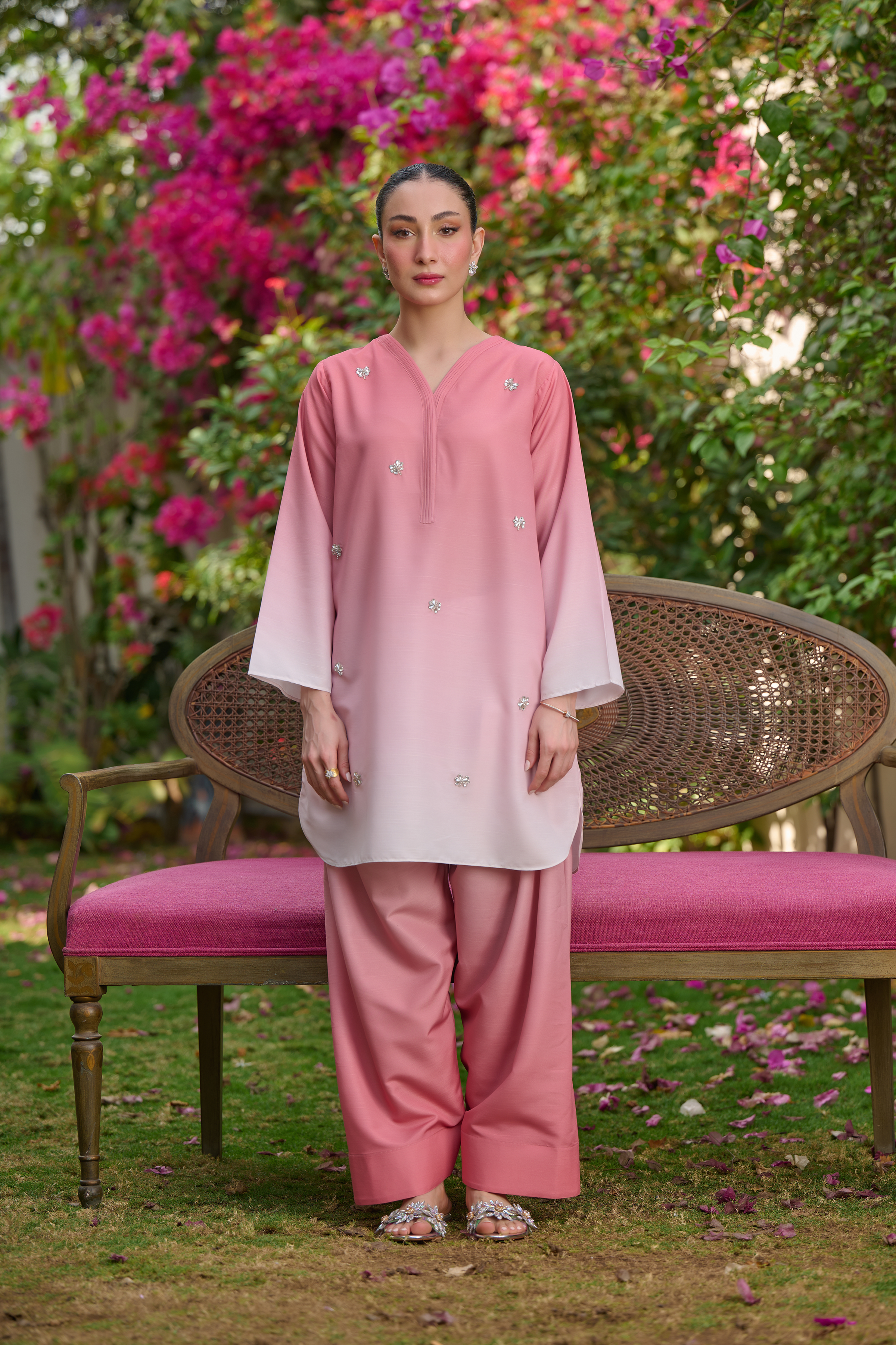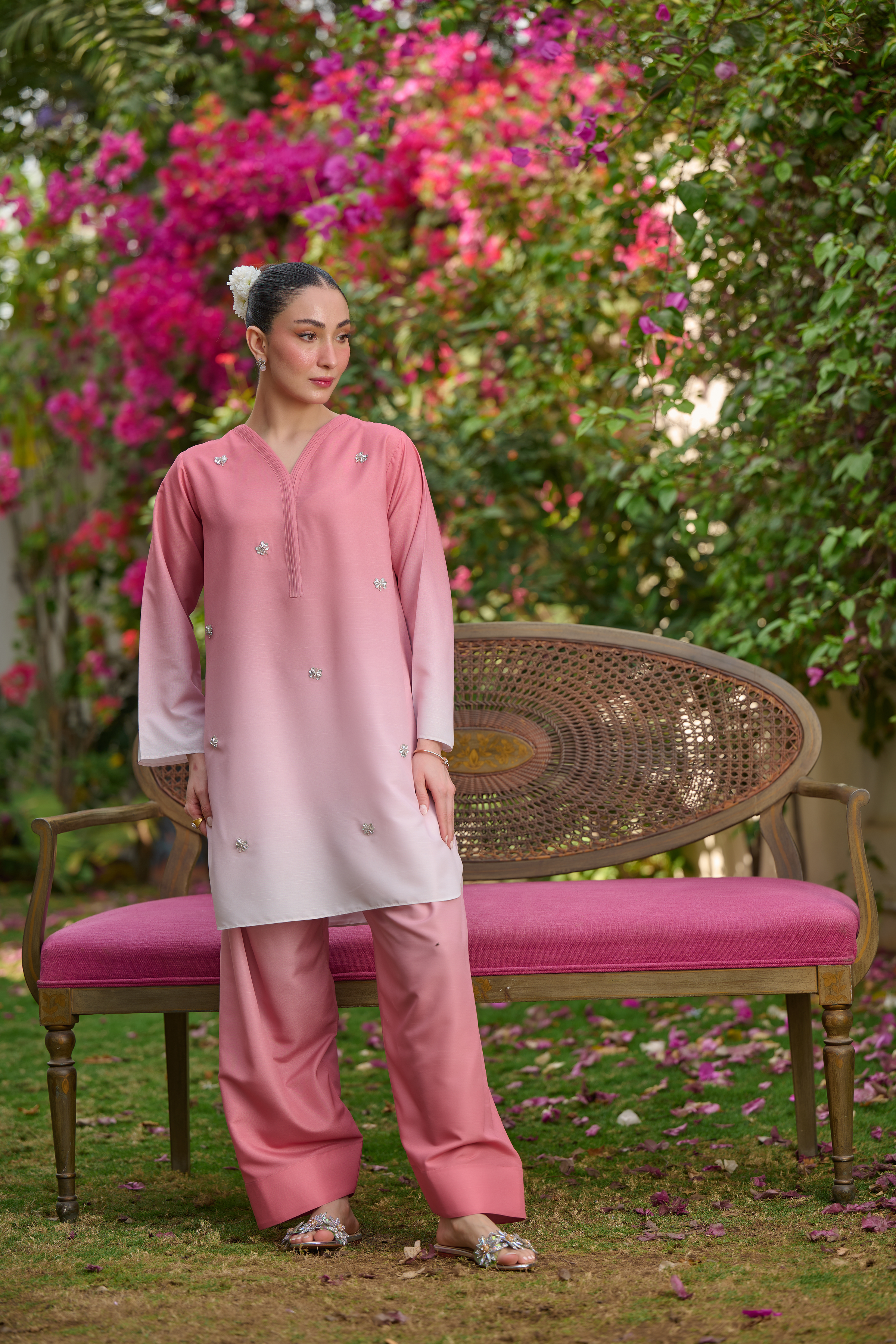 Description: Drape yourself in Coral Pink Ombre set– a classic outfit that speaks volumes in style.