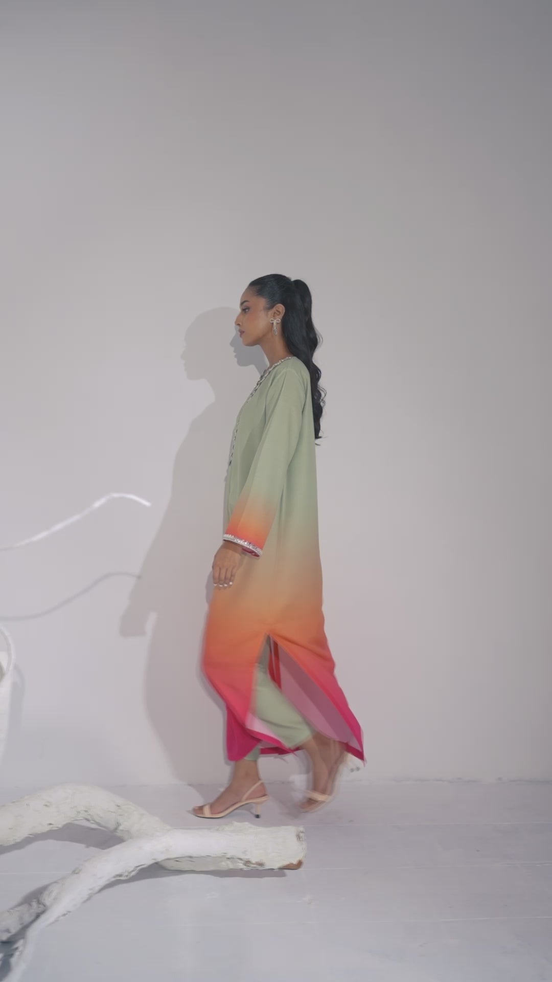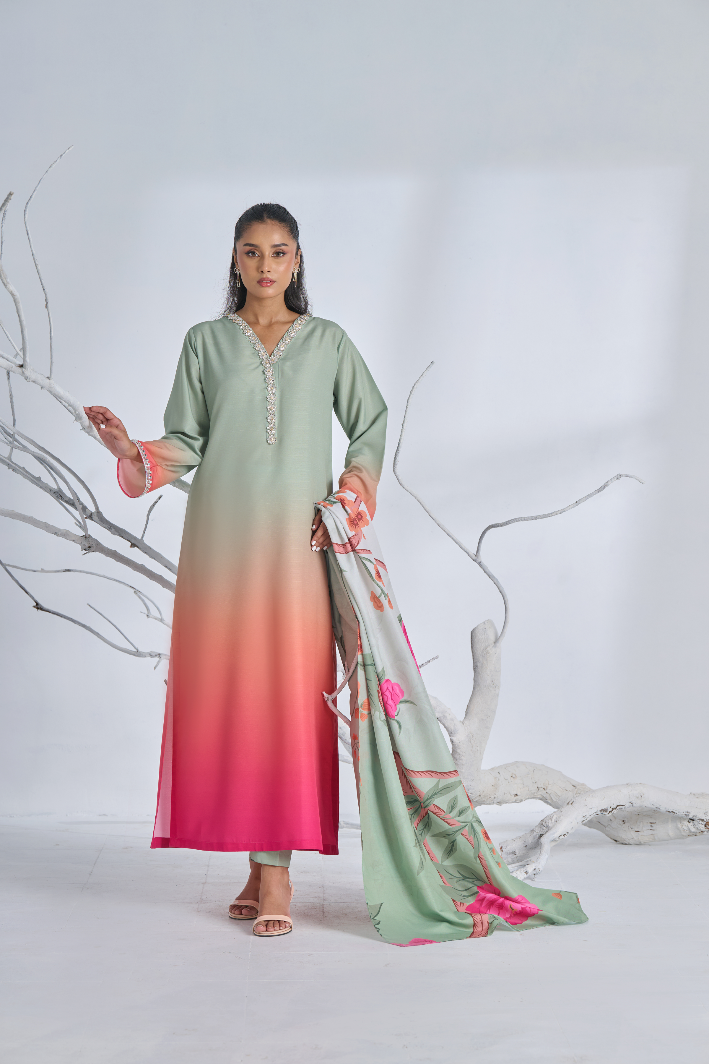 Description: Drape yourself in Pistachio and Pink Ombre set– a classic outfit that speaks volumes in style.