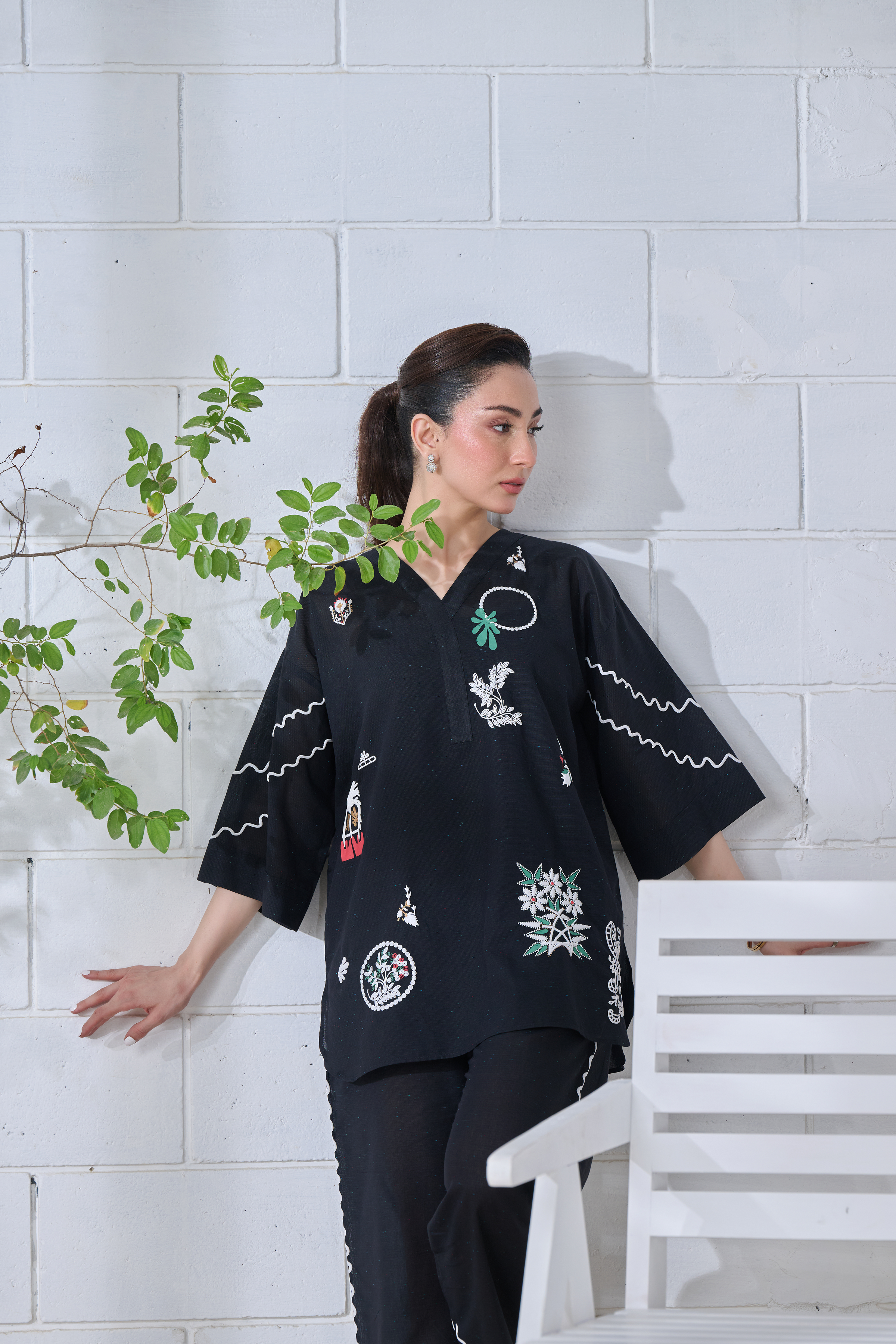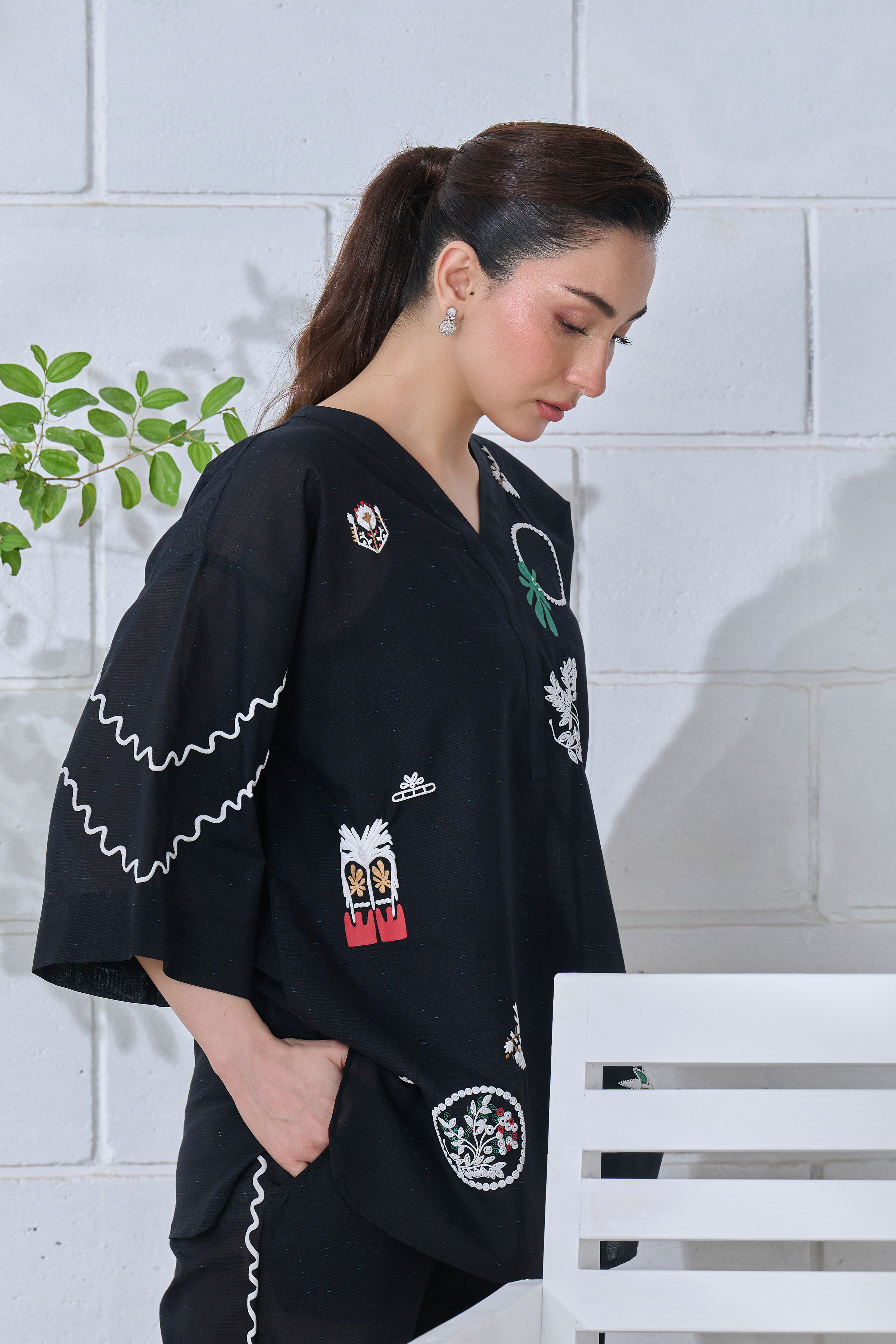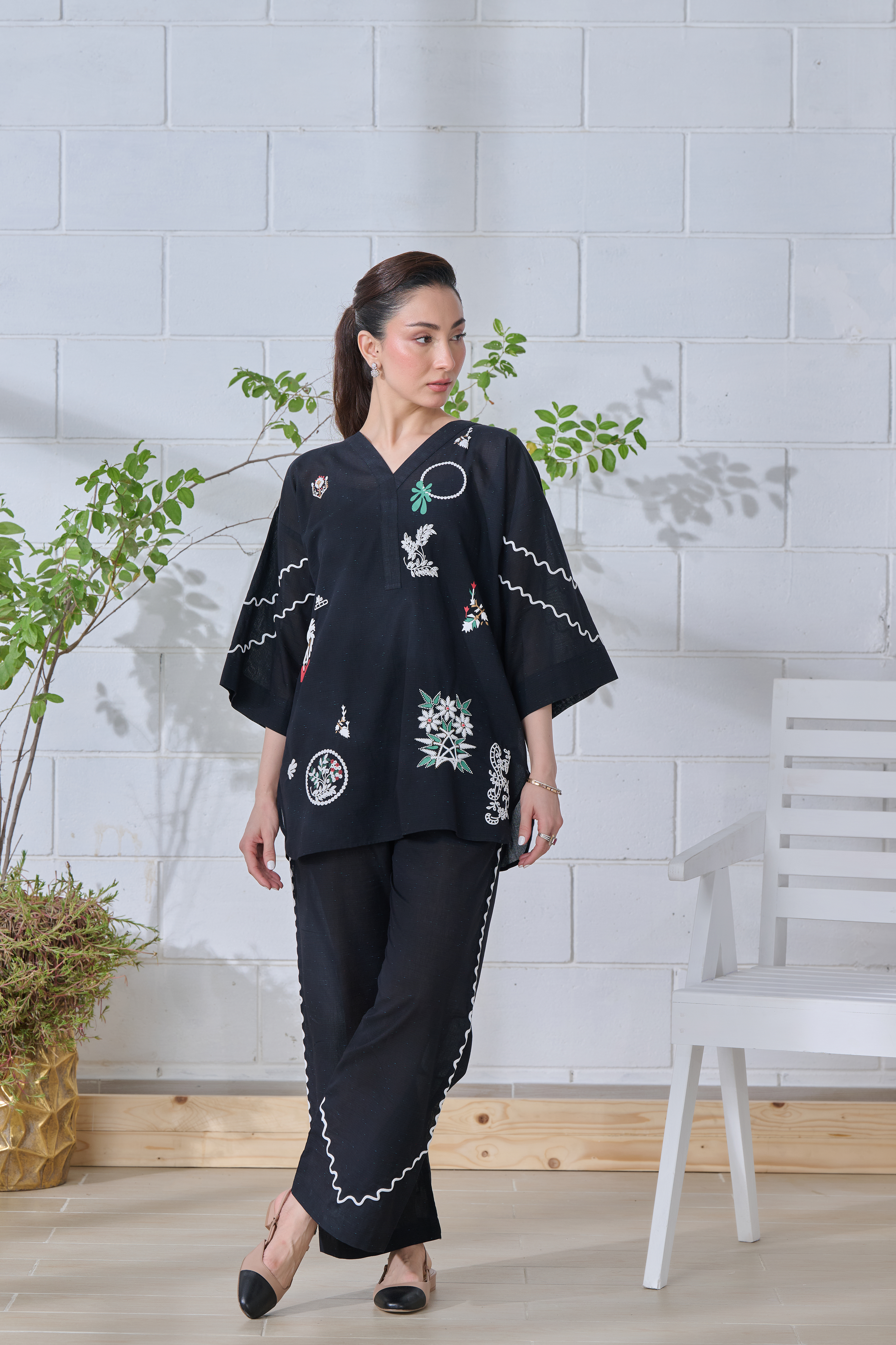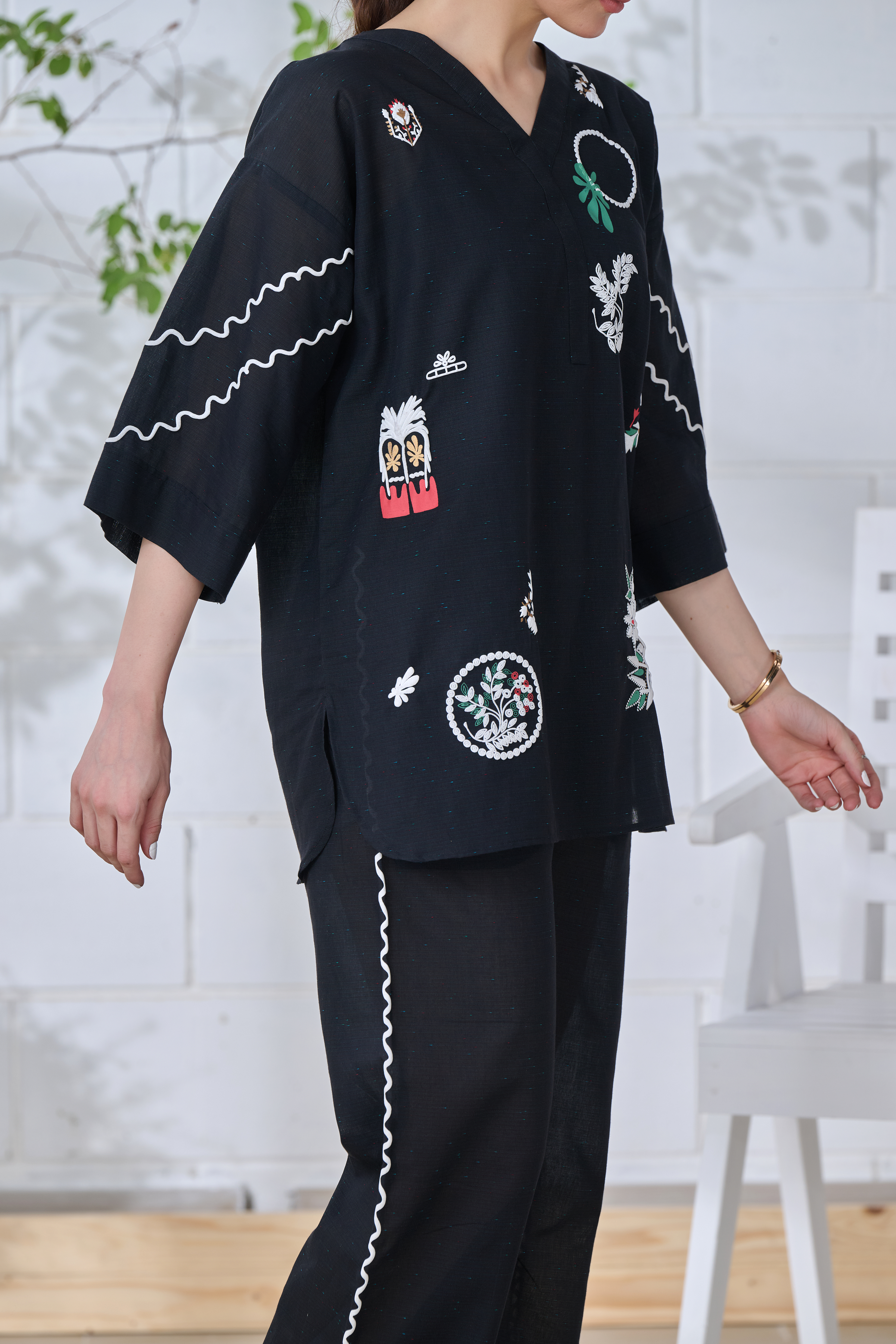 Description: This black ensemble blends tradition with modern ease. Intricate off-white and multicolored prints—some flat, some embossed—bring together symbols, florals, and abstract forms, telling a quiet story on soft fabric. The relaxed silhouette, with its flowing sleeves and scalloped pant edges, offers comfort without compromising style. Thoughtfully designed for the modern woman, it’s a look that moves effortlessly from everyday moments to something a little more special—where heritage meets a fresh perspective.