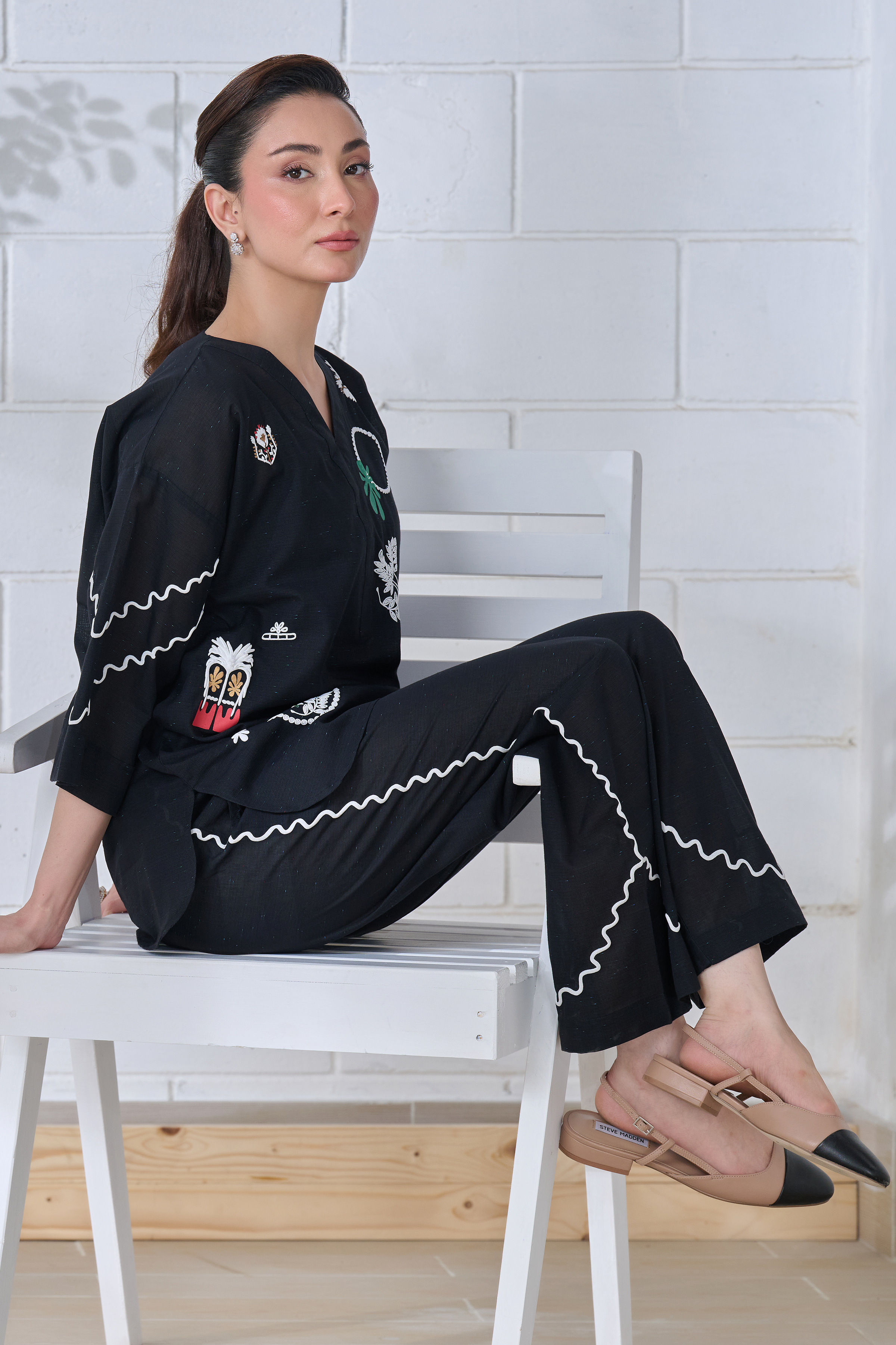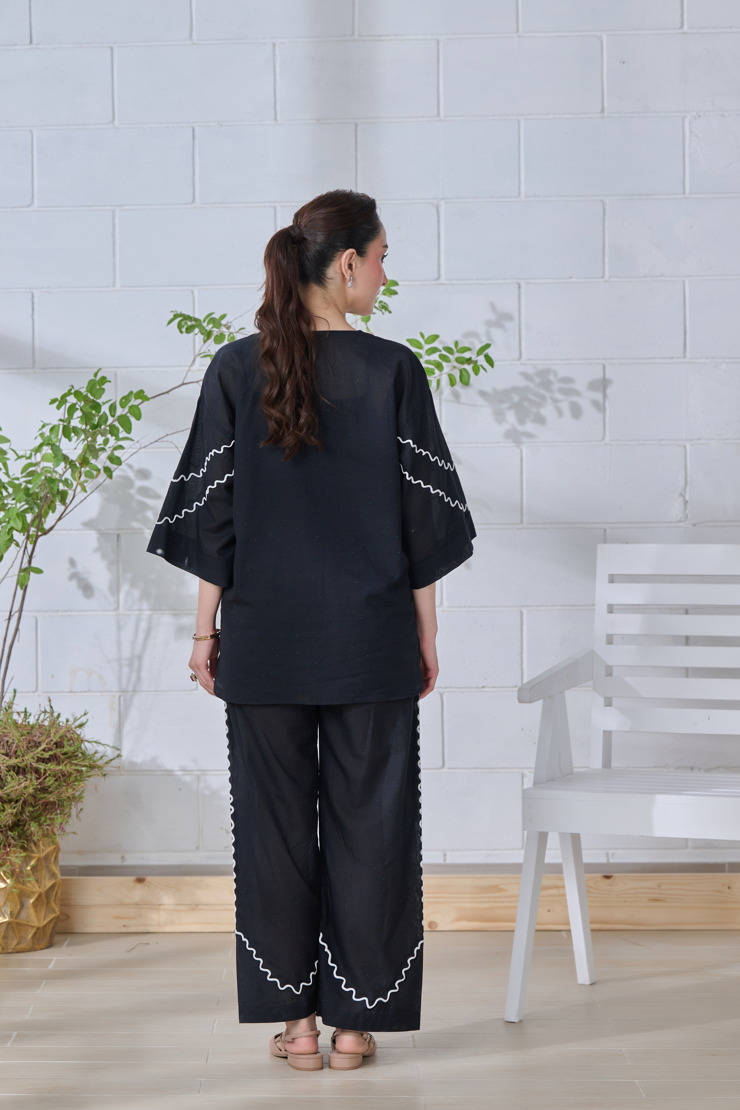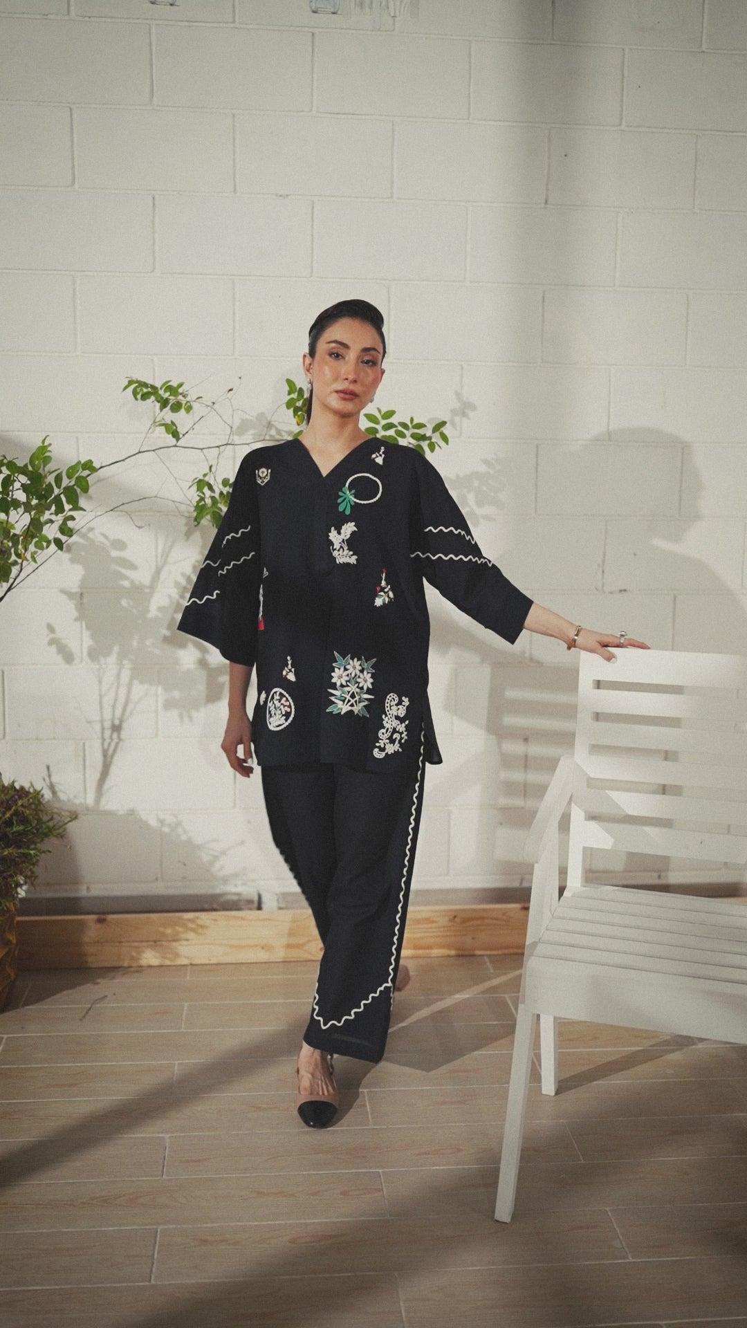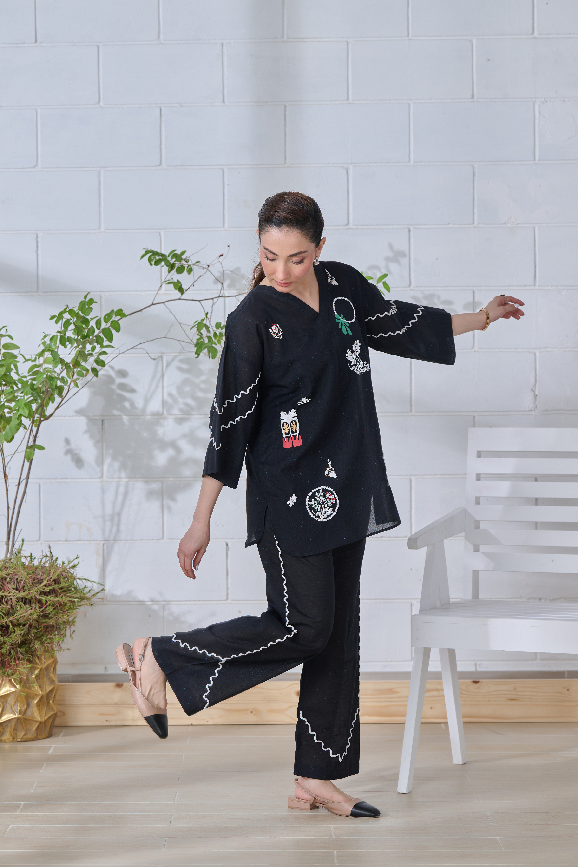 Description: This black ensemble blends tradition with modern ease. Intricate off-white and multicolored prints—some flat, some embossed—bring together symbols, florals, and abstract forms, telling a quiet story on soft fabric. The relaxed silhouette, with its flowing sleeves and scalloped pant edges, offers comfort without compromising style. Thoughtfully designed for the modern woman, it’s a look that moves effortlessly from everyday moments to something a little more special—where heritage meets a fresh perspective.