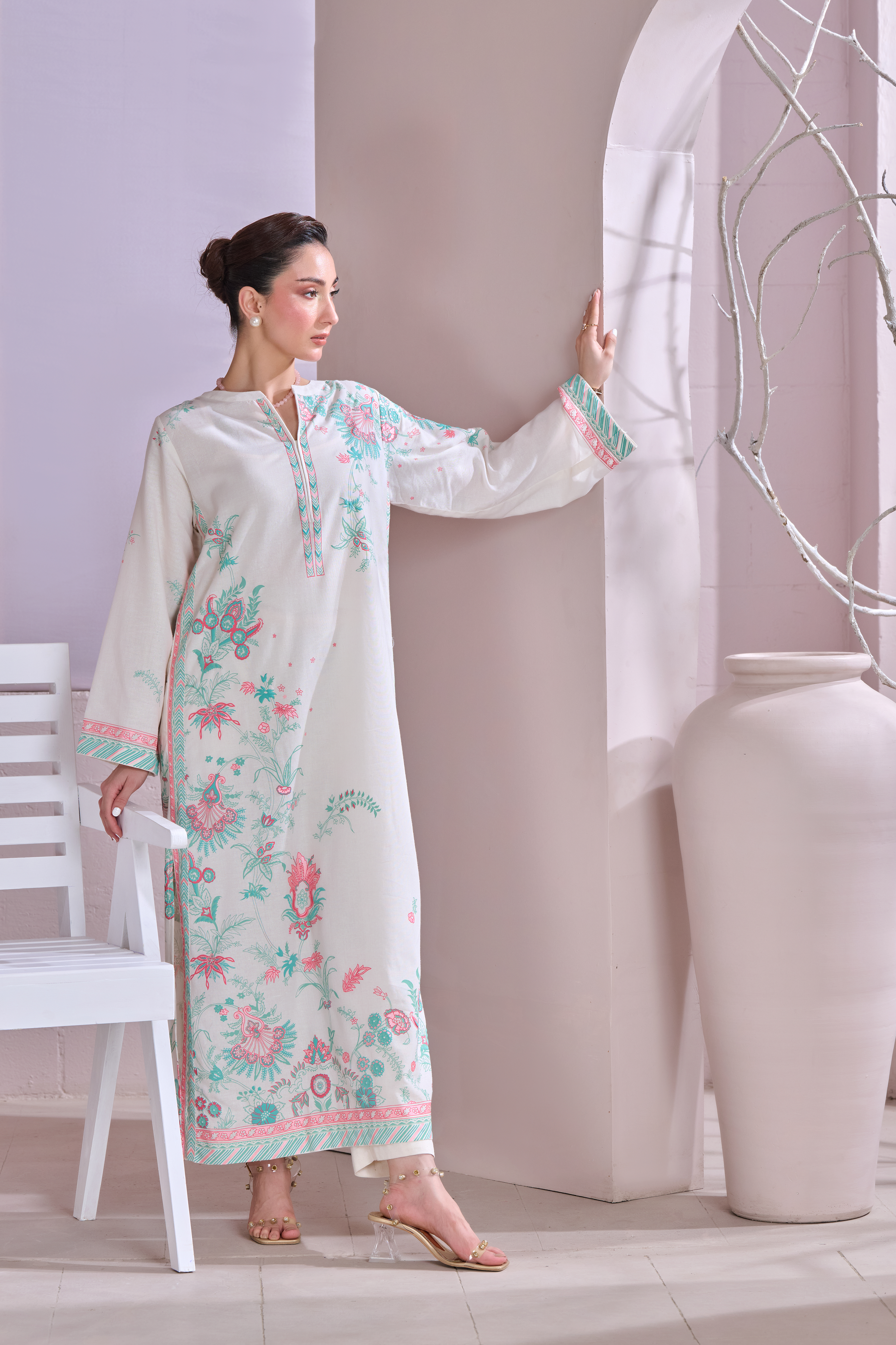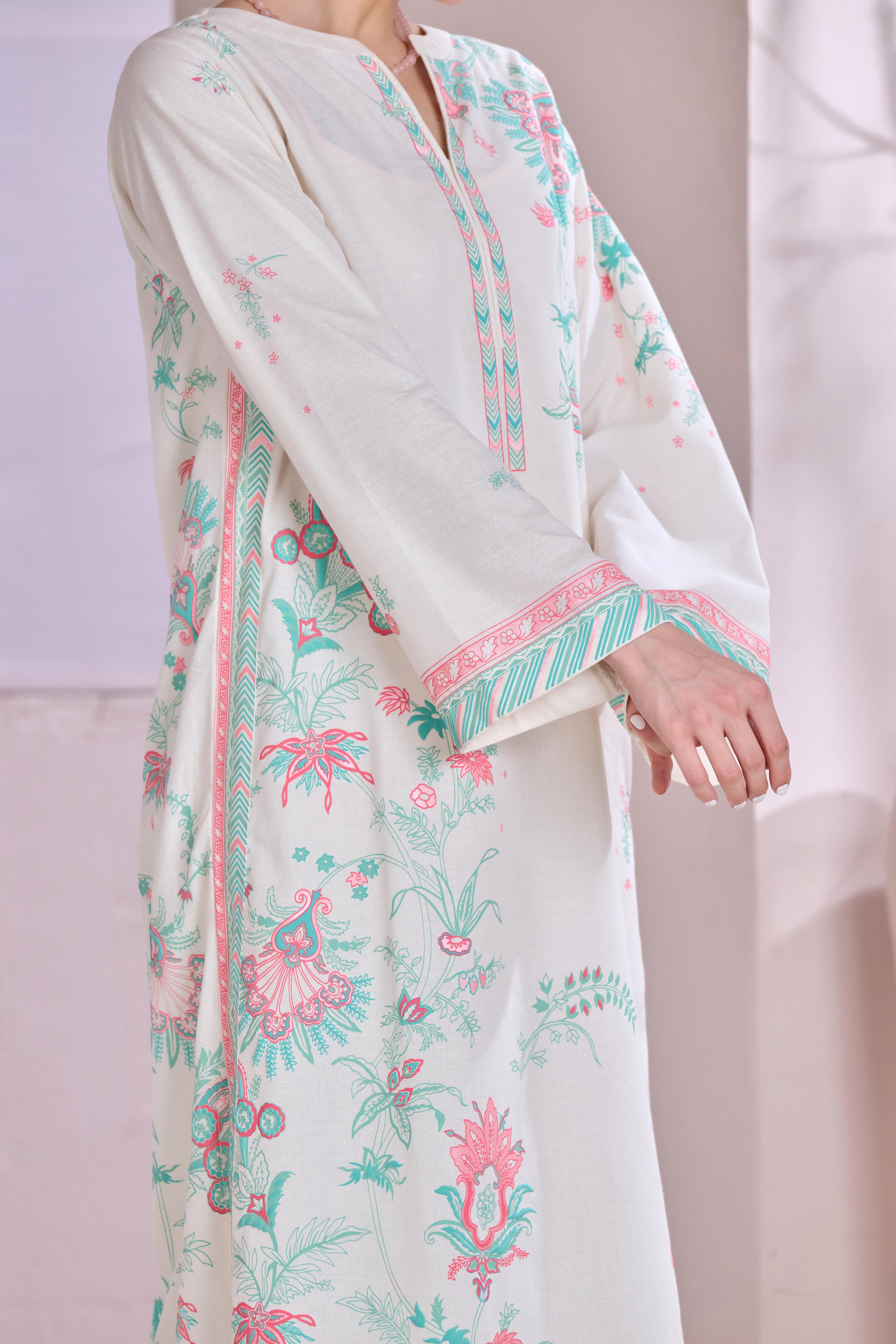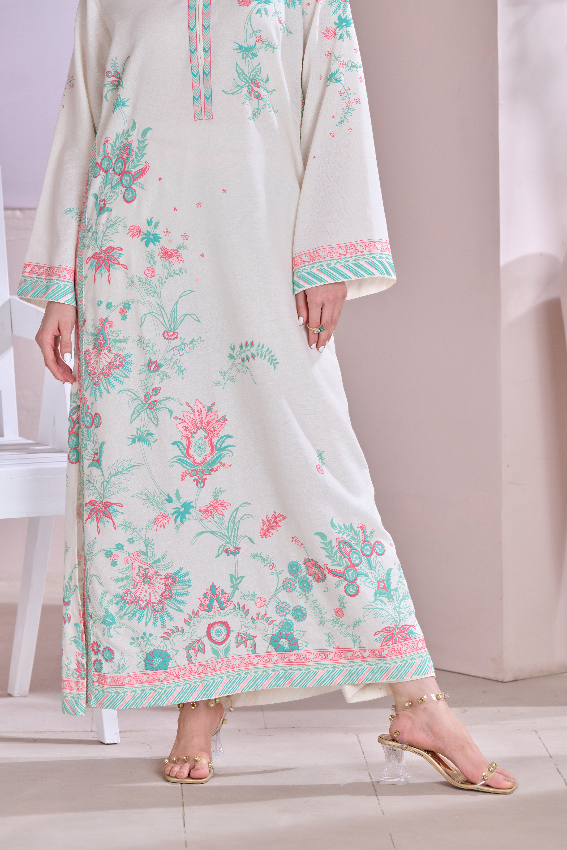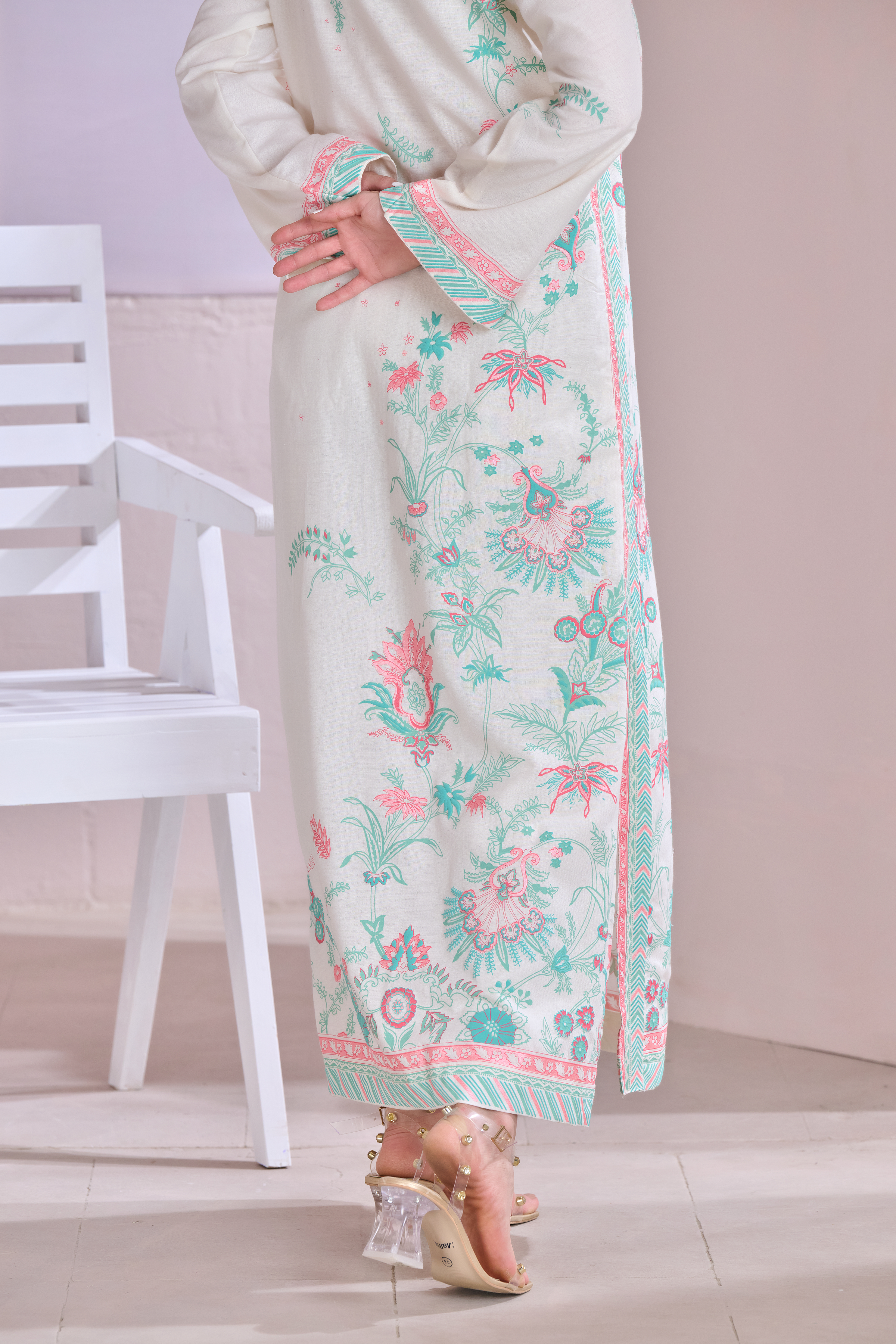 Description: This off-white kaftan shirt features a traditional chintz-inspired print in fresh neon tones. The delicate floral patterns in shades of pink and aqua create a soft yet striking contrast, adding a modern twist to a classic design. With a relaxed silhouette, this shirt offers comfort without compromising on style. The combination of flat and embossed screen printing techniques gives the fabric depth and texture, making the overall look both detailed and refined.