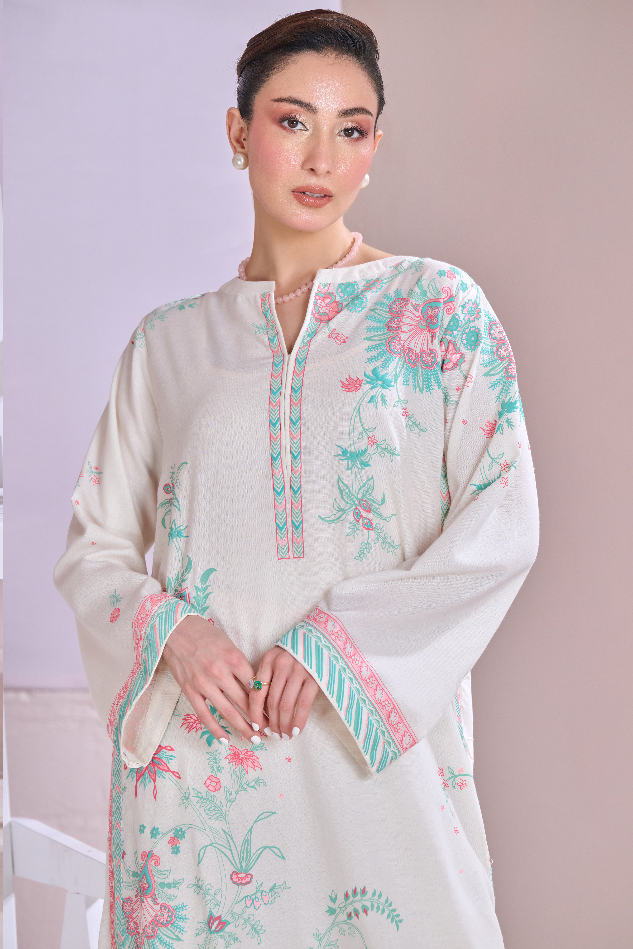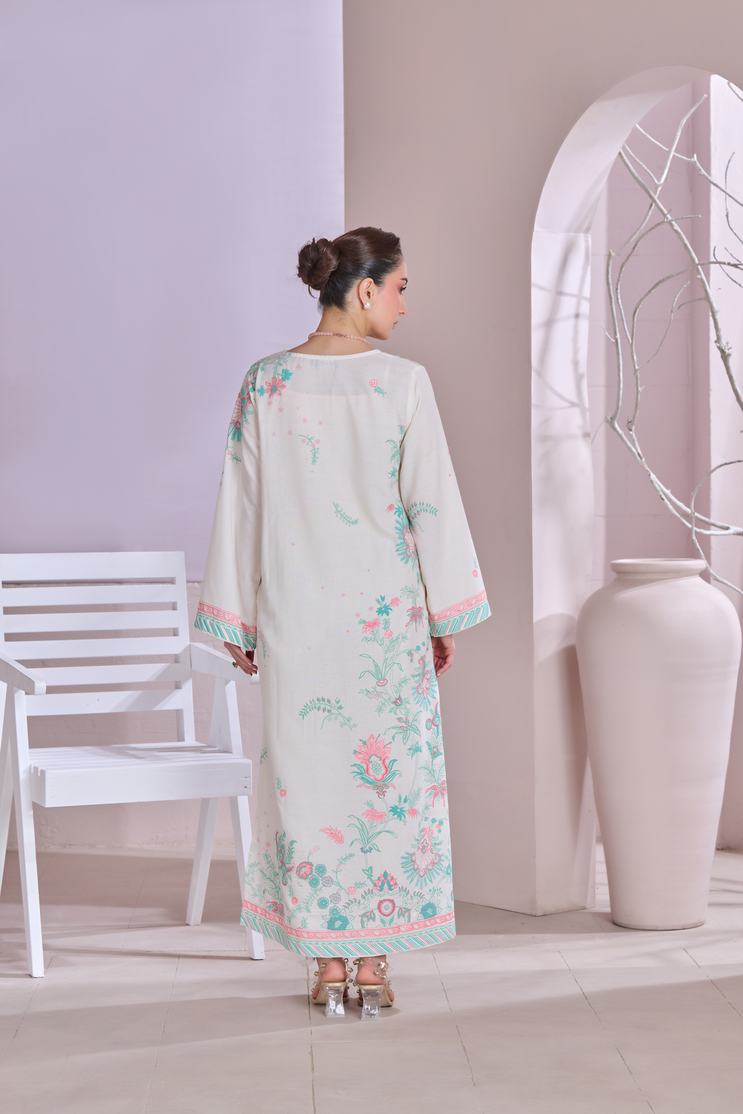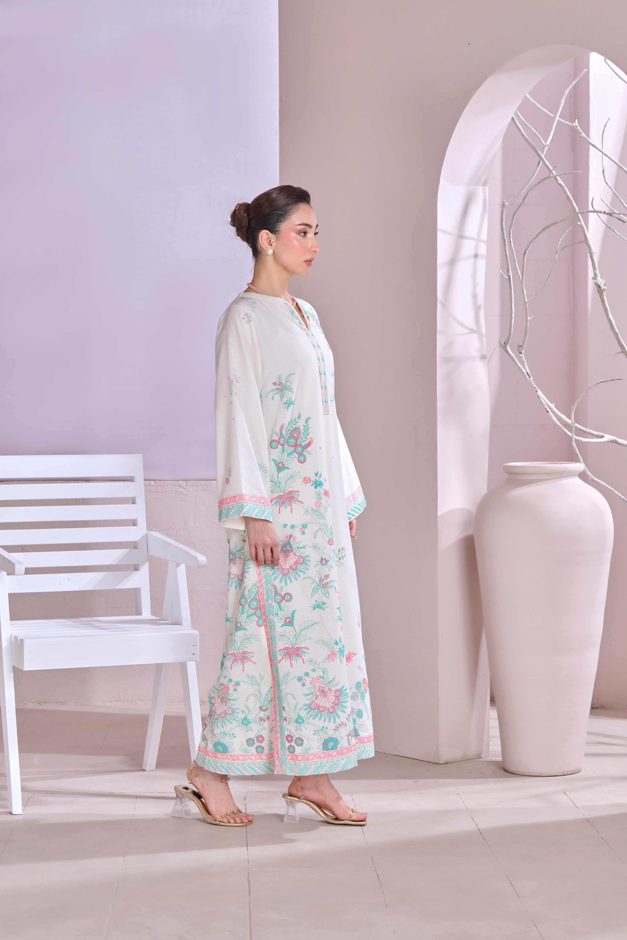 Description: This off-white kaftan shirt features a traditional chintz-inspired print in fresh neon tones. The delicate floral patterns in shades of pink and aqua create a soft yet striking contrast, adding a modern twist to a classic design. With a relaxed silhouette, this shirt offers comfort without compromising on style. The combination of flat and embossed screen printing techniques gives the fabric depth and texture, making the overall look both detailed and refined.