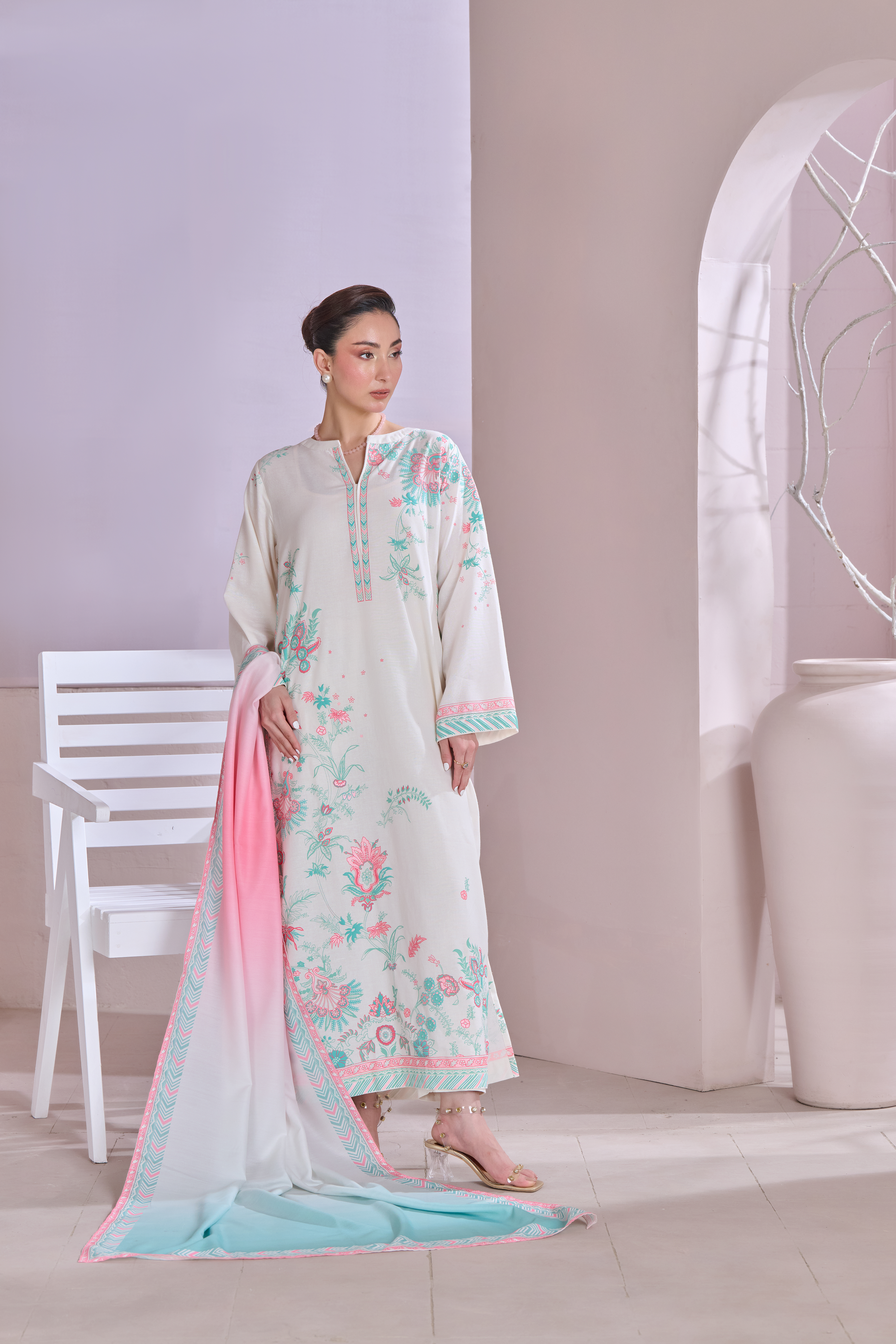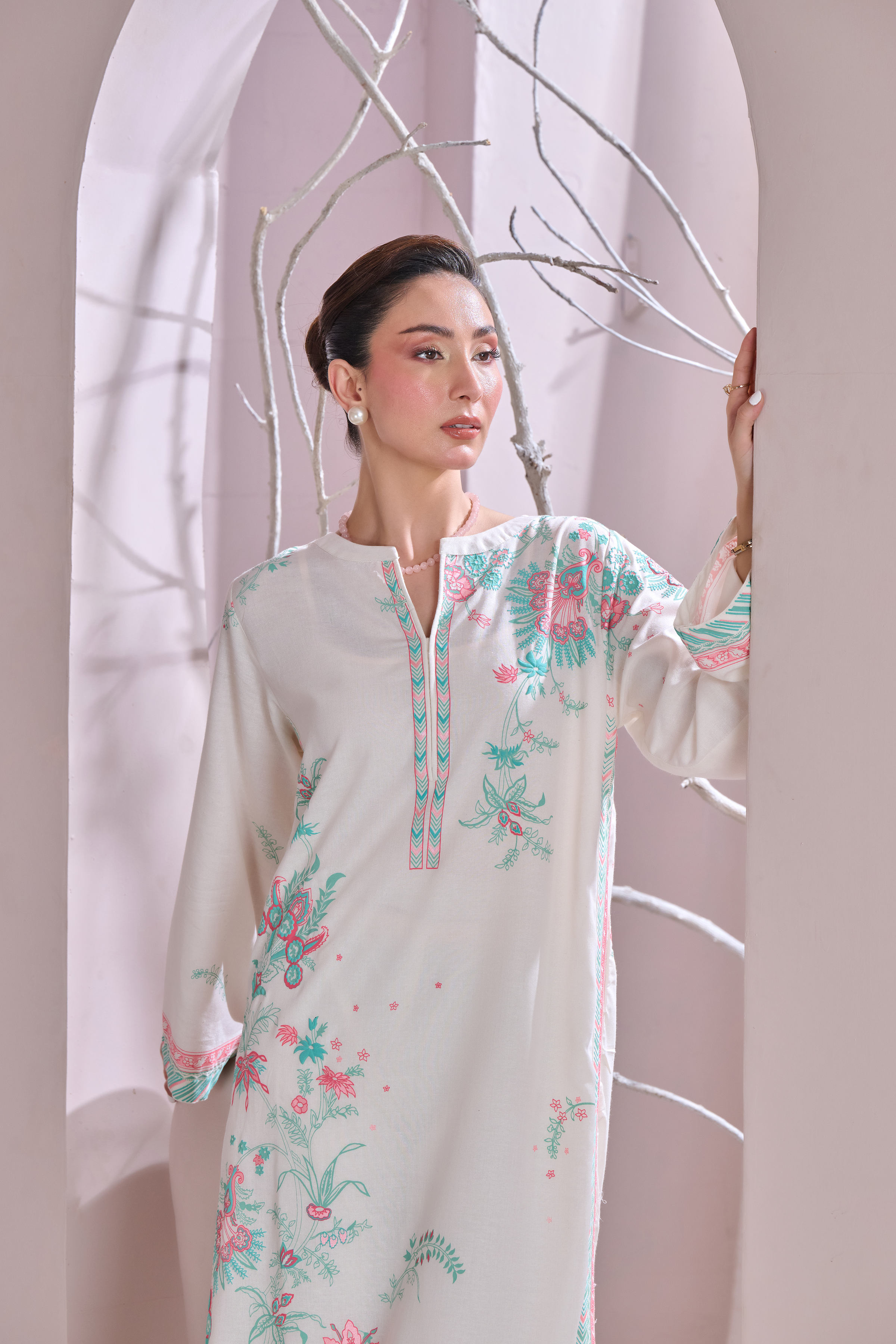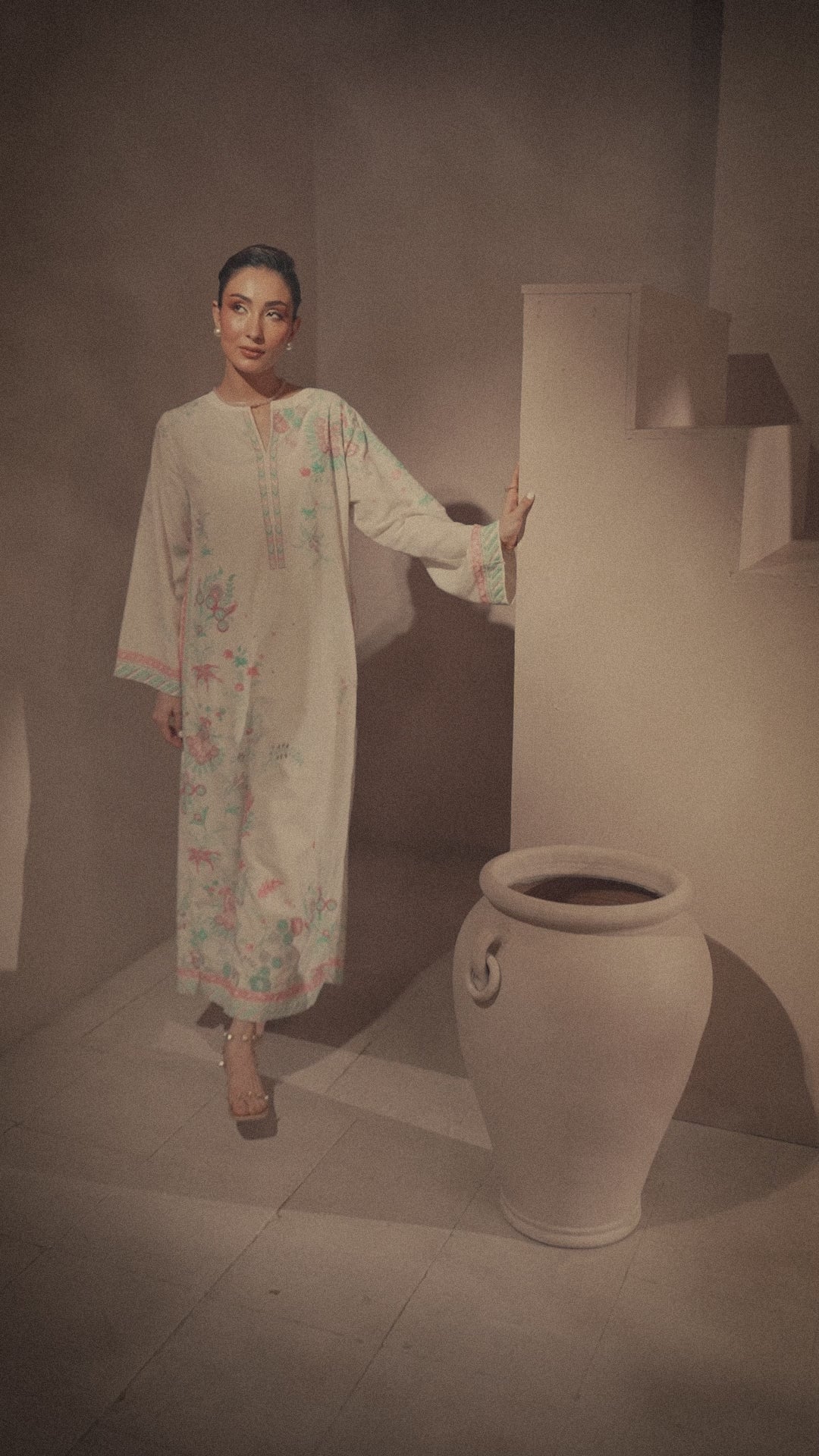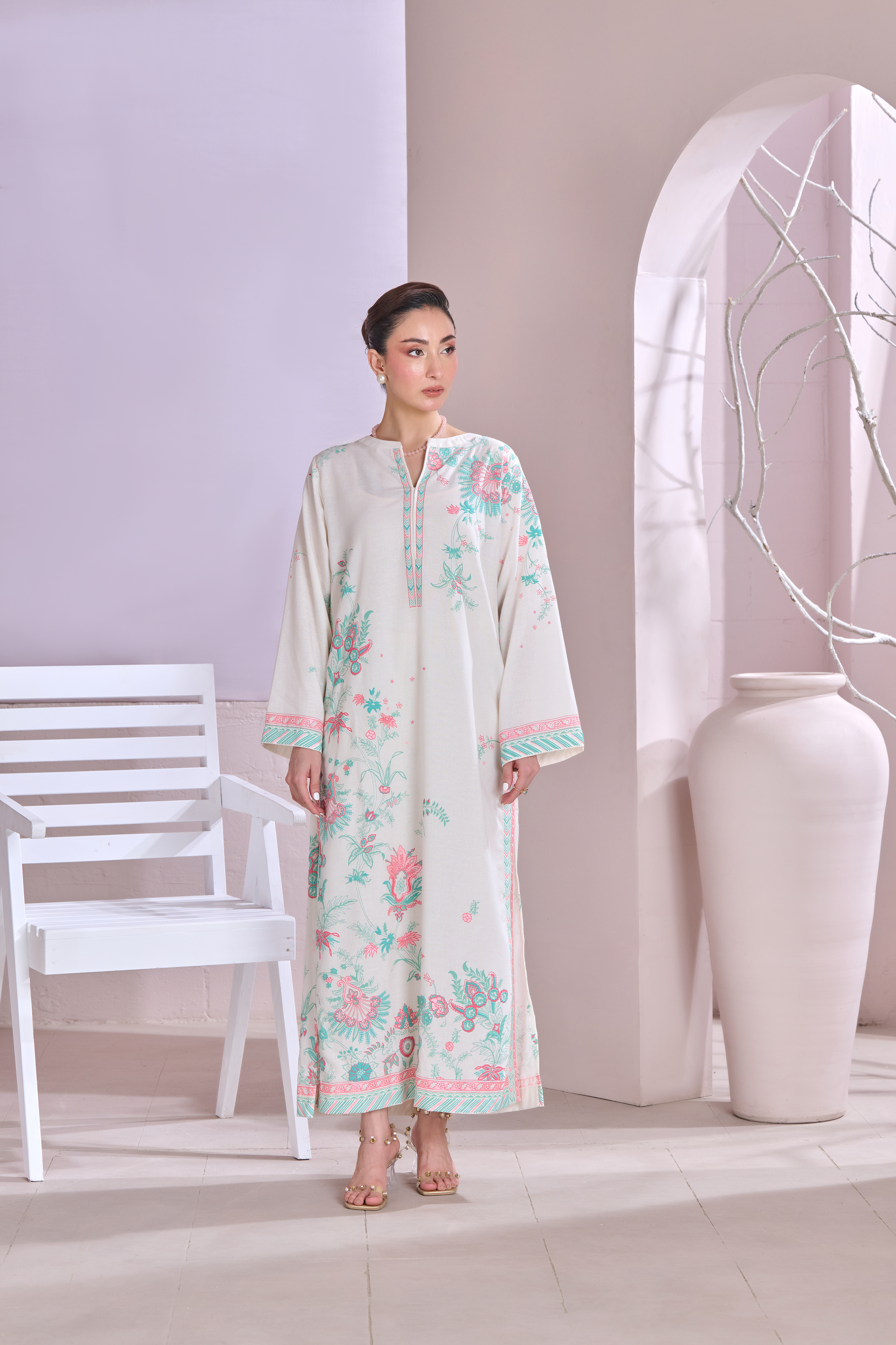 Description: This off-white kaftan shirt features a traditional chintz-inspired print in fresh neon tones. The delicate floral patterns in shades of pink and aqua create a soft yet striking contrast, adding a modern twist to a classic design. With a relaxed silhouette, this shirt offers comfort without compromising on style. The combination of flat and embossed screen printing techniques gives the fabric depth and texture, making the overall look both detailed and refined.