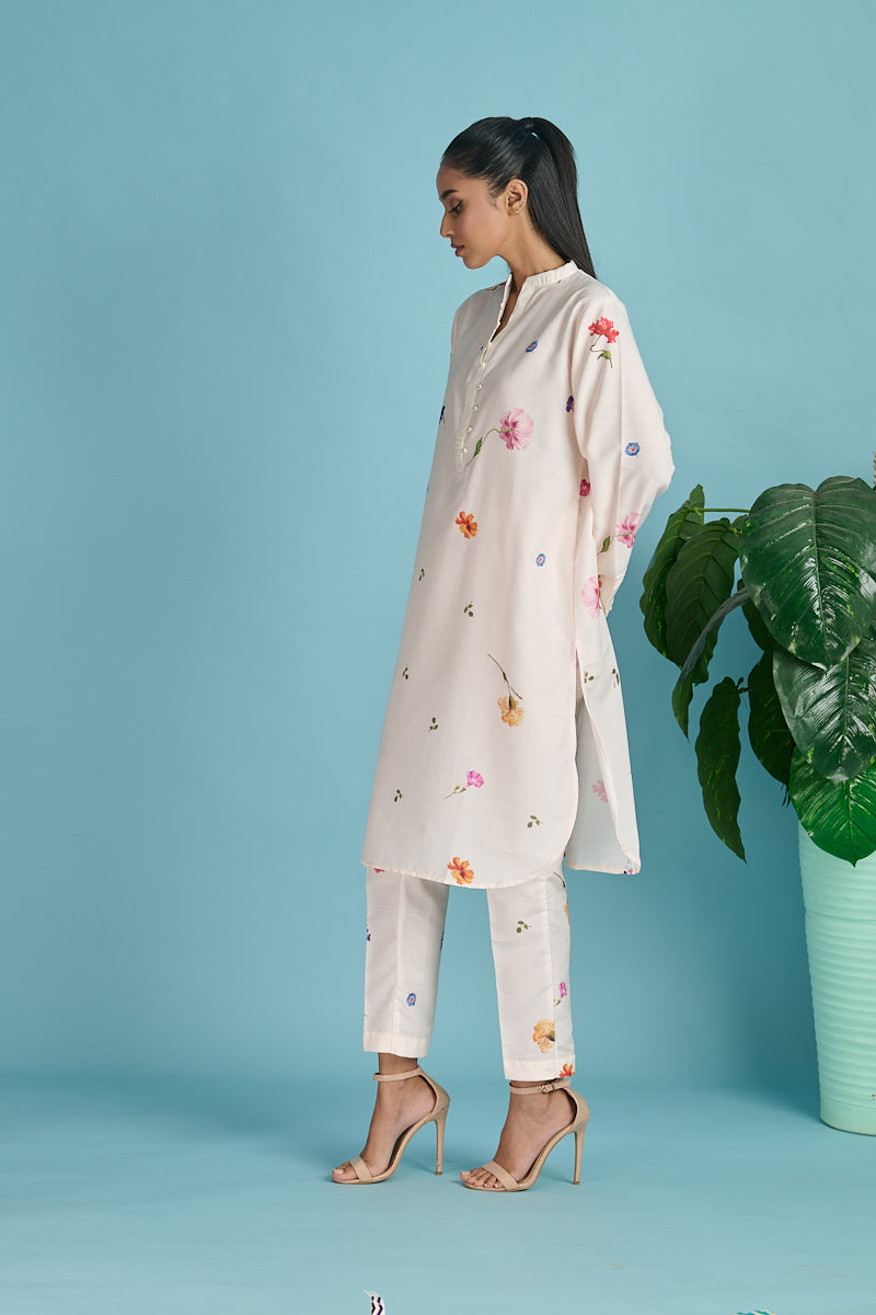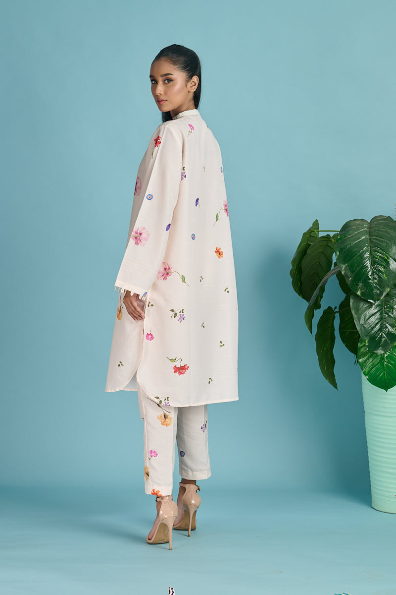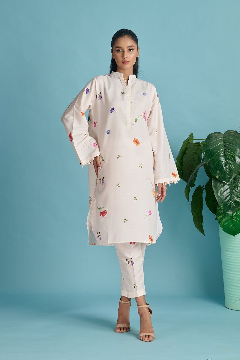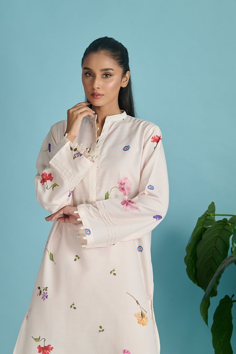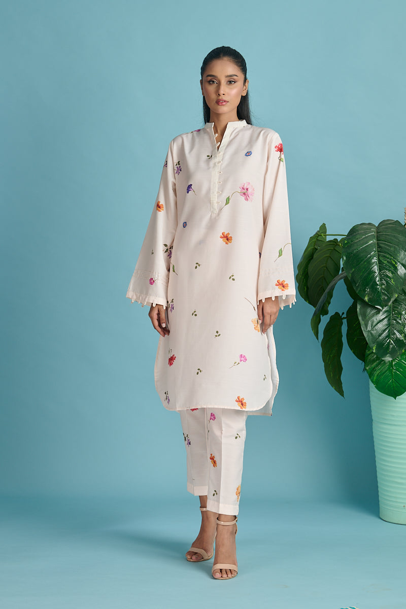 Embellishment: Digital printed set with pleated detailing on neck and sleeves.