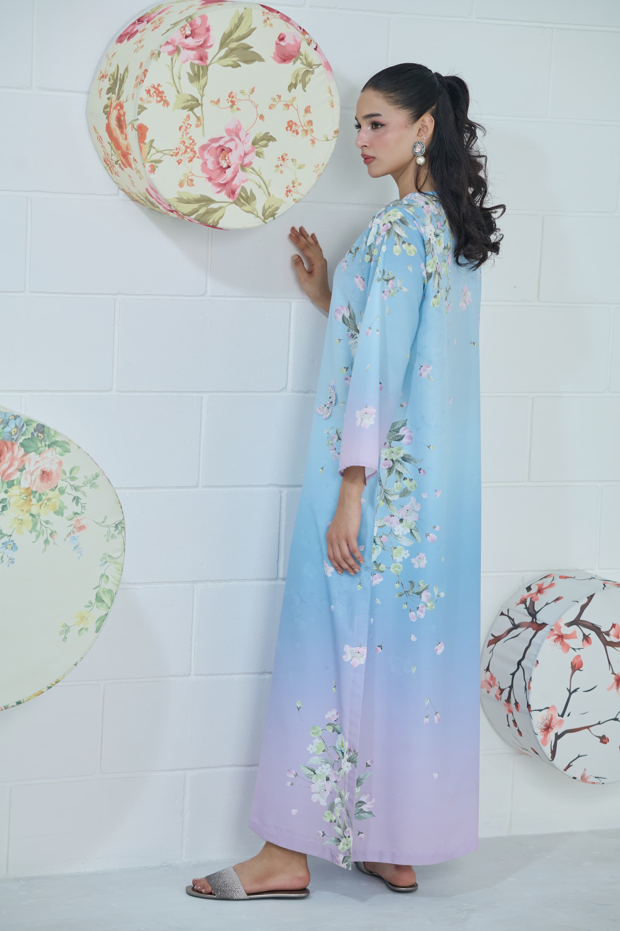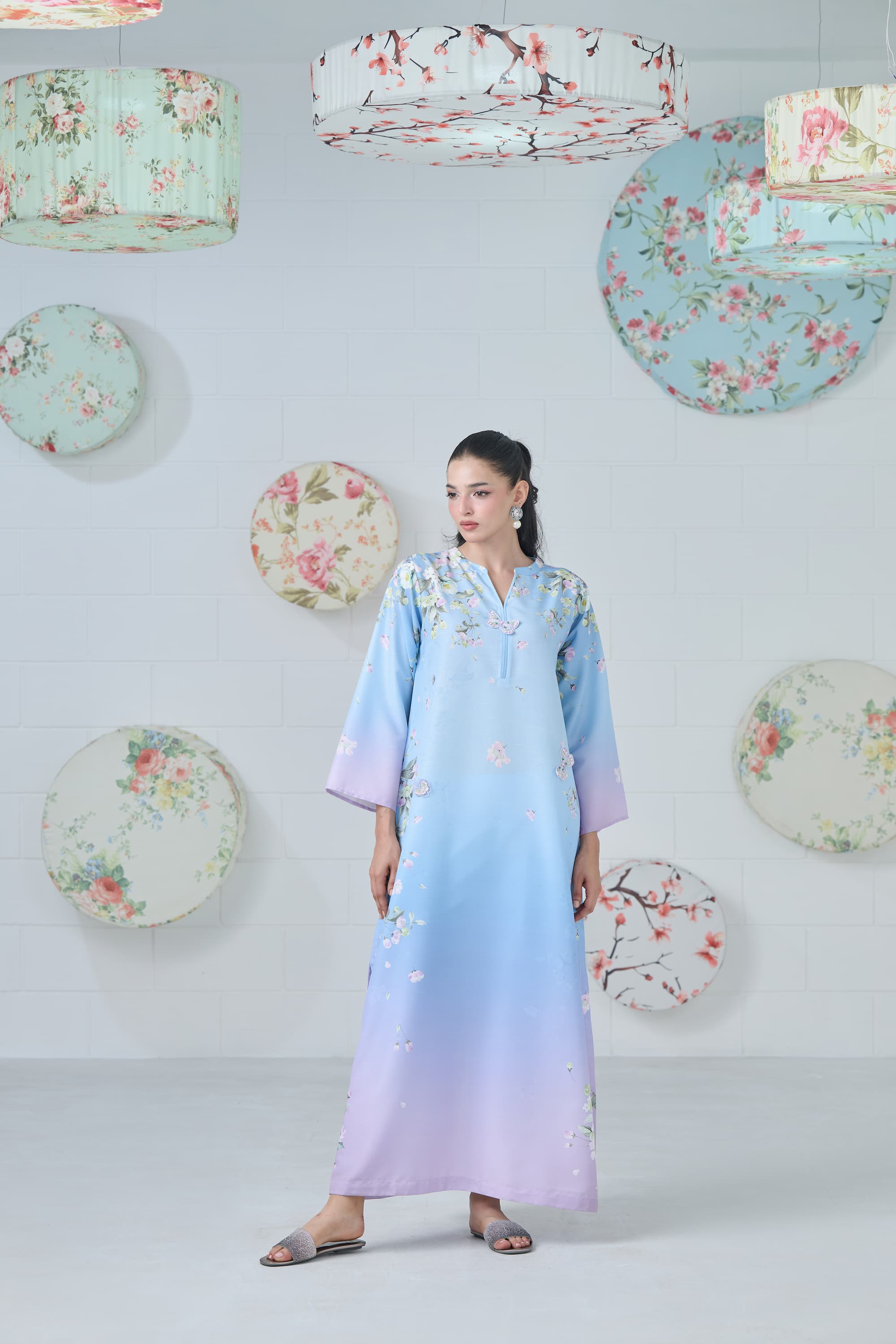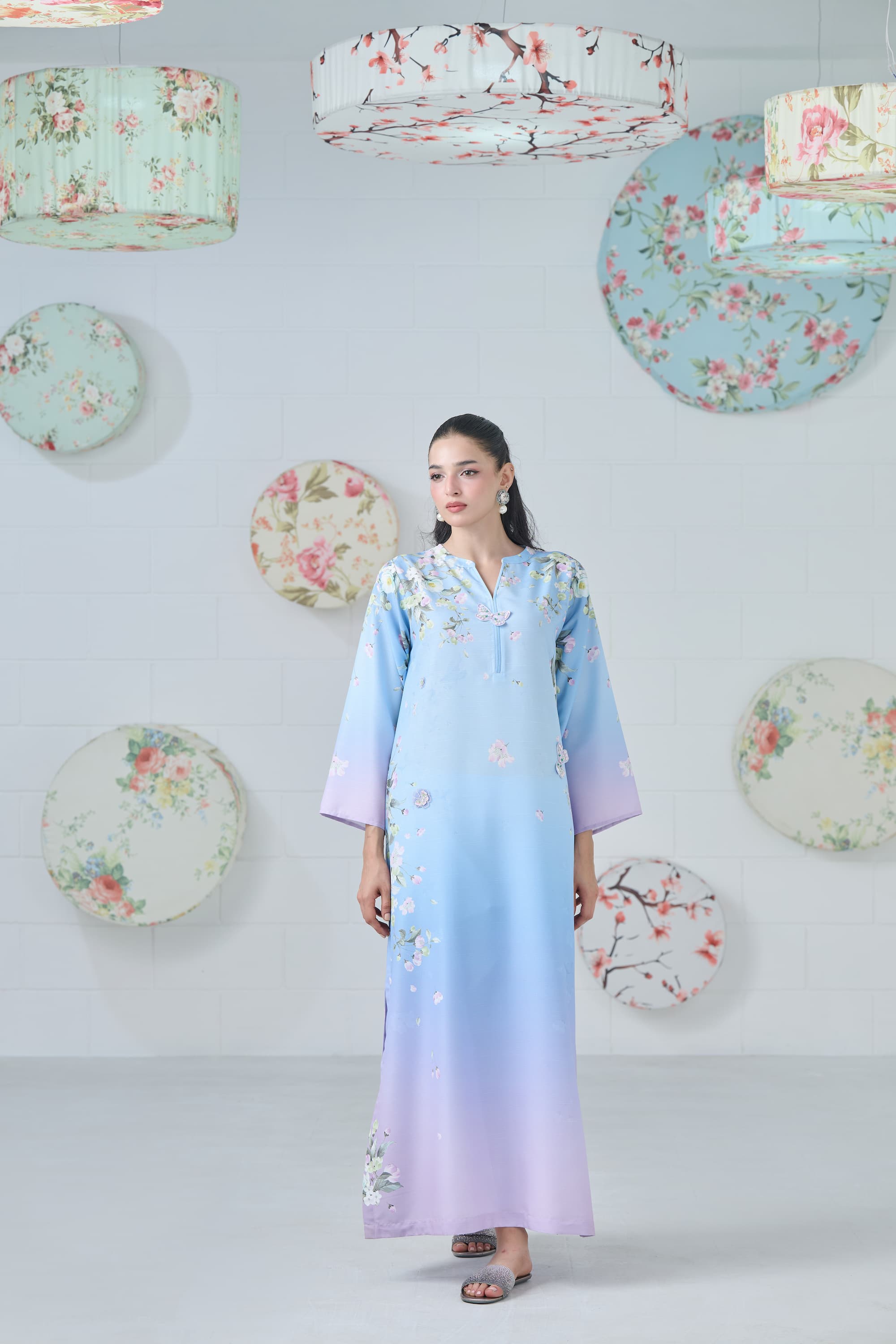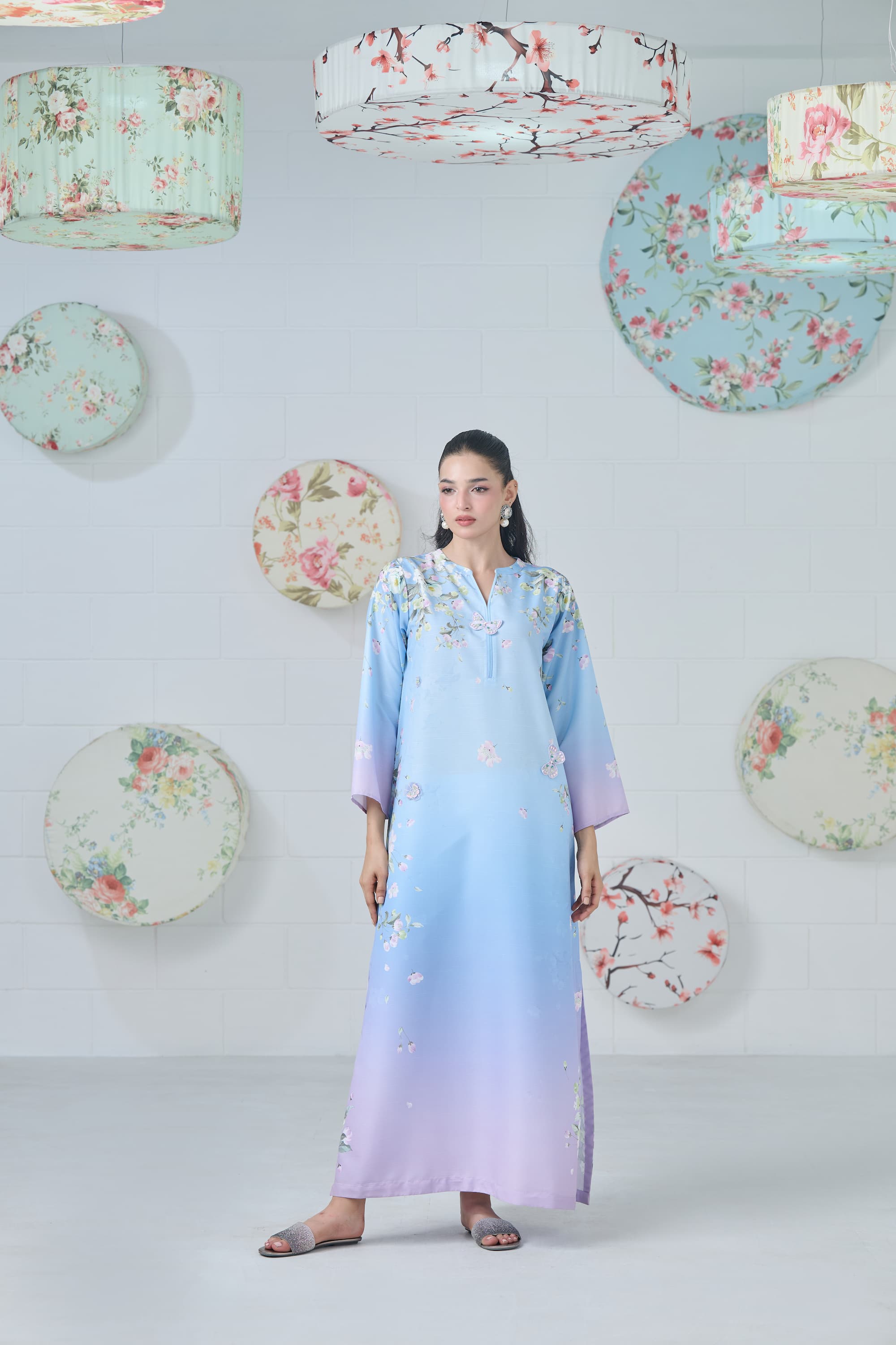 Elevate your wardrobe with this ethereal powder blue, lilac, and mauve ombré kaftan, a flowing masterpiece that blends dreamy hues with artistic design. Each piece features one-of-a-kind print placements on the shoulders and sides. The intricate print is beautifully enhanced with 3D embroidered butterflies and delicate floral motifs, adding texture, depth, and a touch of whimsical elegance.