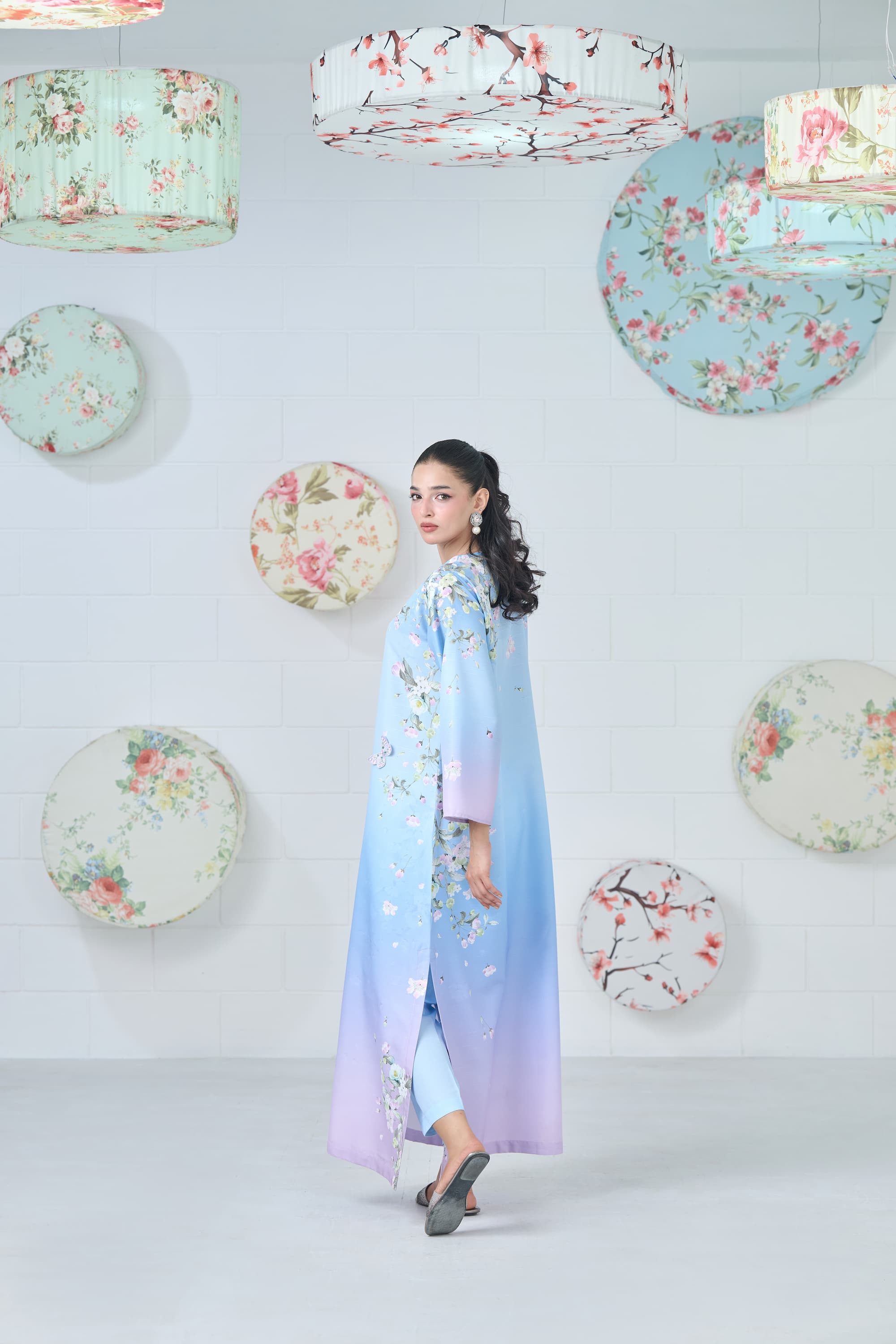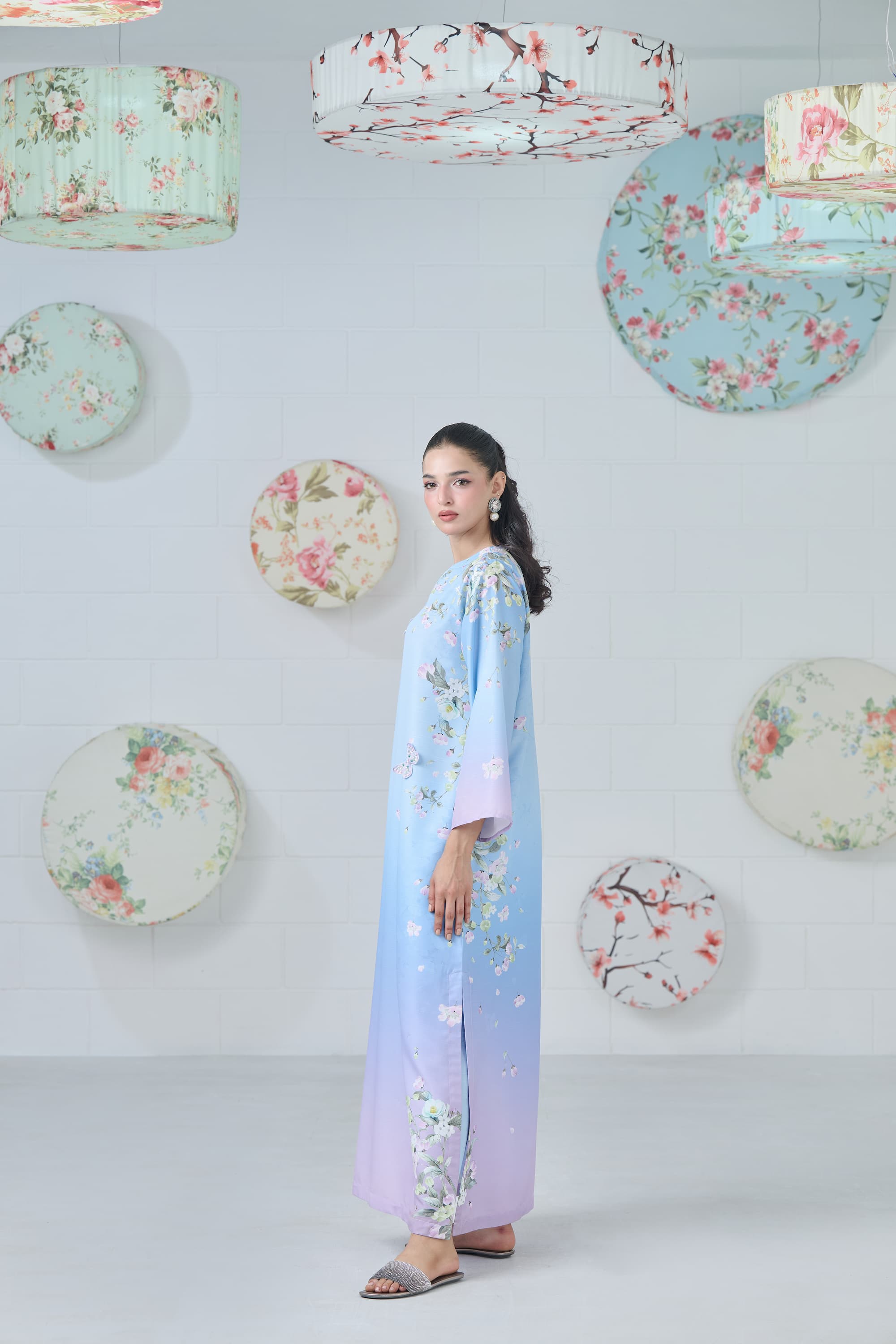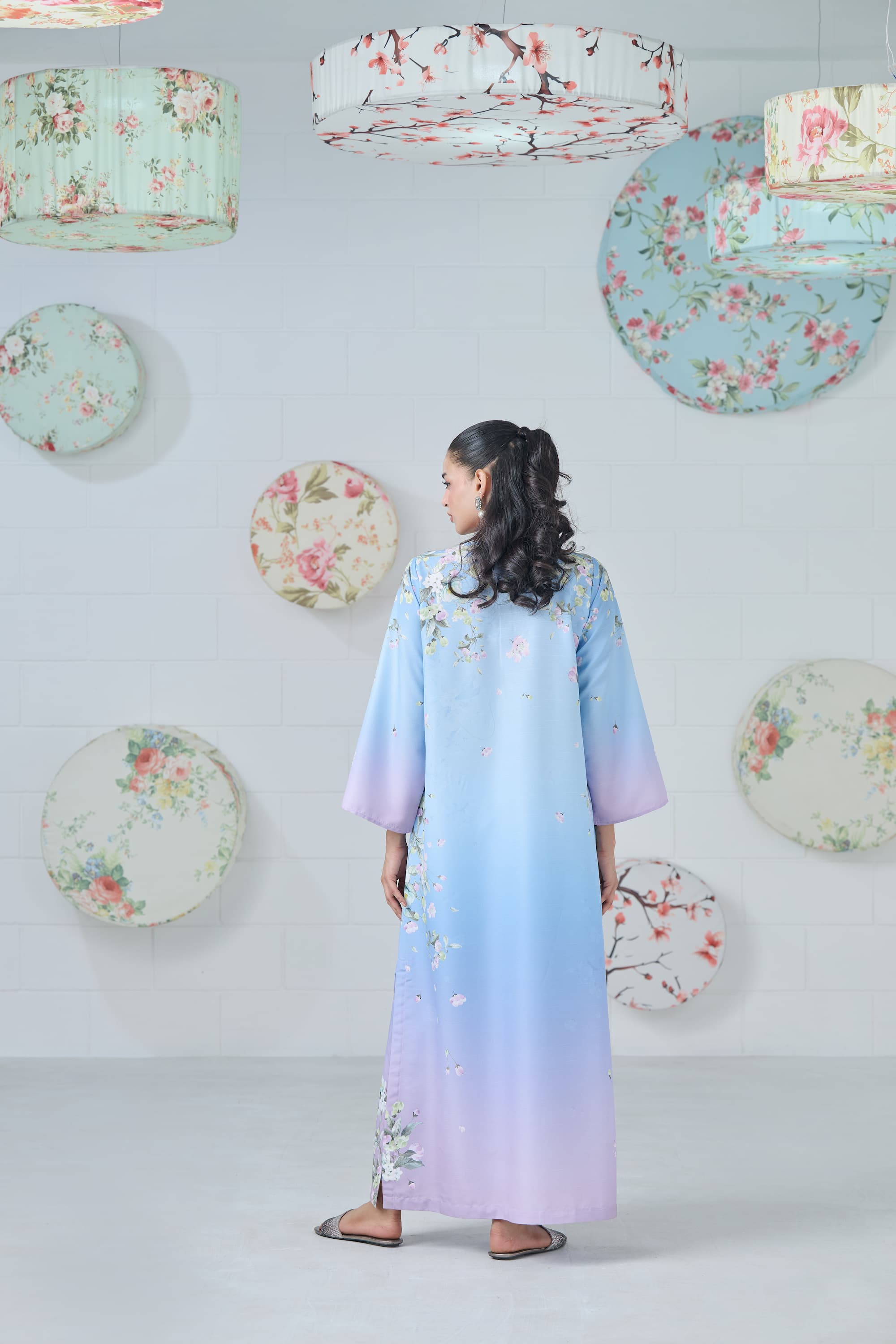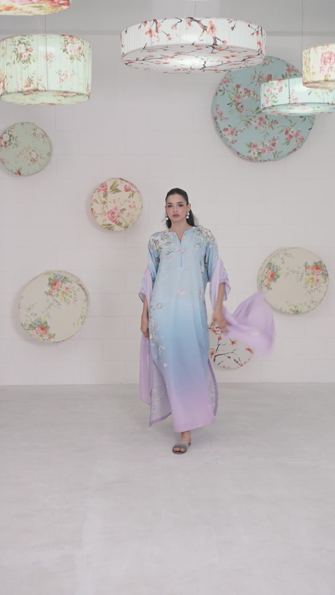 Elevate your wardrobe with this ethereal powder blue, lilac, and mauve ombré kaftan, a flowing masterpiece that blends dreamy hues with artistic design. Each piece features one-of-a-kind print placements on the shoulders and sides. The intricate print is beautifully enhanced with 3D embroidered butterflies and delicate floral motifs, adding texture, depth, and a touch of whimsical elegance.