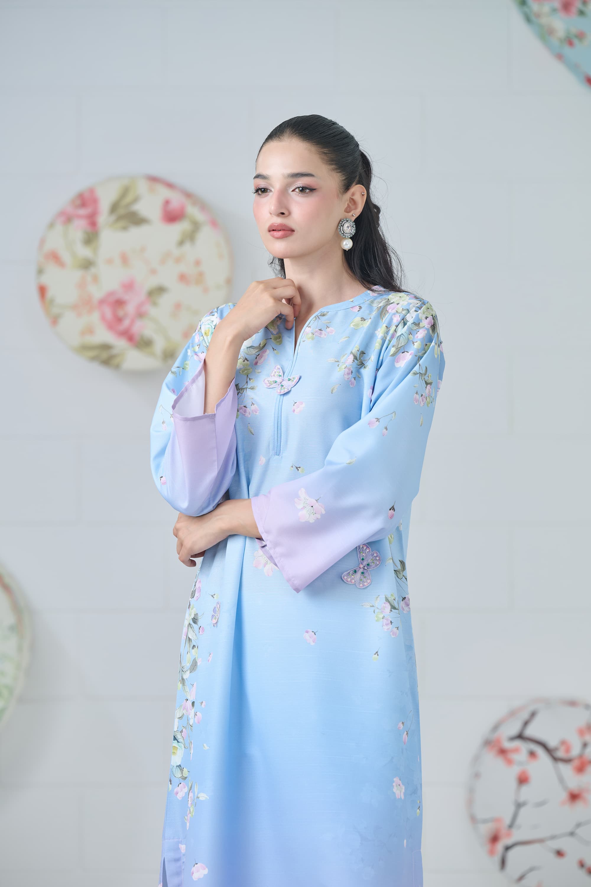 Embellishment: Digital print sets with 3d embroidered flowers and butterflies.