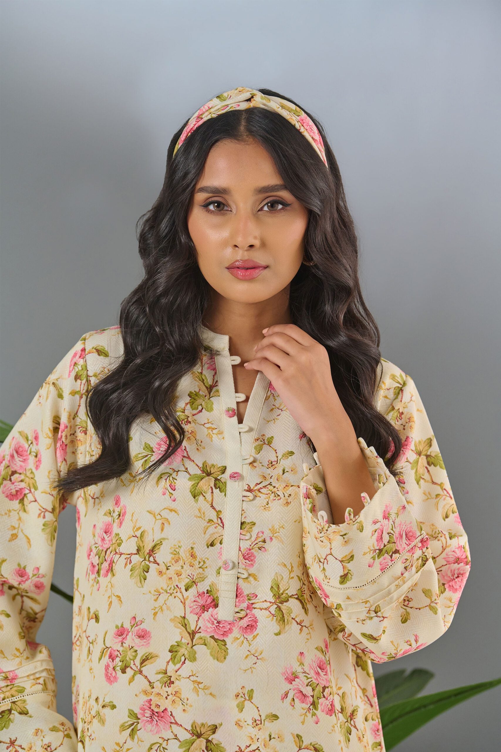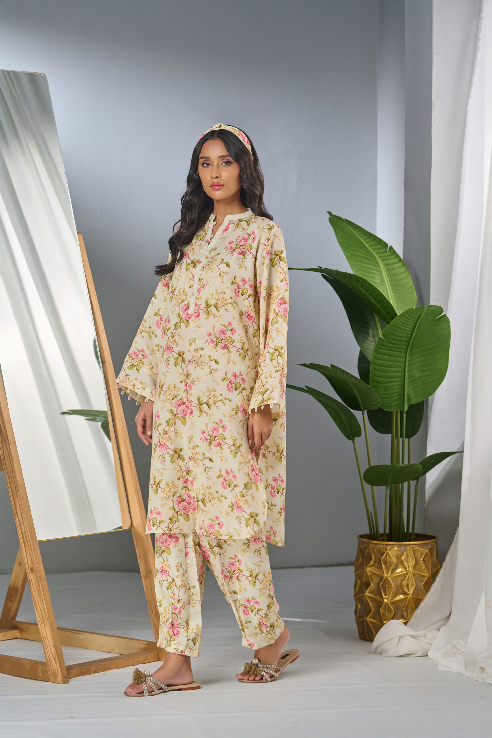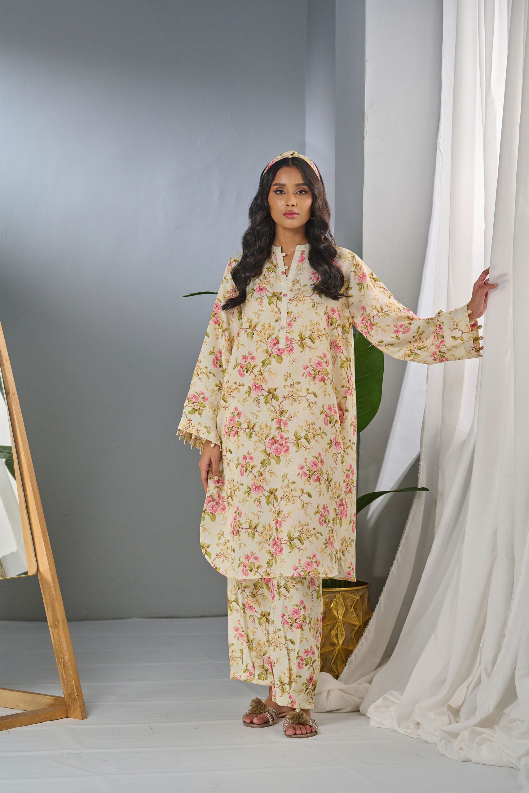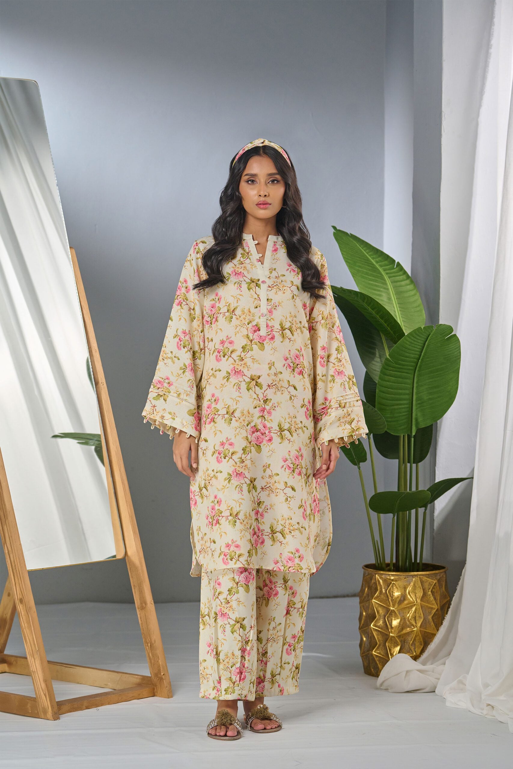 Description: Drape yourself in beige floral cord set – a classic outfit that speaks volumes in style. Color: beige with pink flowers Fabric: herringbone Cut: regular fit shirt and with pleated pants Trouser: Included Embellishment: Digital printed set with pleated detailing on neck, sleeves and pants.