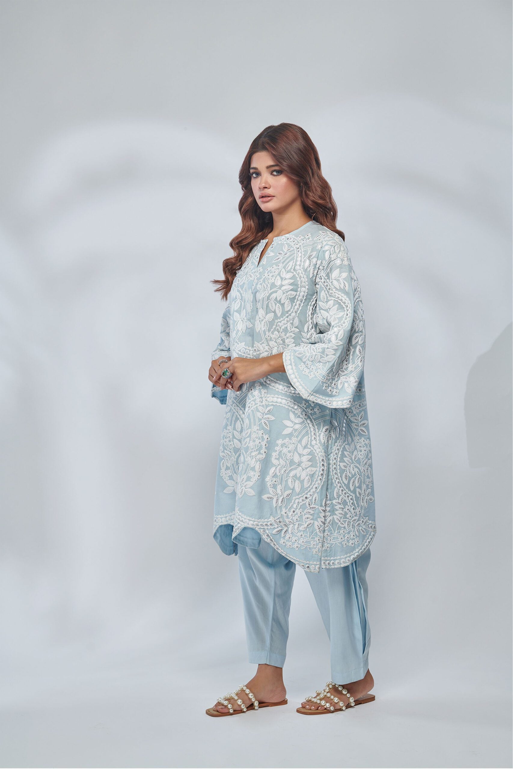 Embellishment: Embossed Screen print with silver foil detailing enhanced with pleated shalwar.