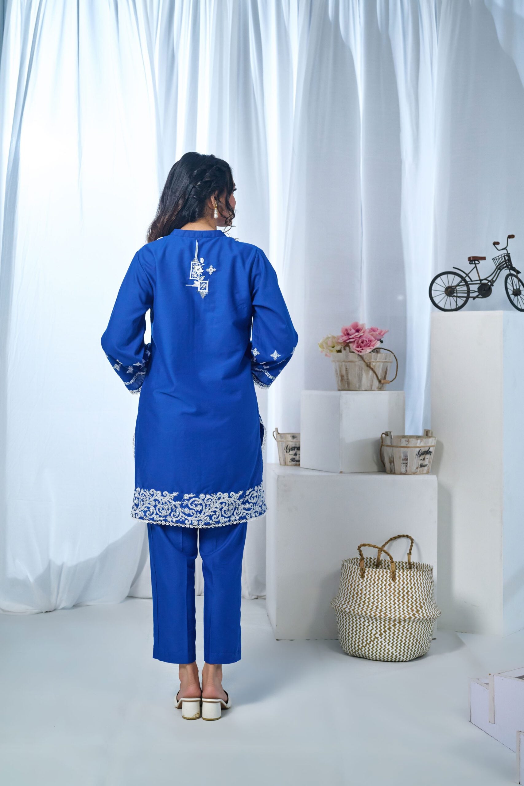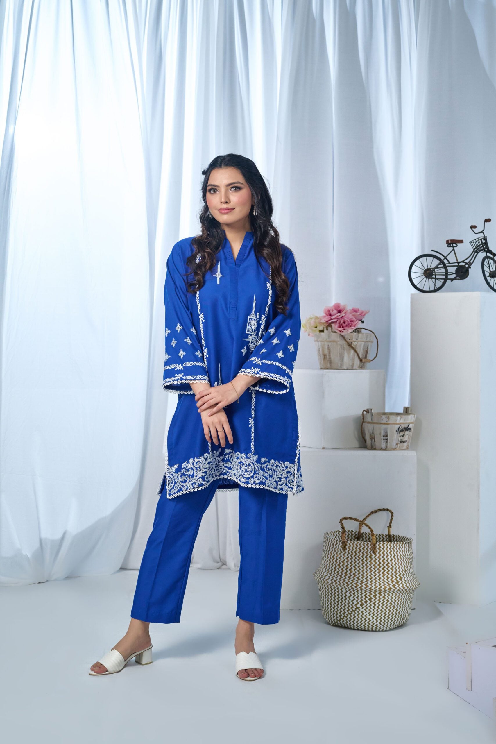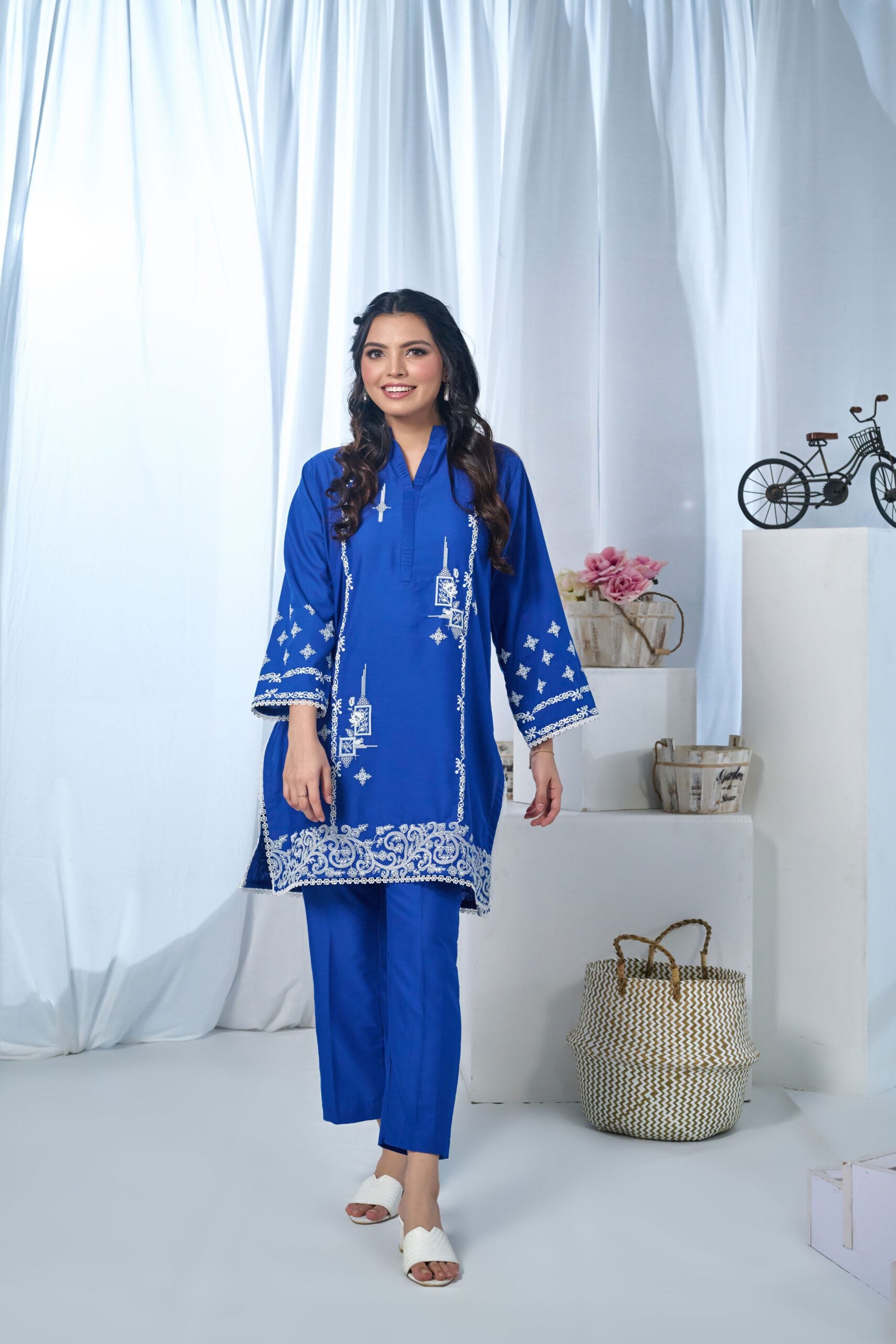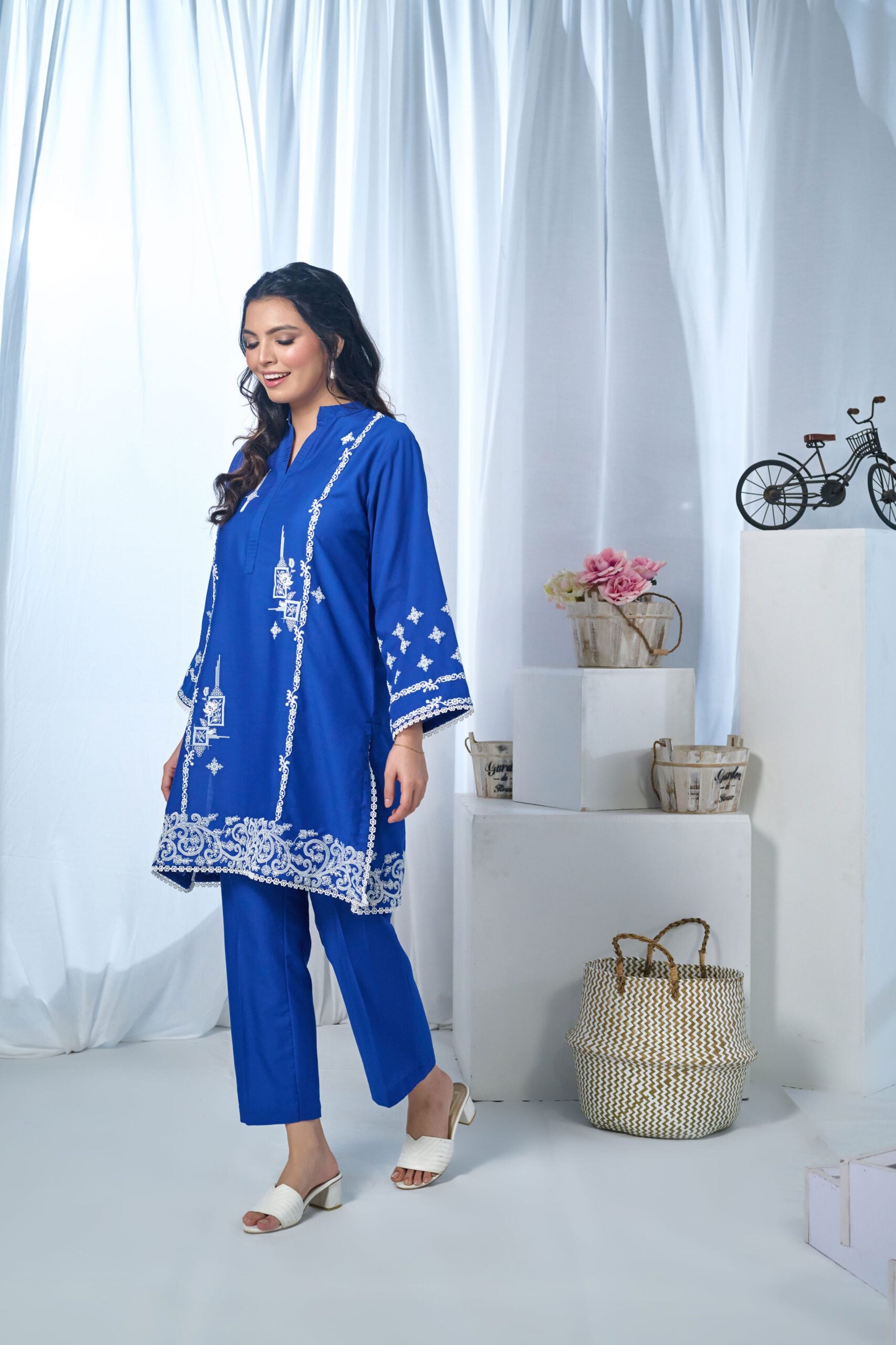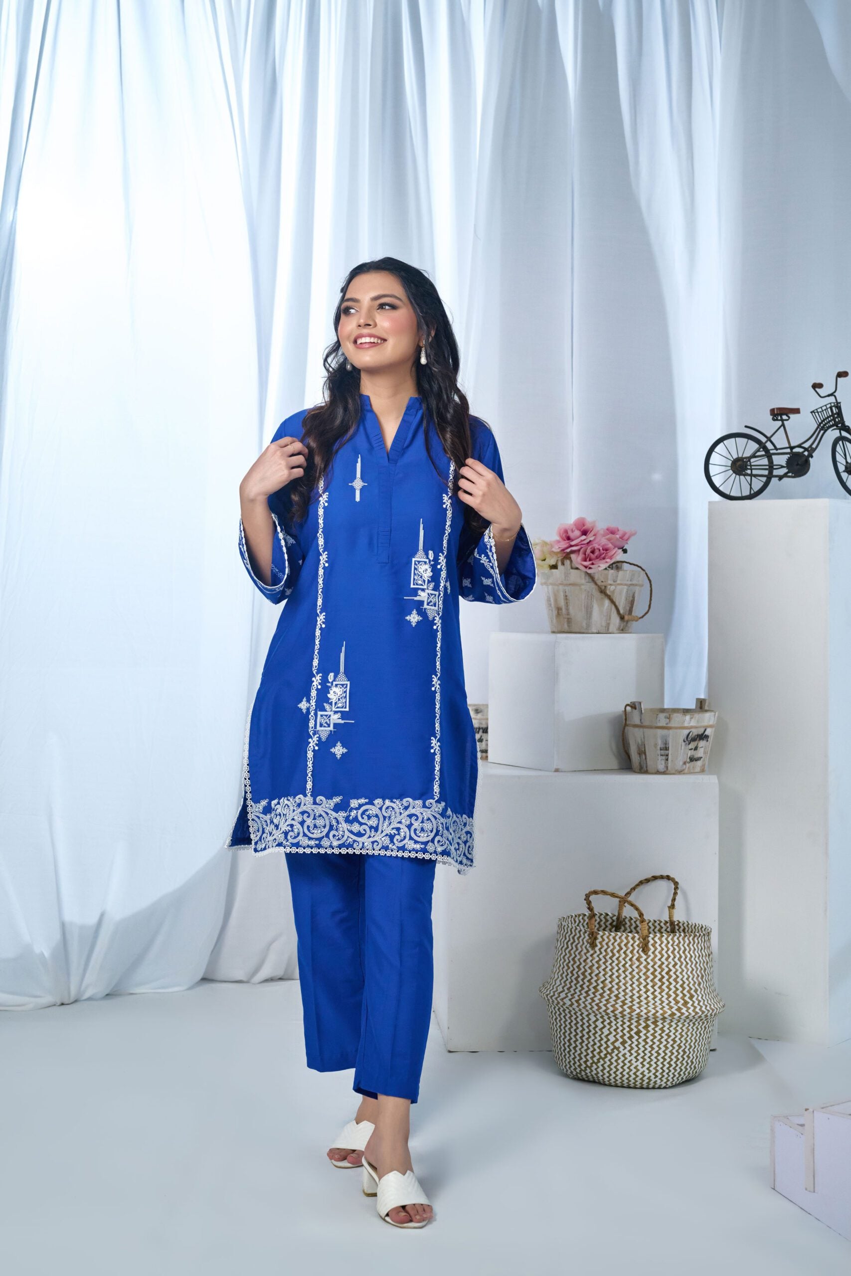 Blue shirt and pant enhanced with soothing embossed hand screen printed for classic look.