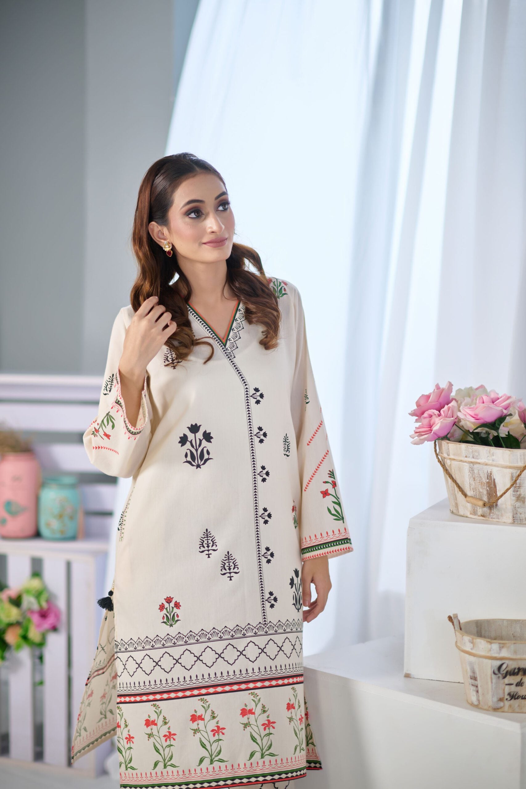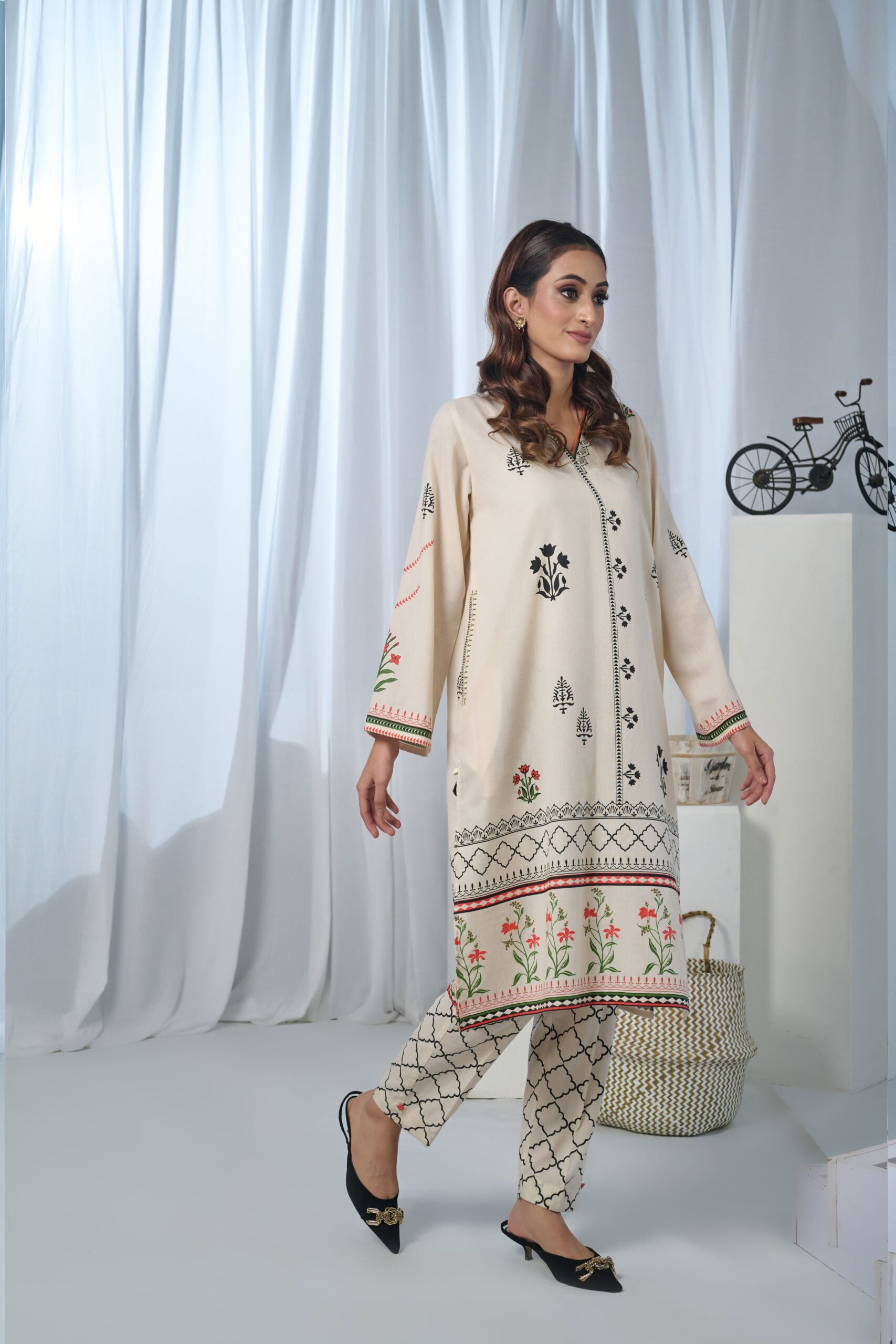 Pearl white shirt and pant enhanced with soothing floral hand screen printed for classic look.