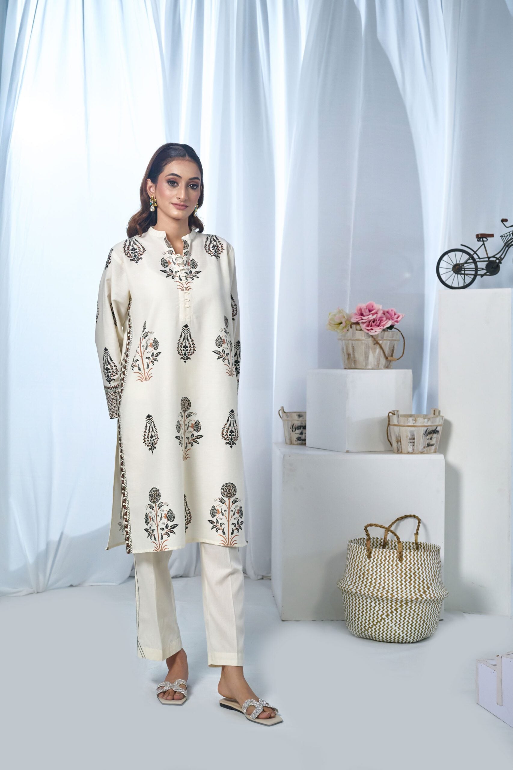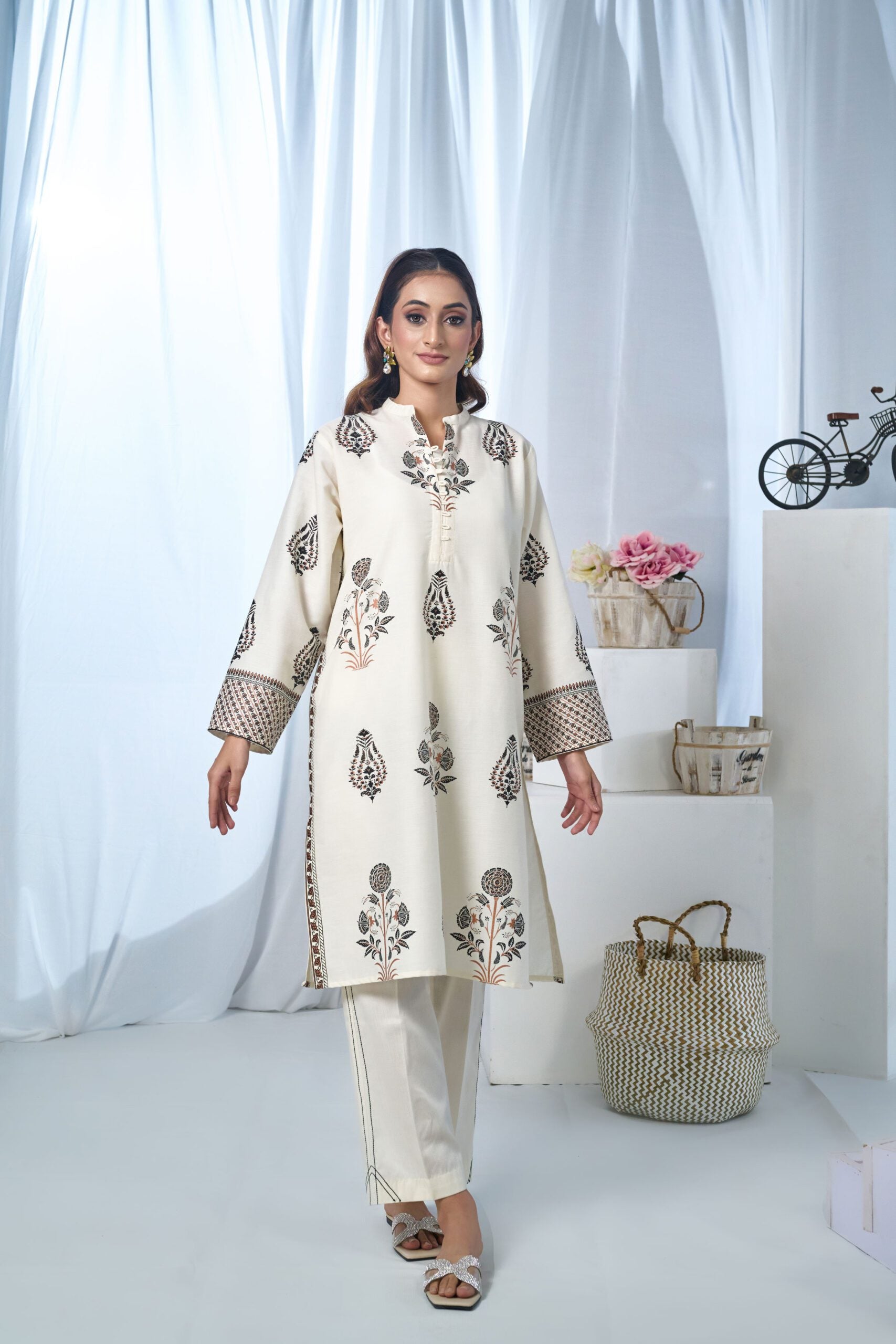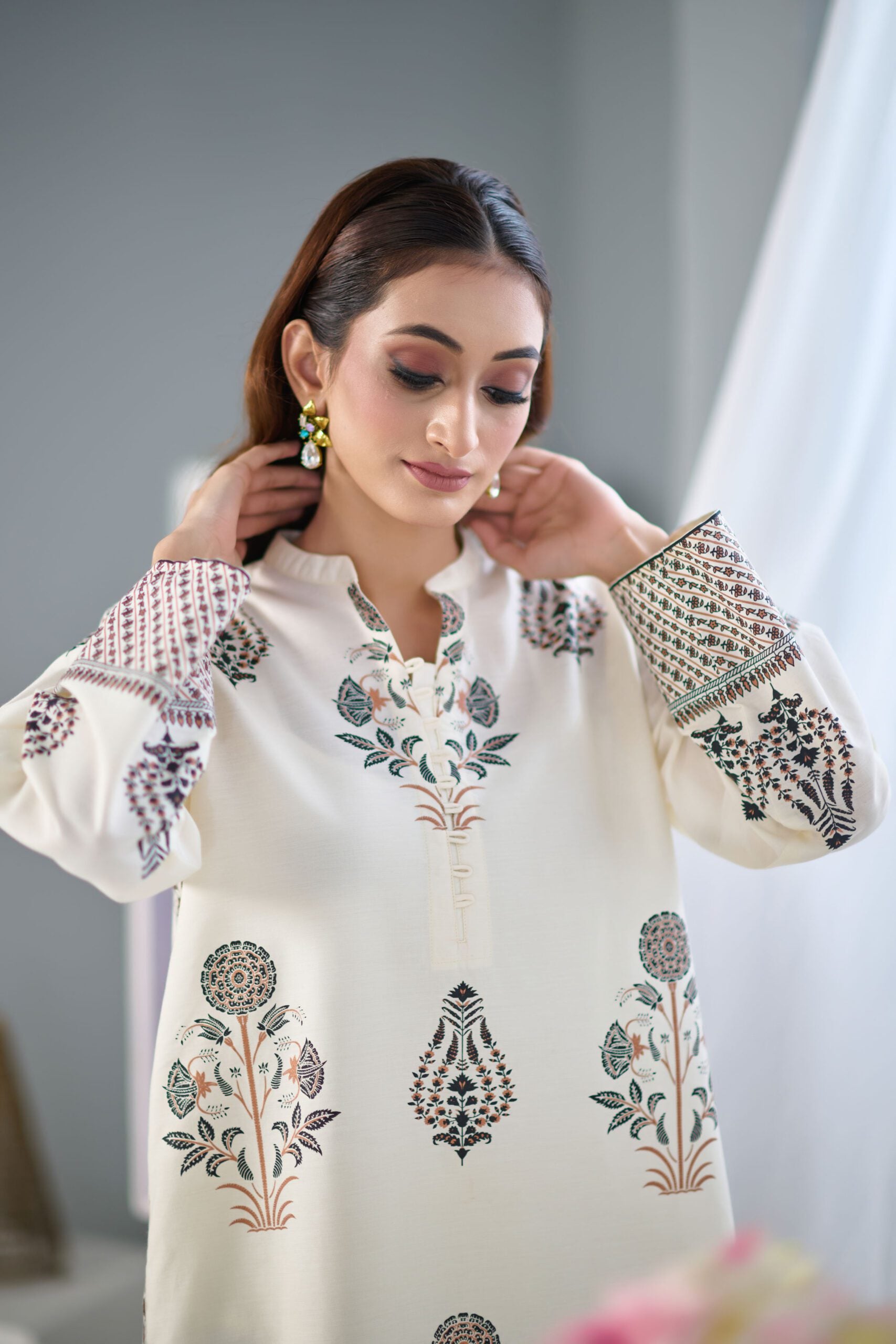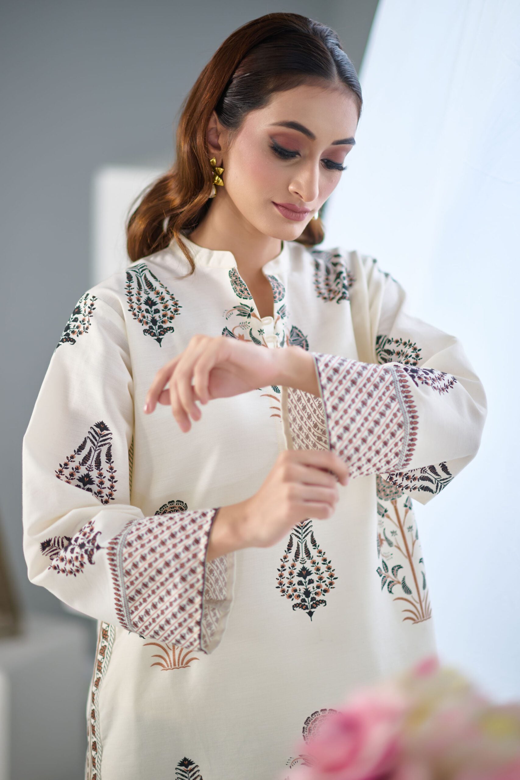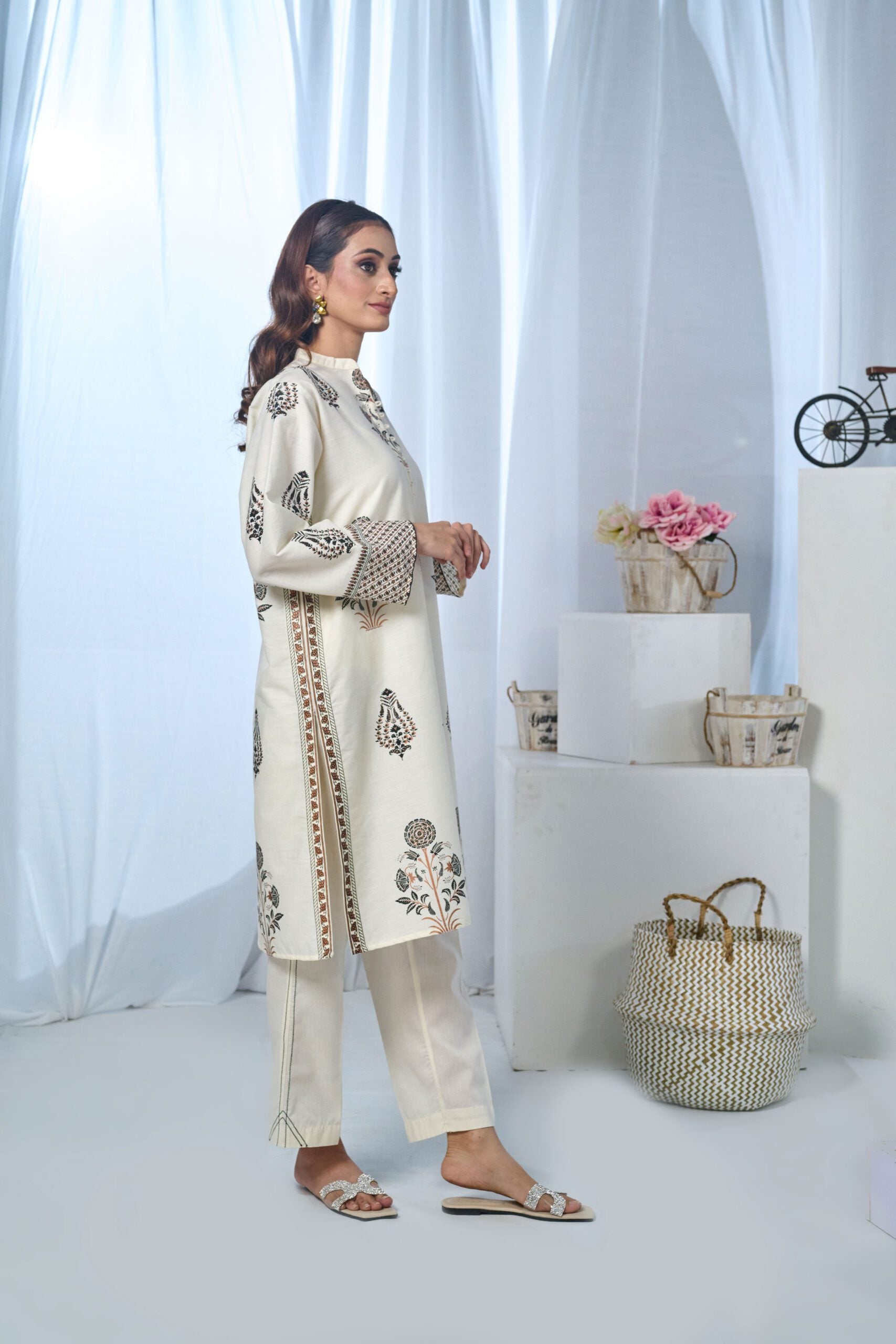 Pearl white shirt and pant enhanced with soothing floral hand screen printed for classic look.