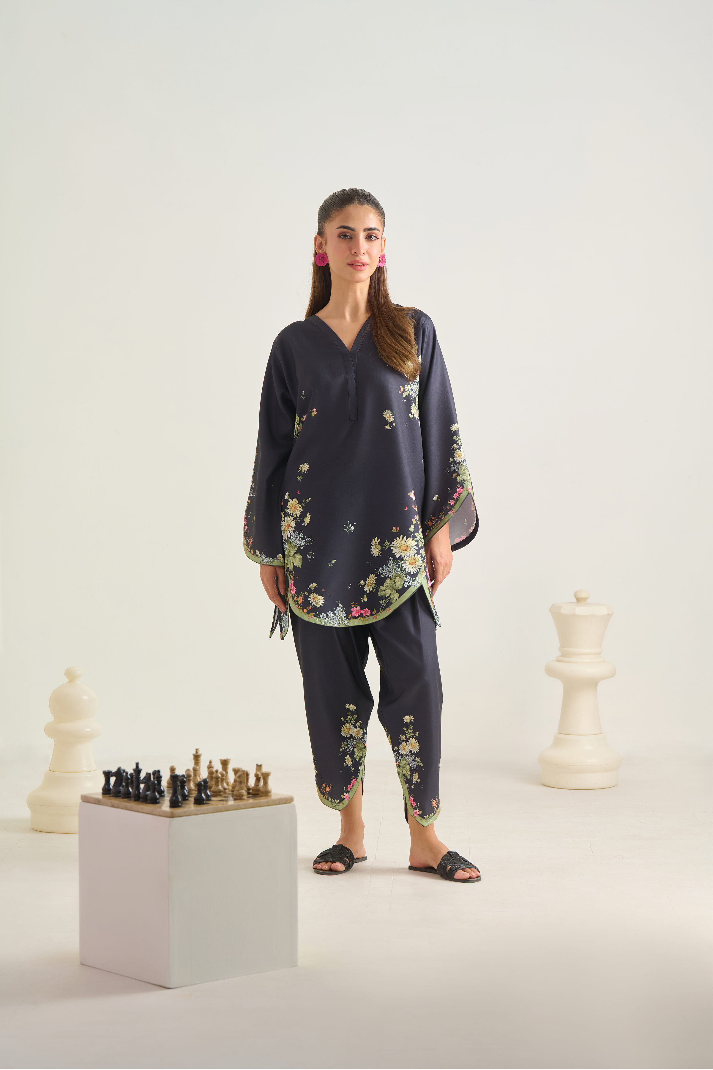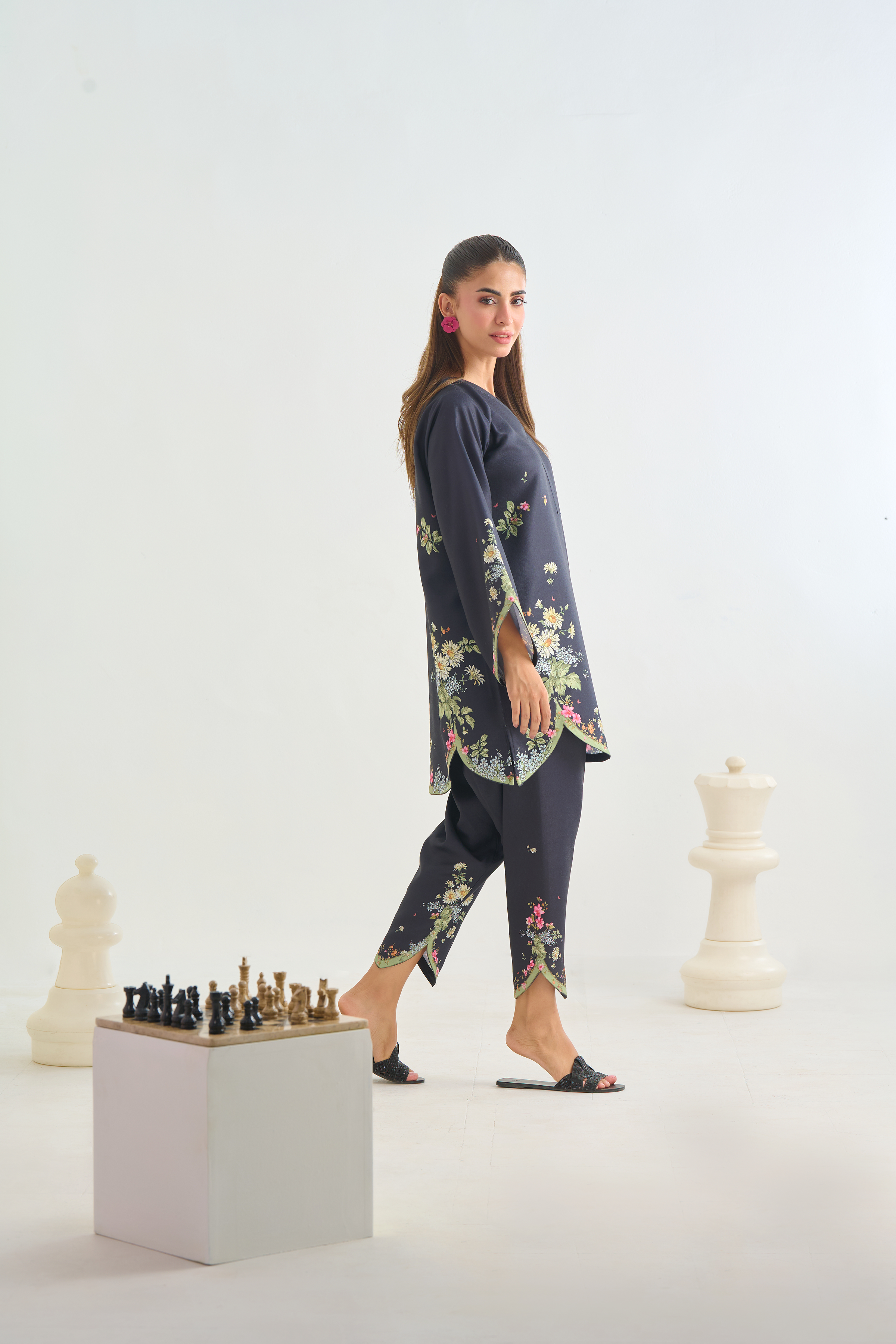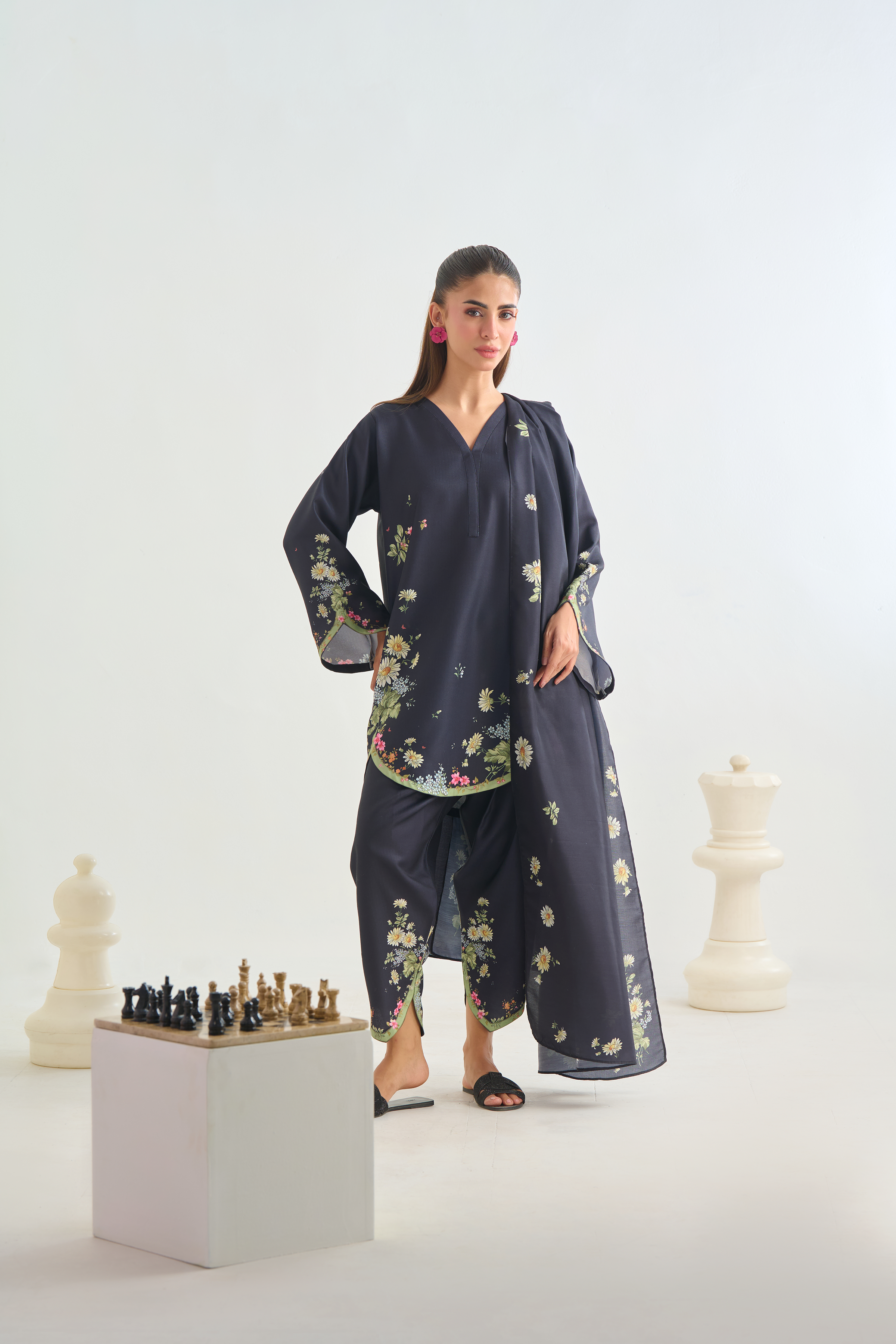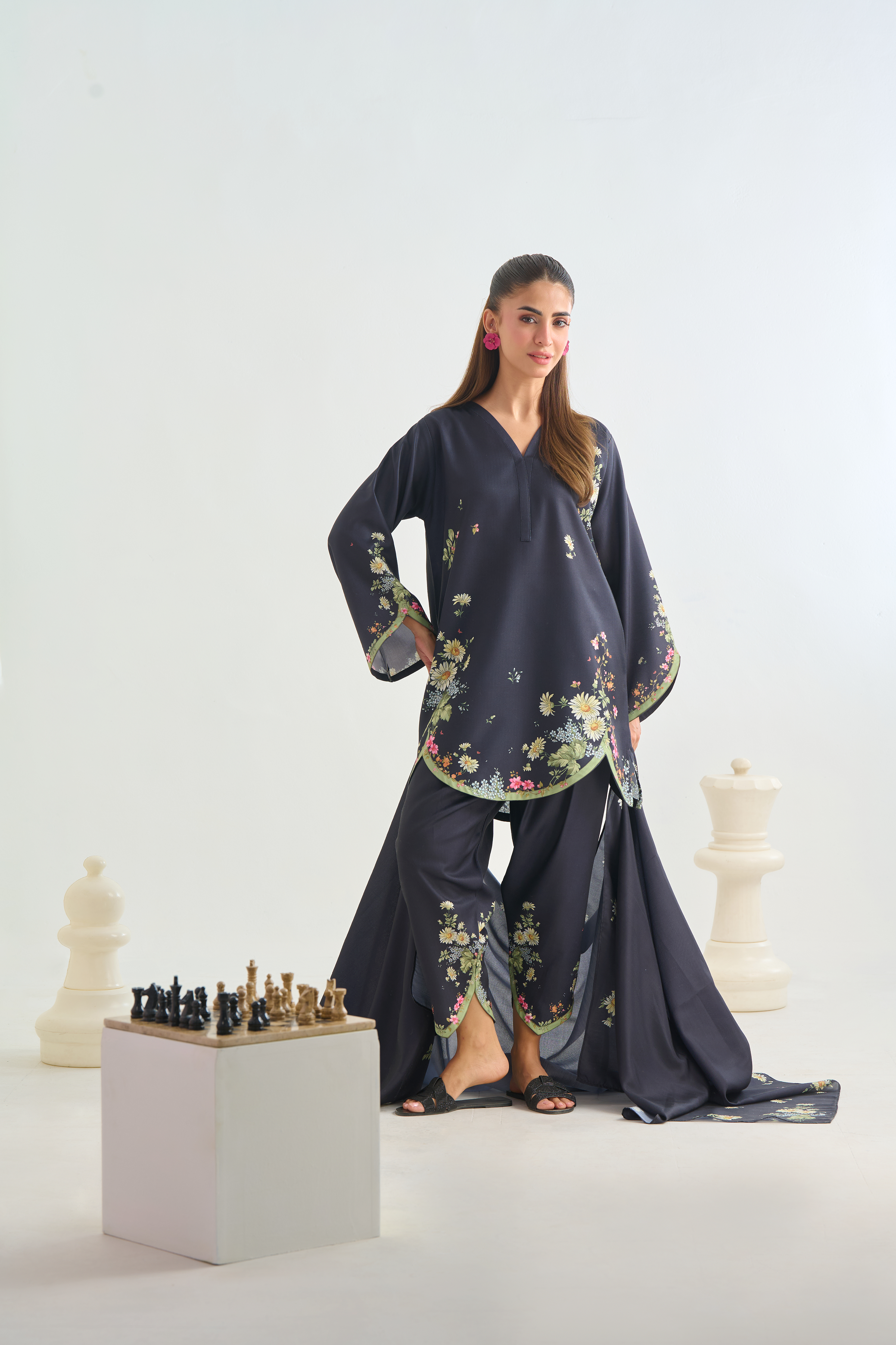Description: Embrace timeless elegance with this stunning black ensemble, adorned with delicate daisy florals and soft hints of blue and pink blooms. The modern, one-of-a-kind print placement adds a contemporary artistic touch, making every piece unique. Thoughtfully designed with a graceful cutwork hemline and a refined bottom opening, this outfit blends sophistication with modern charm.
