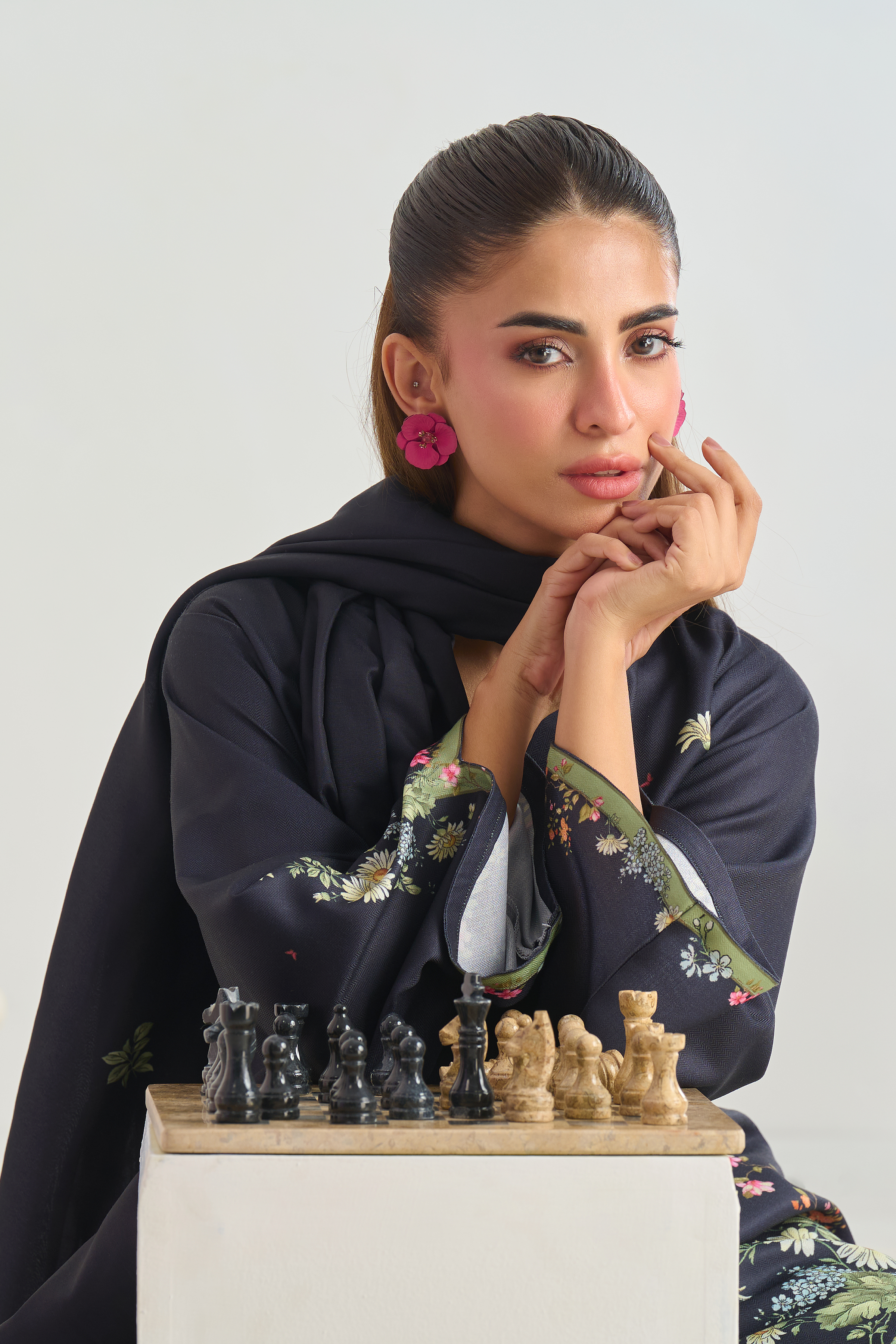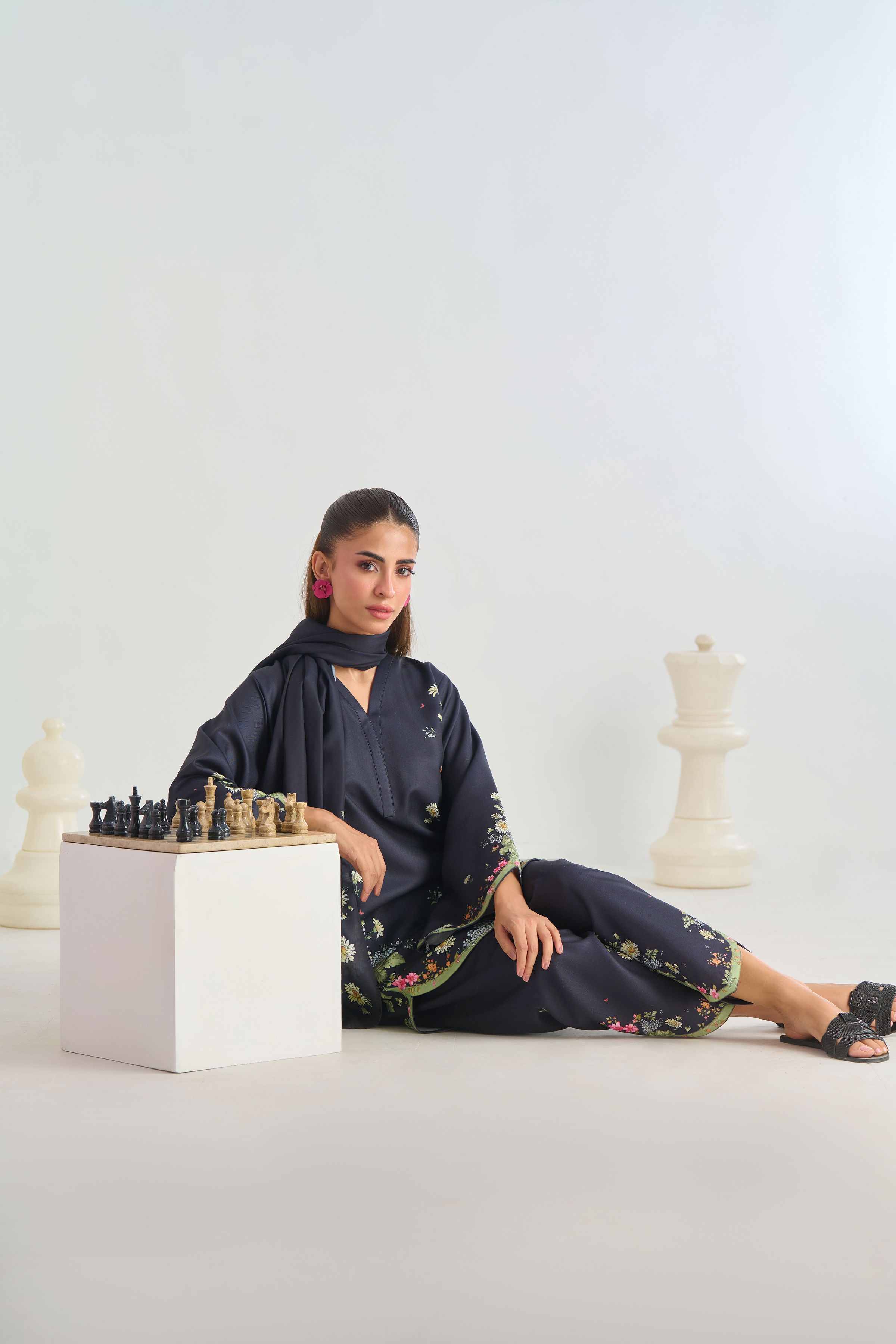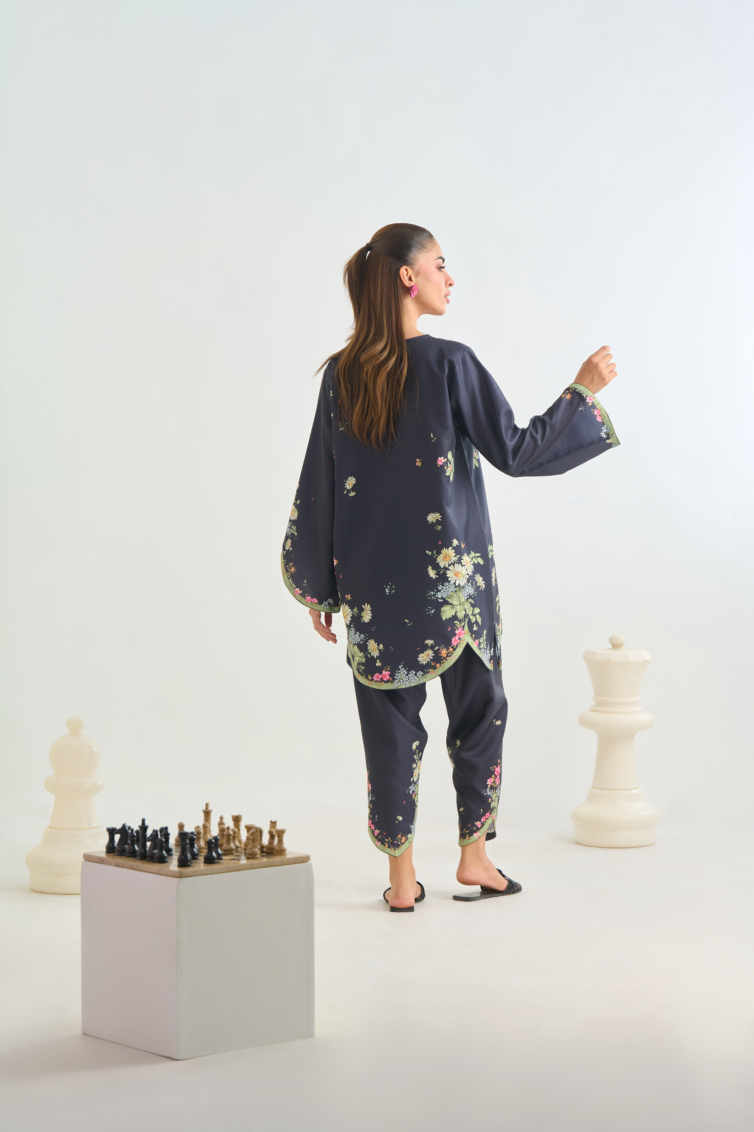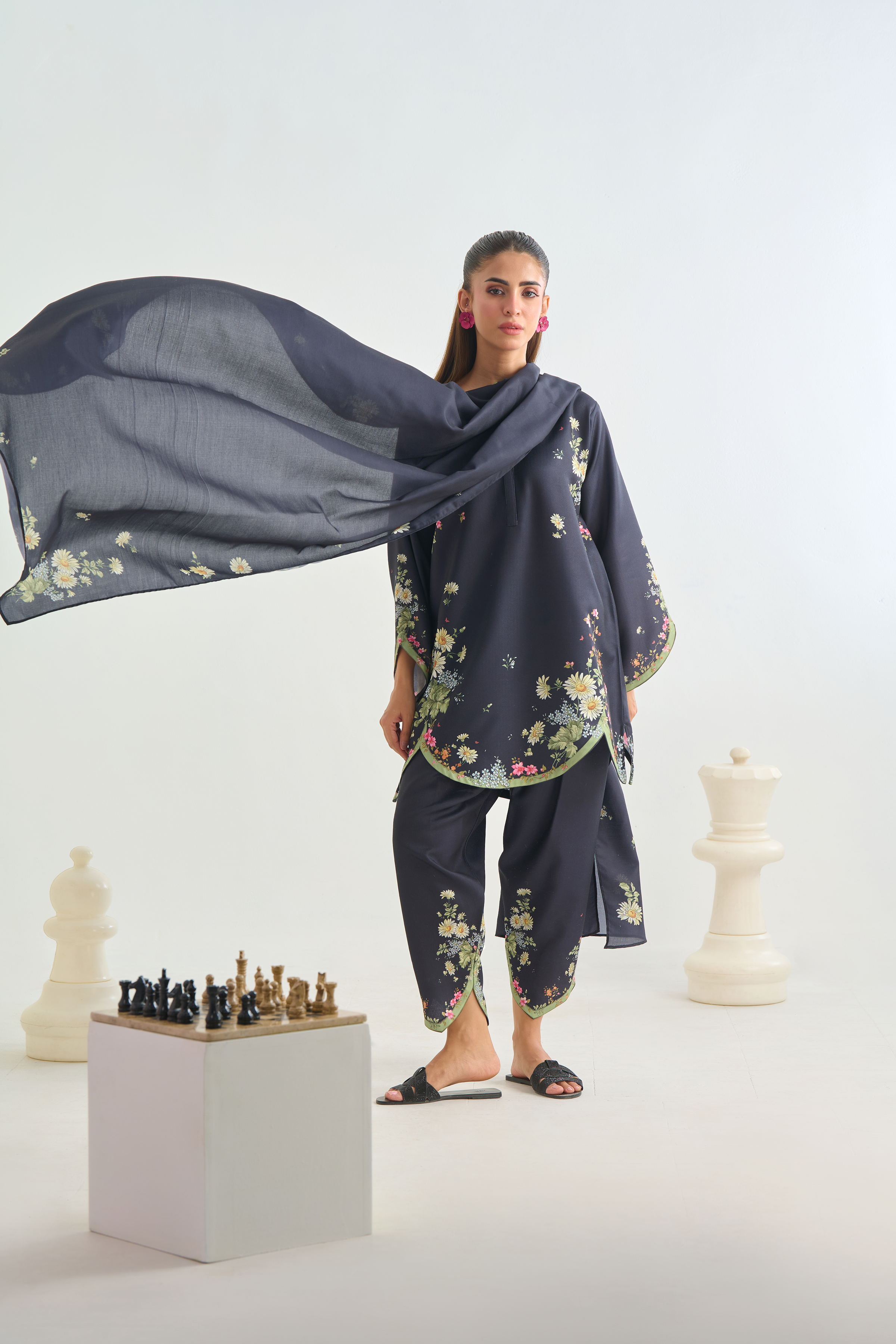 Description: Embrace timeless elegance with this stunning black ensemble, adorned with delicate daisy florals and soft hints of blue and pink blooms. The modern, one-of-a-kind print placement adds a contemporary artistic touch, making every piece unique. Thoughtfully designed with a graceful cutwork hemline and a refined bottom opening, this outfit blends sophistication with modern charm.