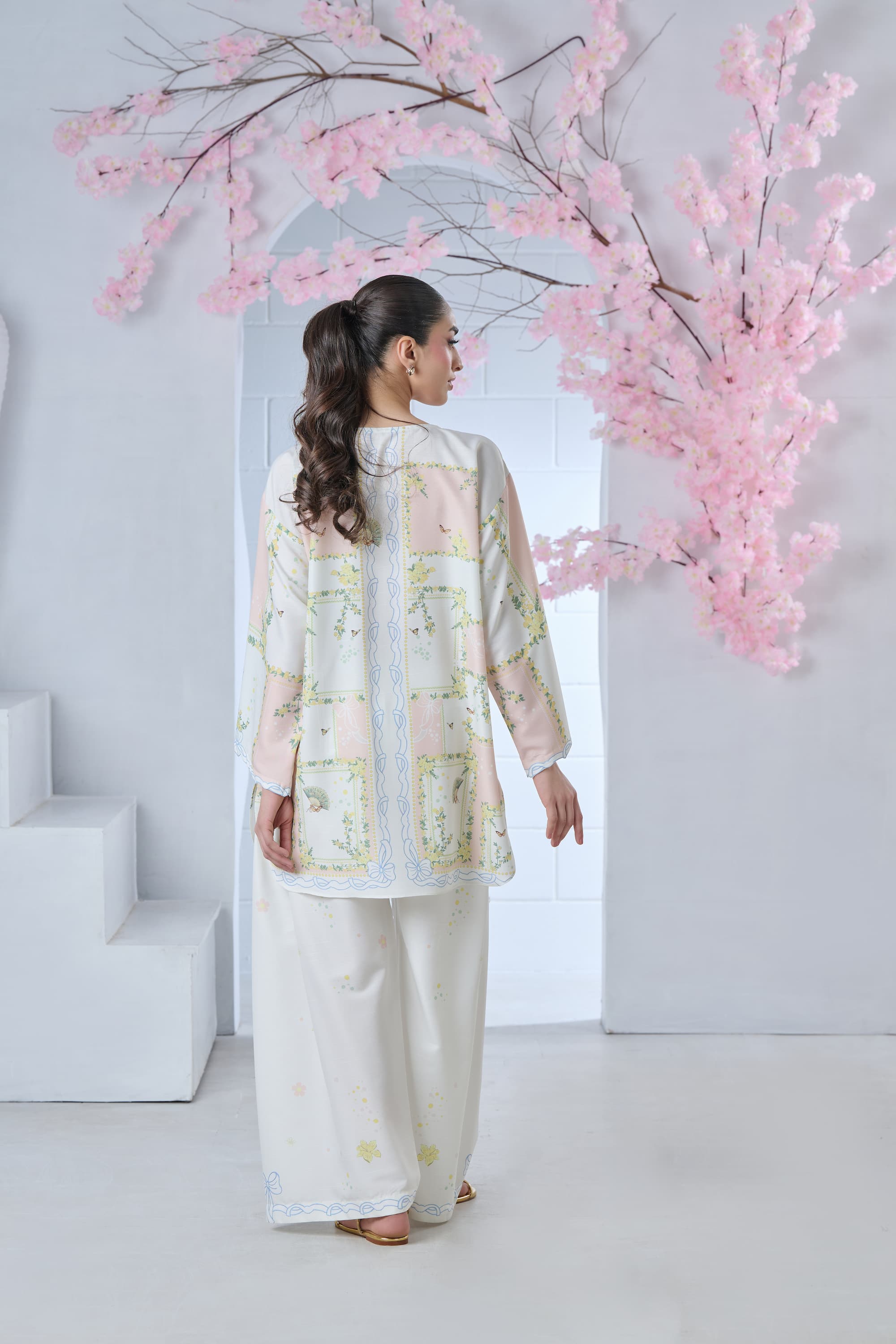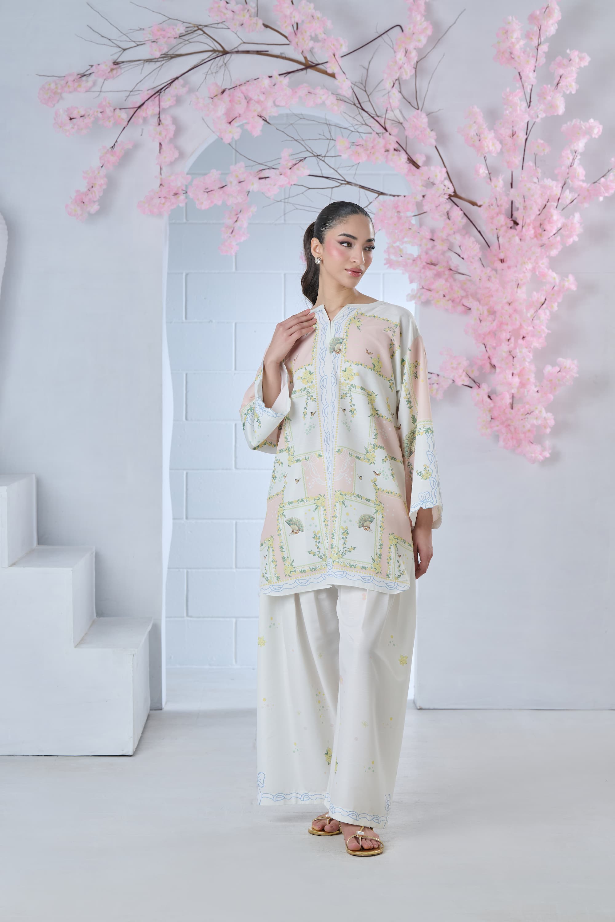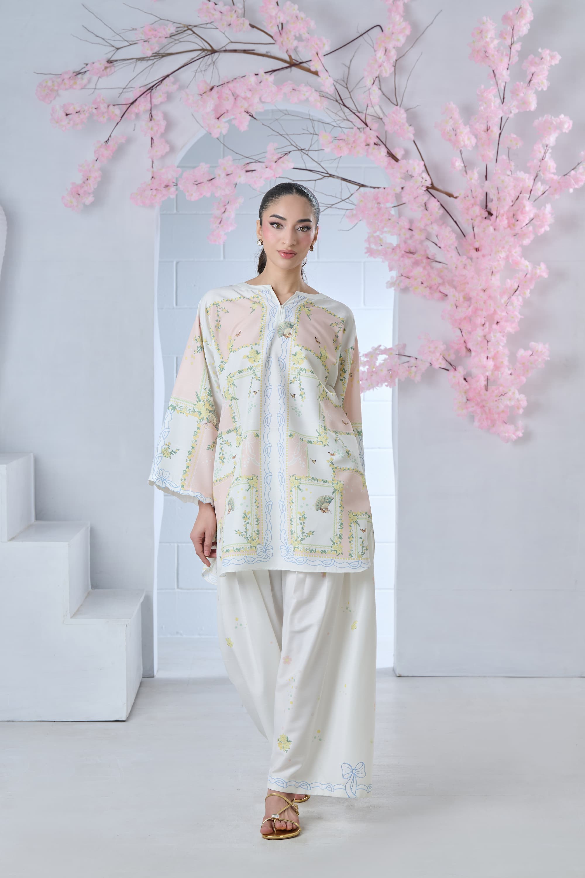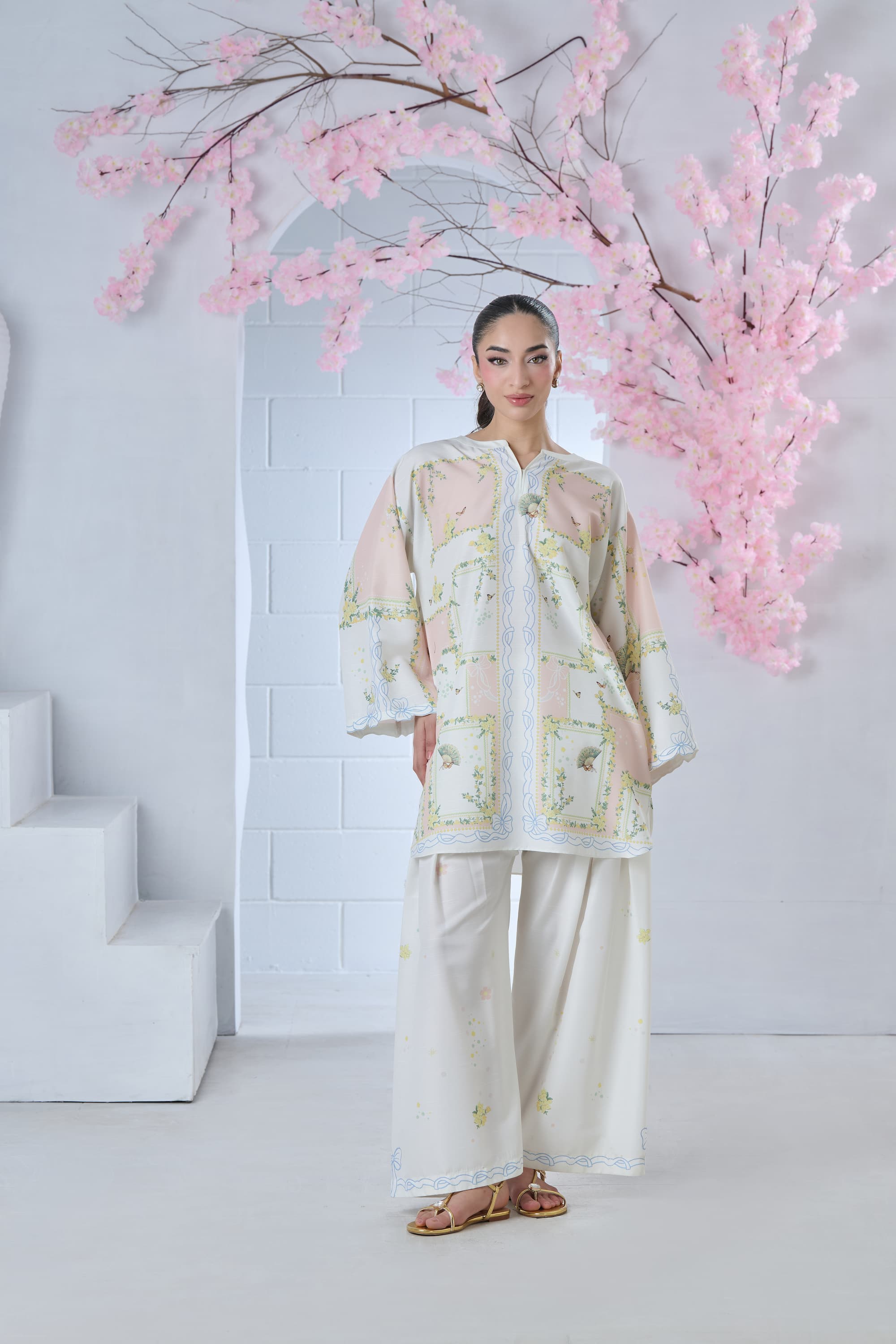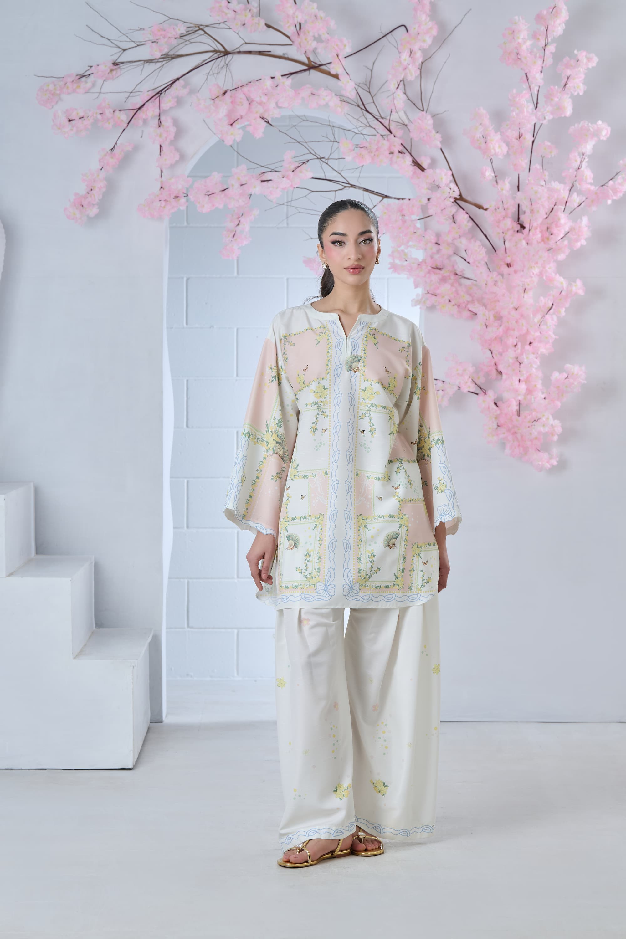Step into artistic elegance with this blush pink and off-white printed cordset. The shirt features a one-of-a-kind abstract print, reminiscent of a whimsical floral maze, beautifully enhanced with delicate butterflies and intricate Chinese fan motifs. Soft yet striking, this coordinated set blends charm and individuality—perfect for making a subtle statement with effortless style.