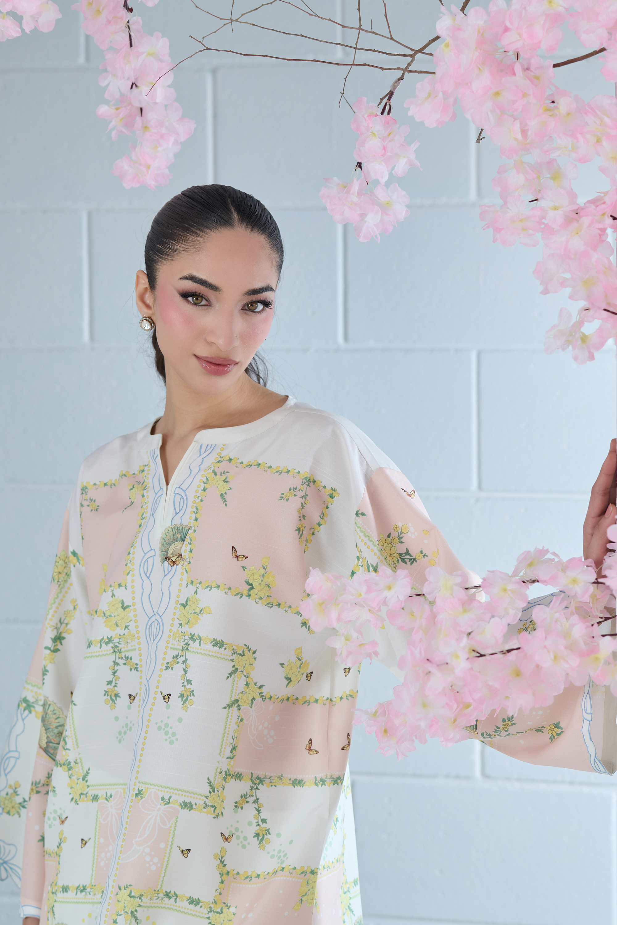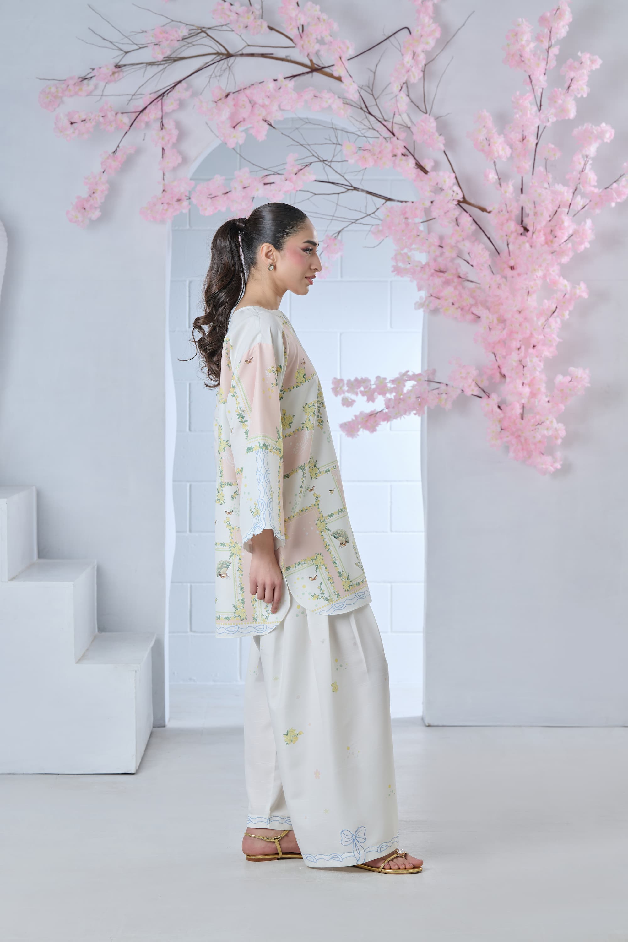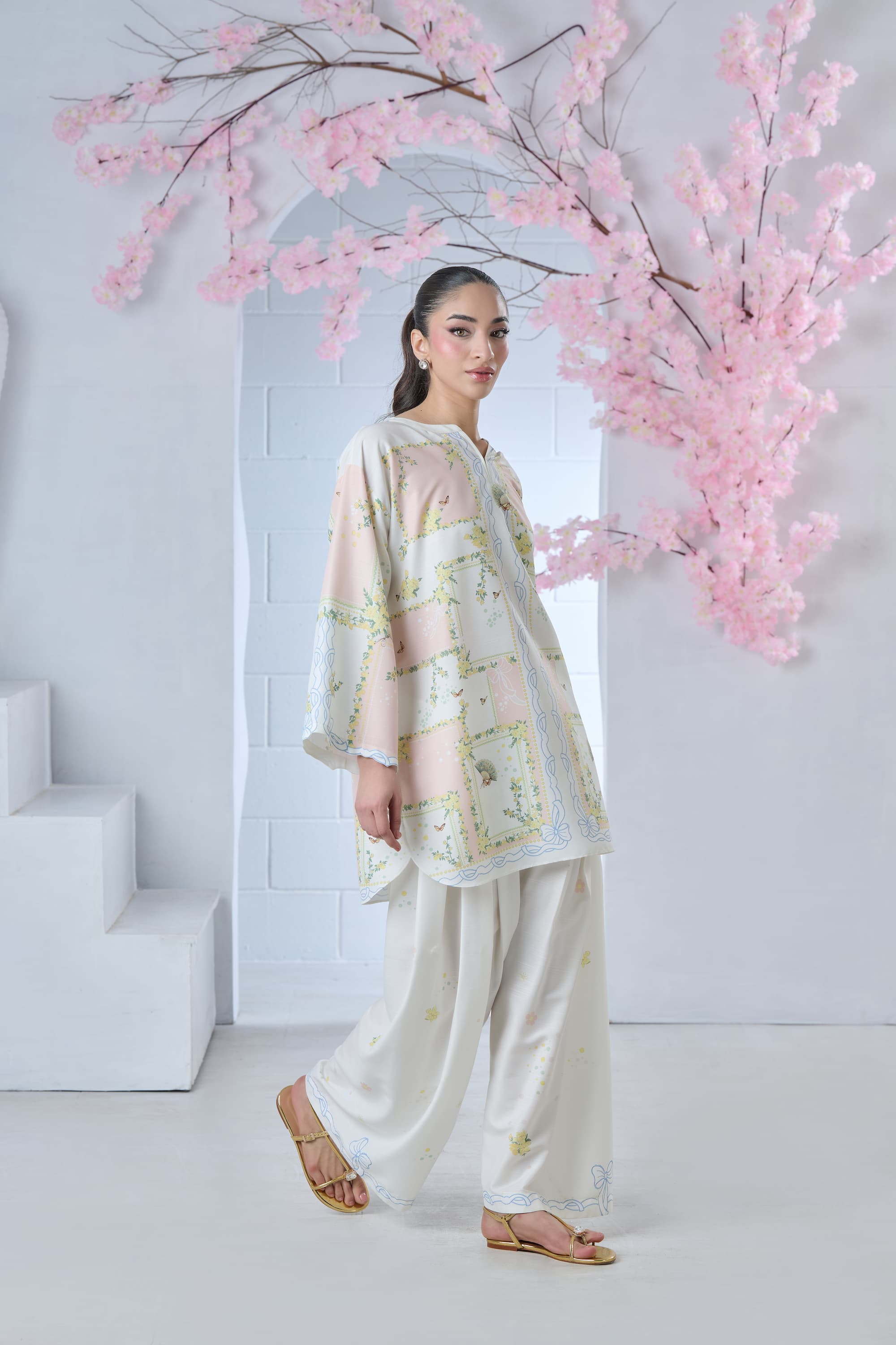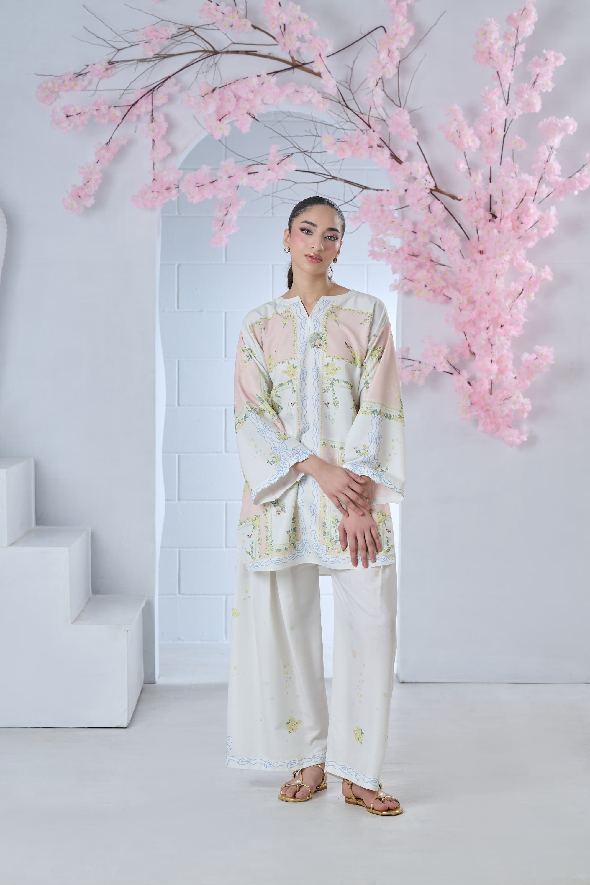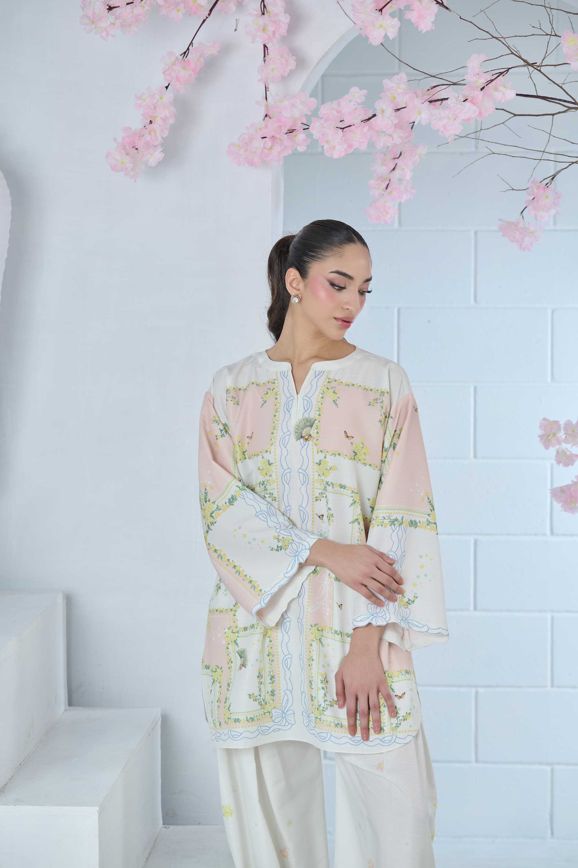 Step into artistic elegance with this blush pink and off-white printed cordset. The shirt features a one-of-a-kind abstract print, reminiscent of a whimsical floral maze, beautifully enhanced with delicate butterflies and intricate Chinese fan motifs. Soft yet striking, this coordinated set blends charm and individuality—perfect for making a subtle statement with effortless style.