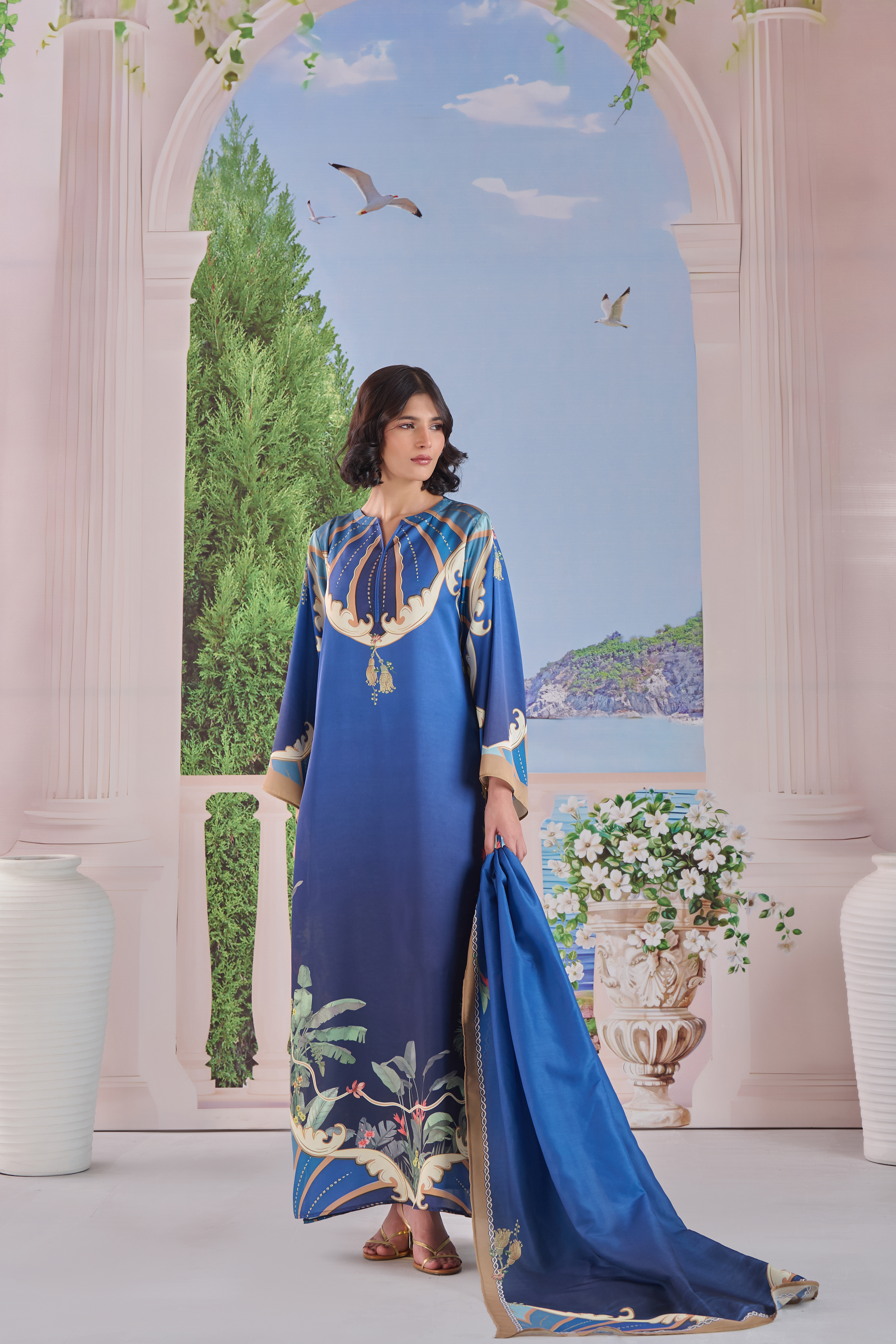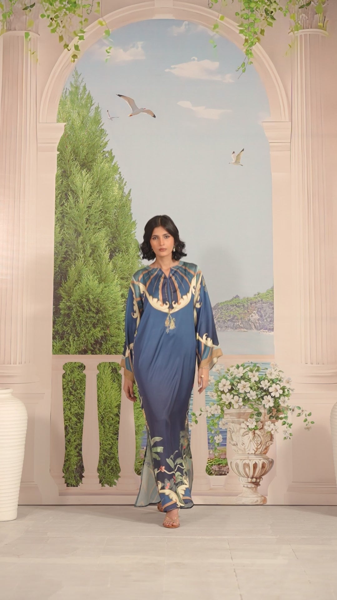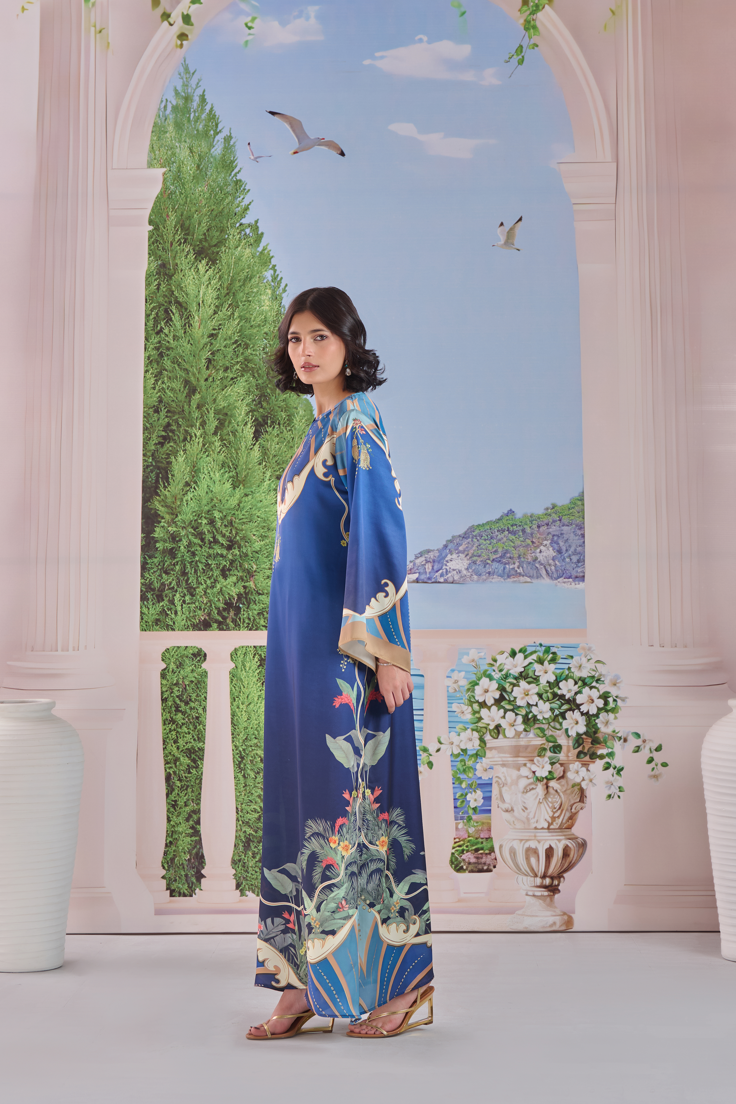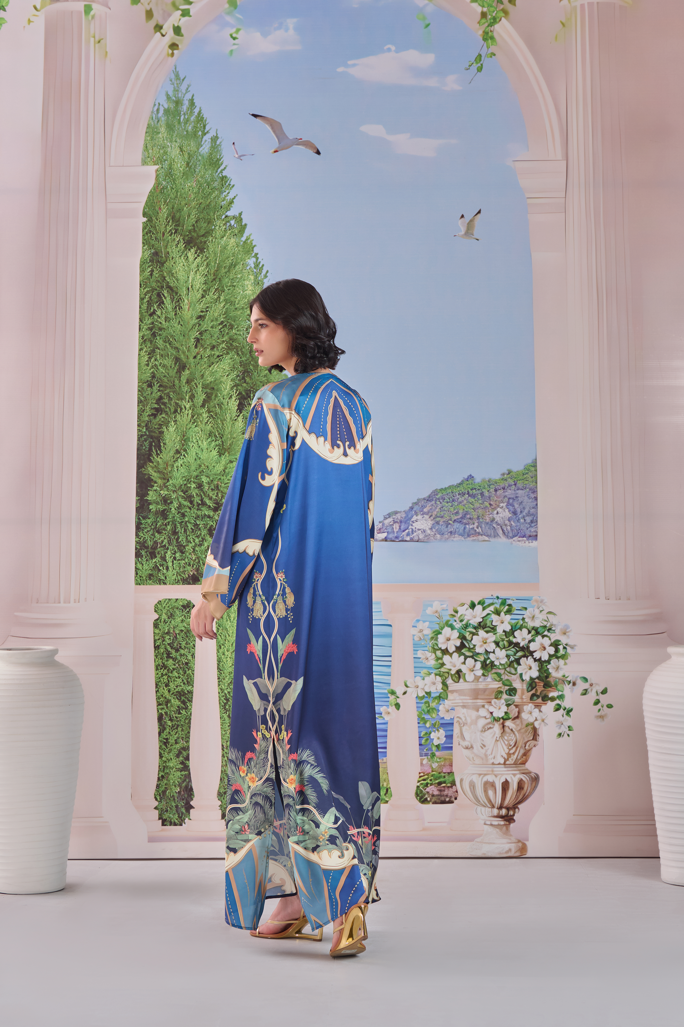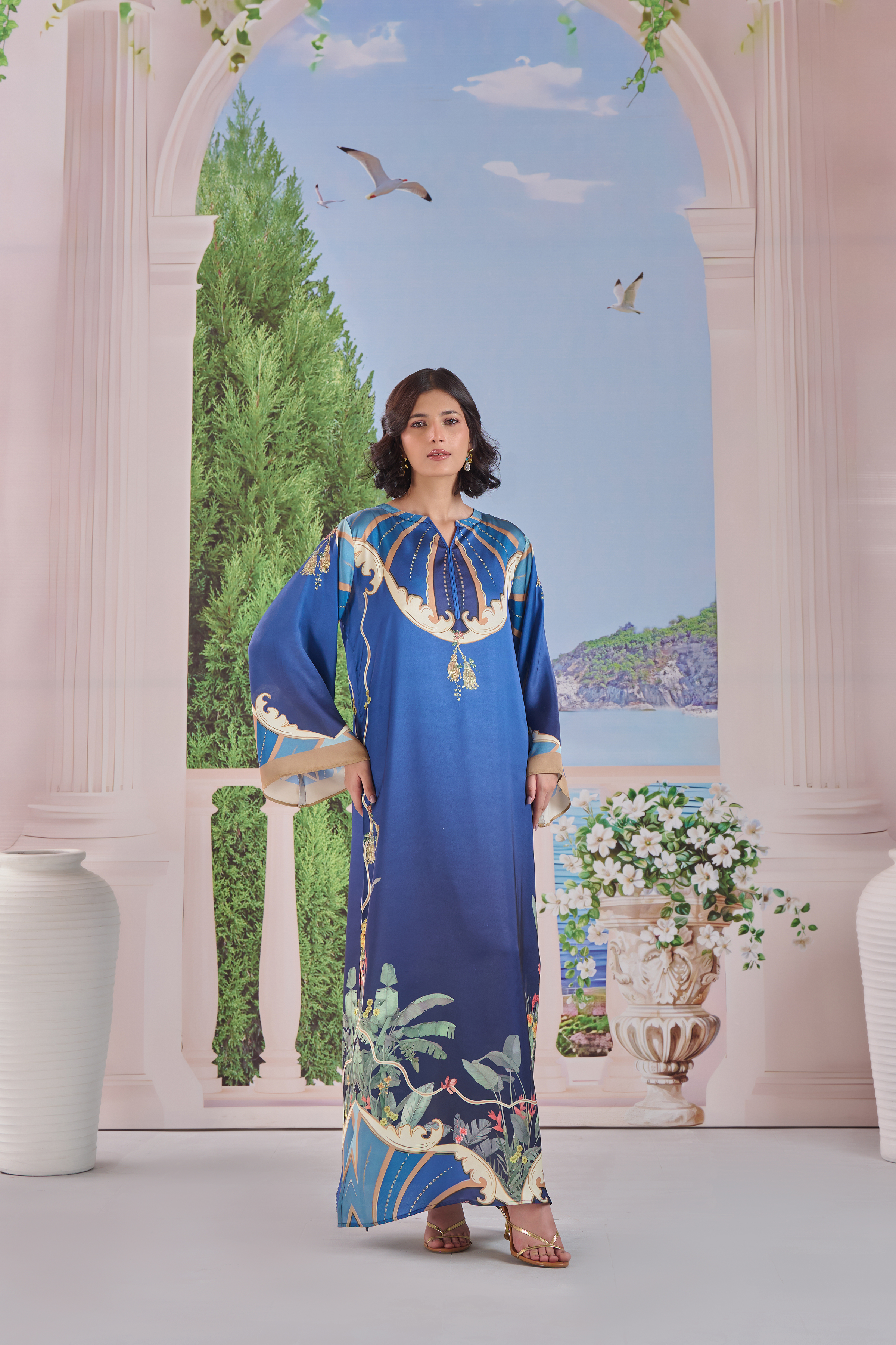 A fluid shamoise kaftaan that moves like a summer breeze. Featuring a serene blue-to-navy ombré base, this piece is elevated with an unconventional print placement that draws the eye downward to a tropical hem. Delicate floral hints and playful tassel accents add texture and charm, making it a statement of relaxed elegance—perfect for resort days and sunset evenings.