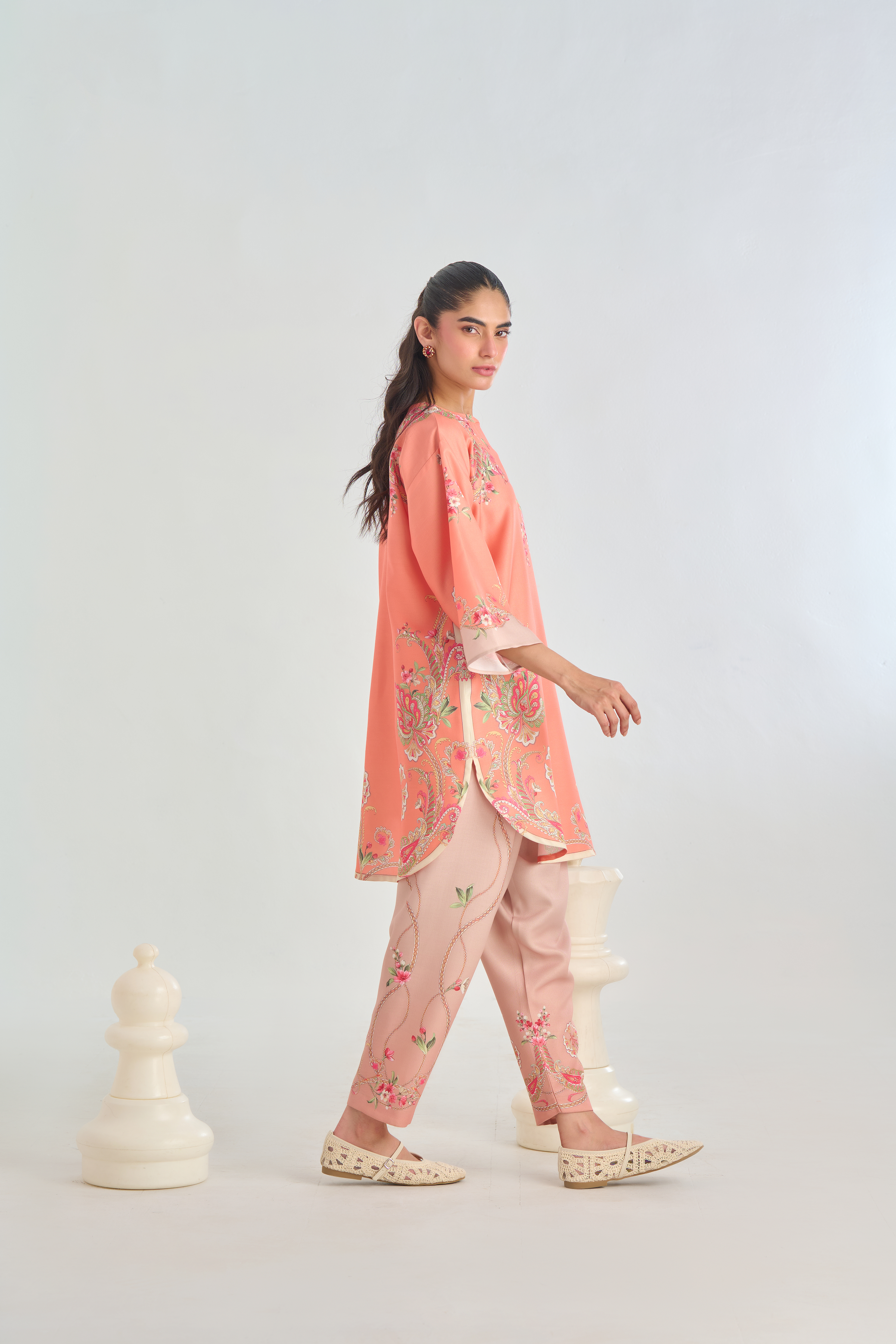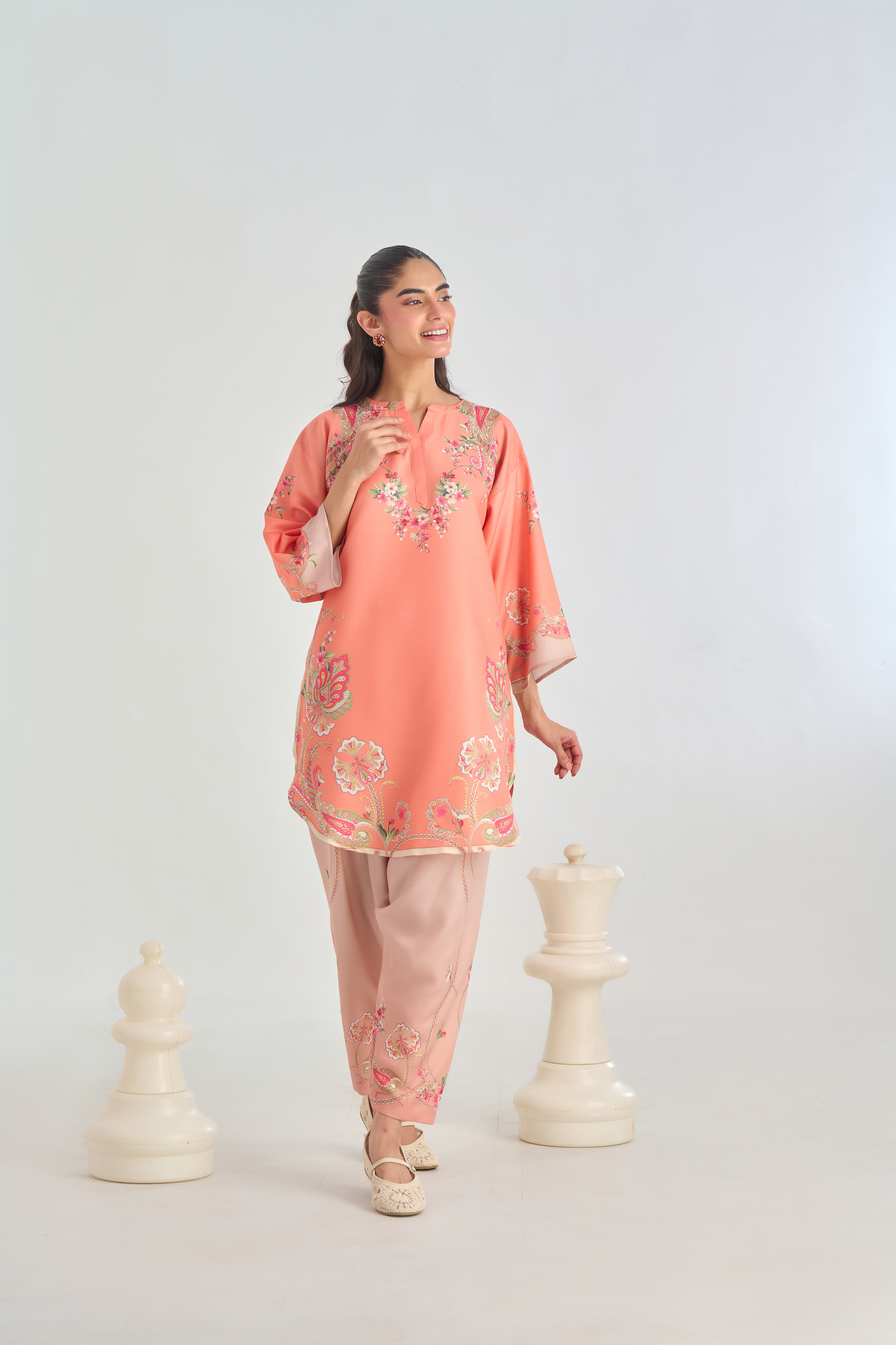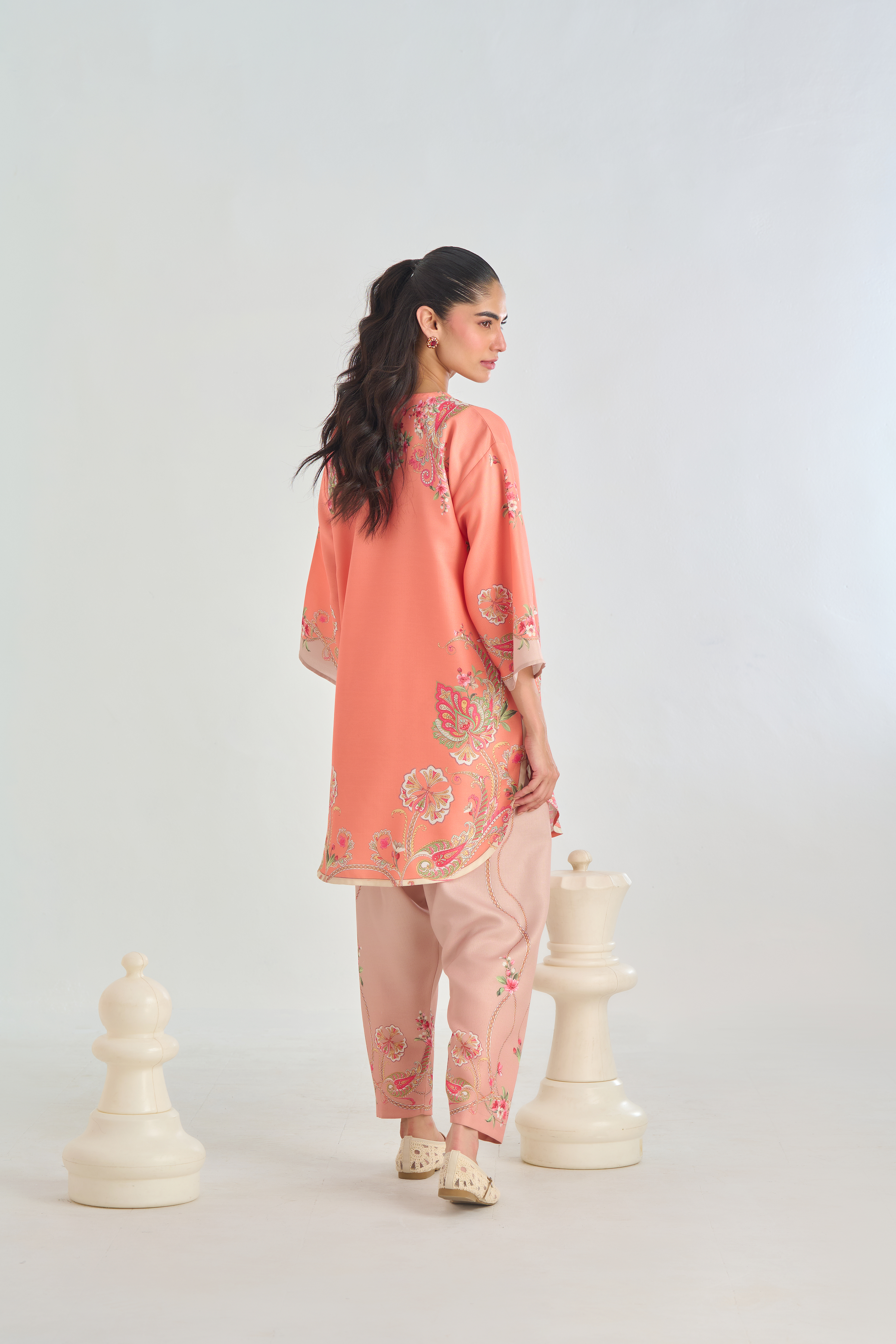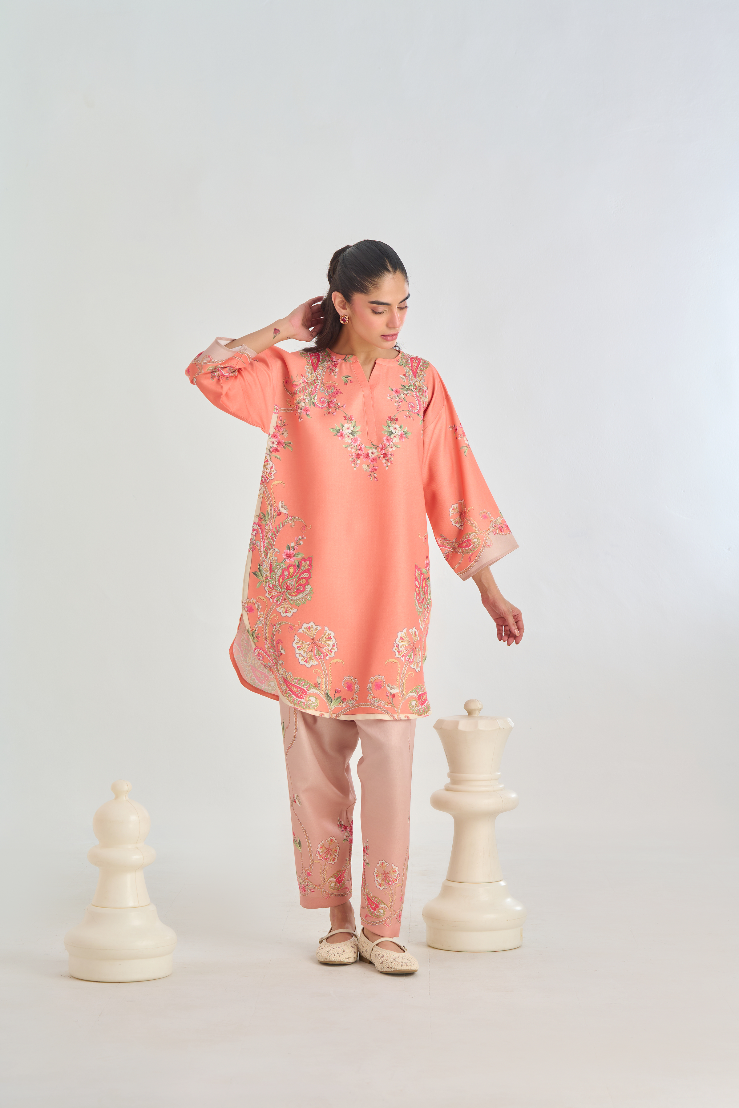 Description: Infuse classic charm with a modern twist in this Peach cord set, featuring a traditional paisley placement print in soft shades of pink, beige, and green. The intricate motifs bring a touch of heritage elegance, while the vibrant yet subtle colors add warmth and character. Crafted for both comfort and style.