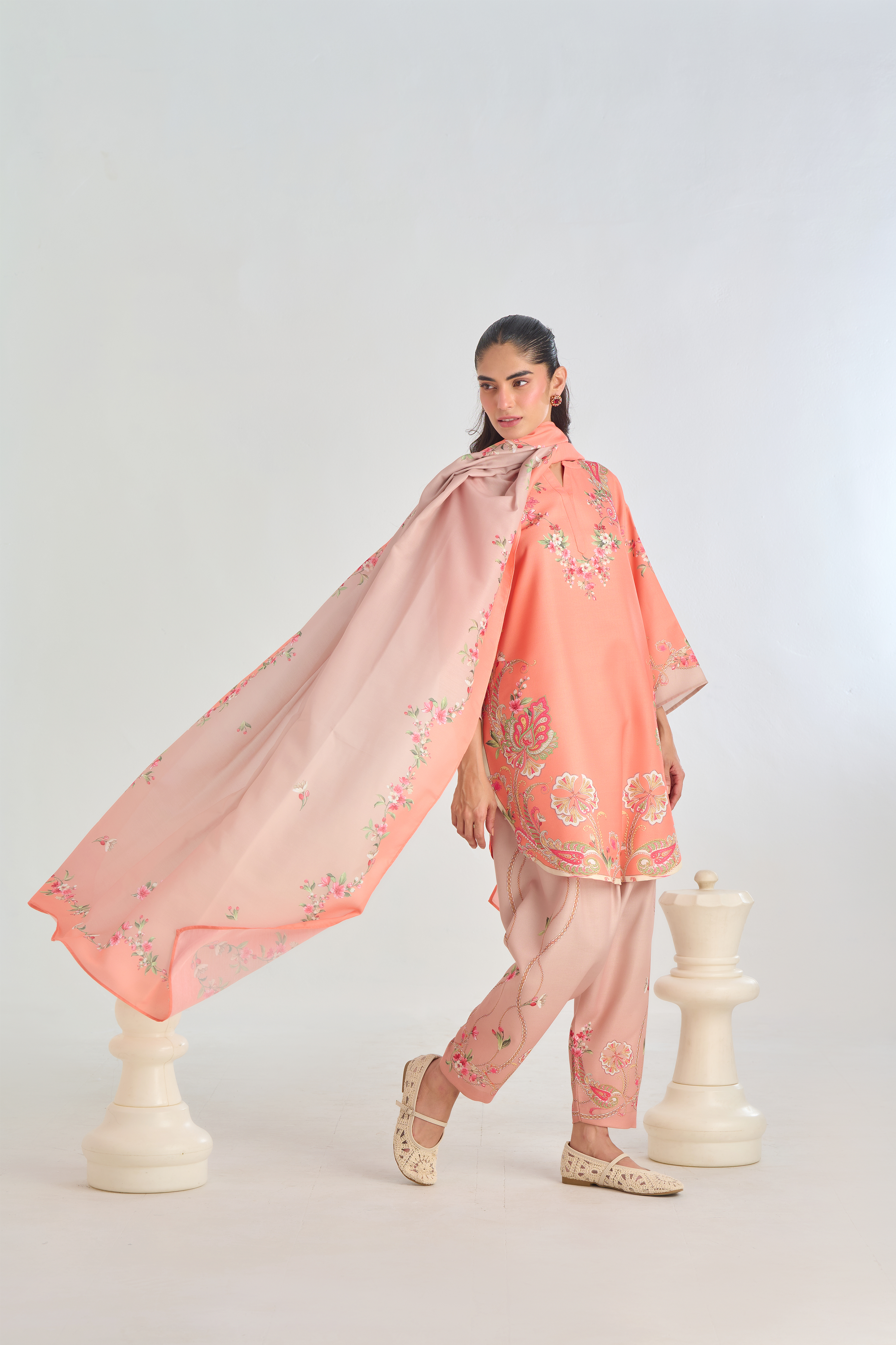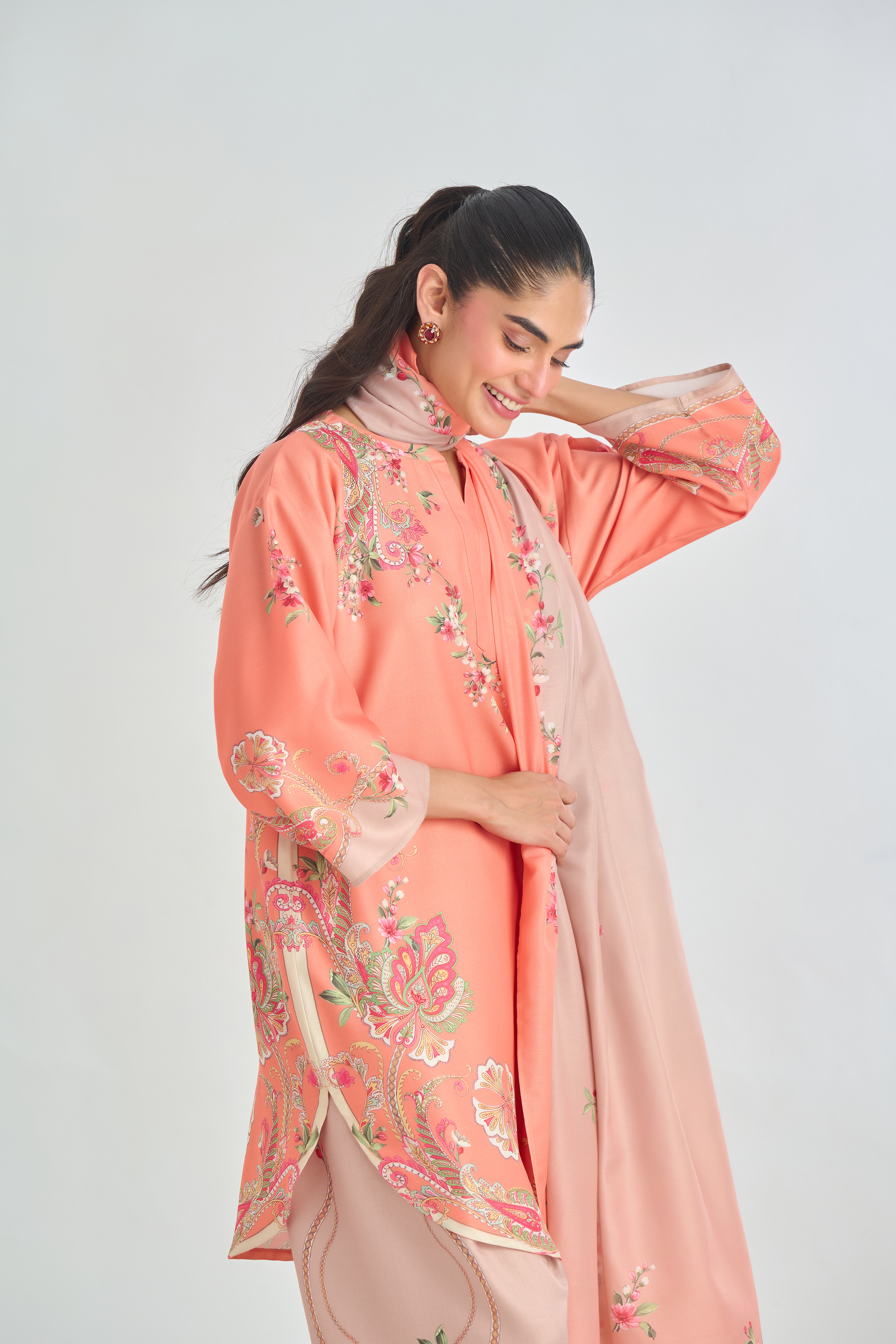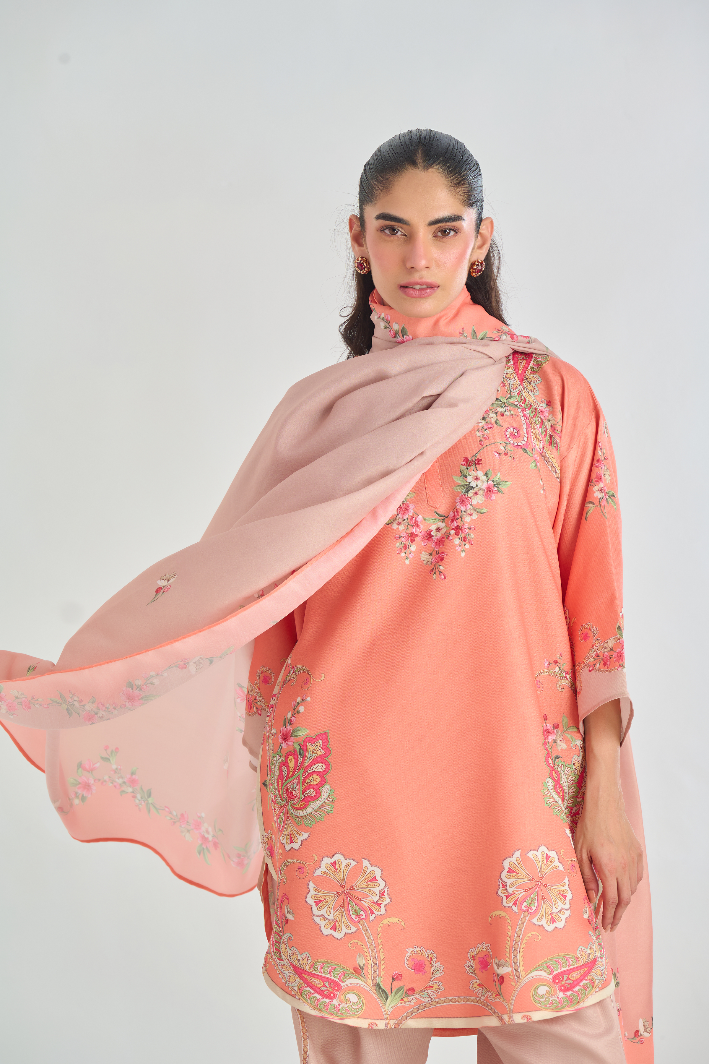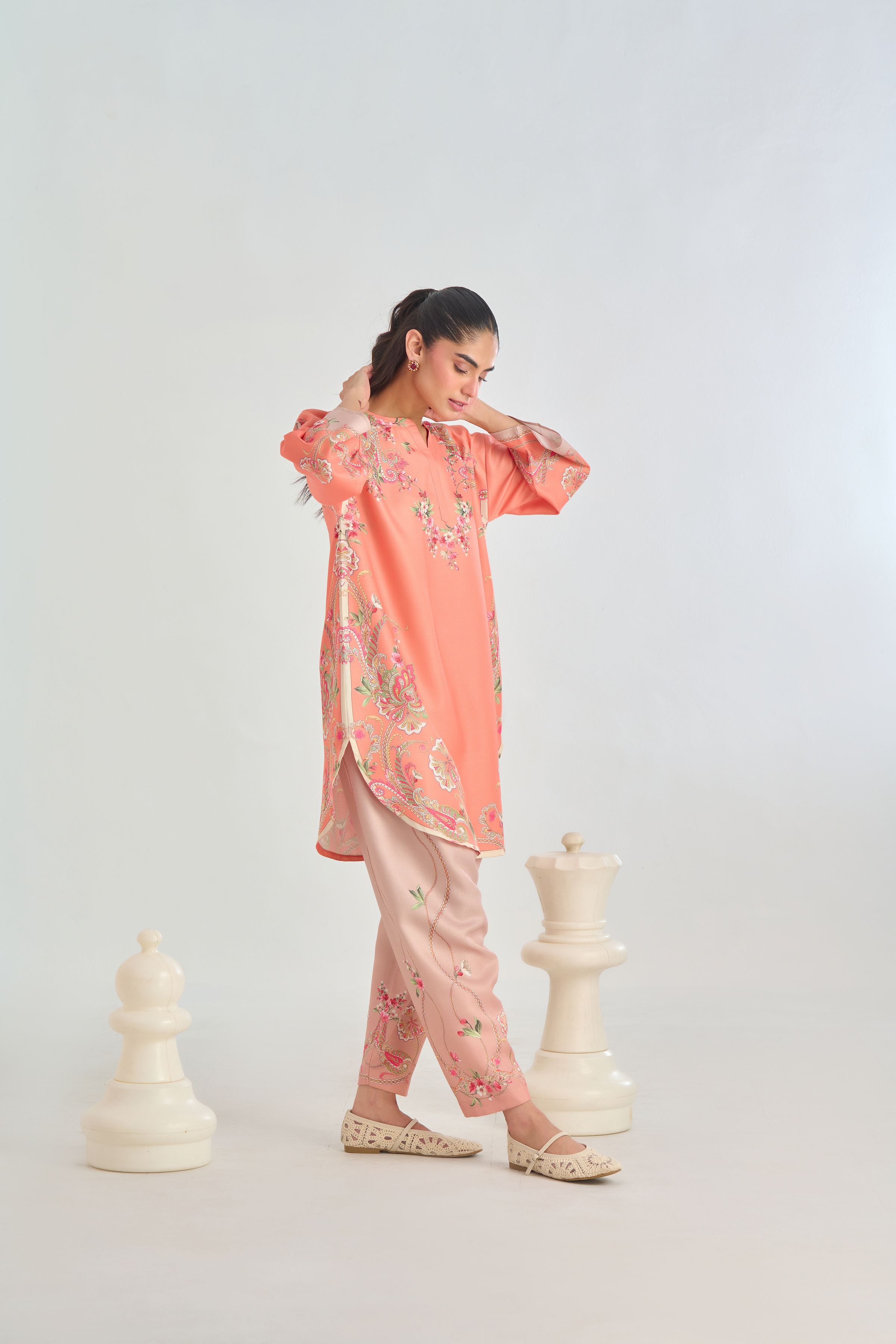 Description: Infuse classic charm with a modern twist in this Peach cord set, featuring a traditional paisley placement print in soft shades of pink, beige, and green. The intricate motifs bring a touch of heritage elegance, while the vibrant yet subtle colors add warmth and character. Crafted for both comfort and style.
