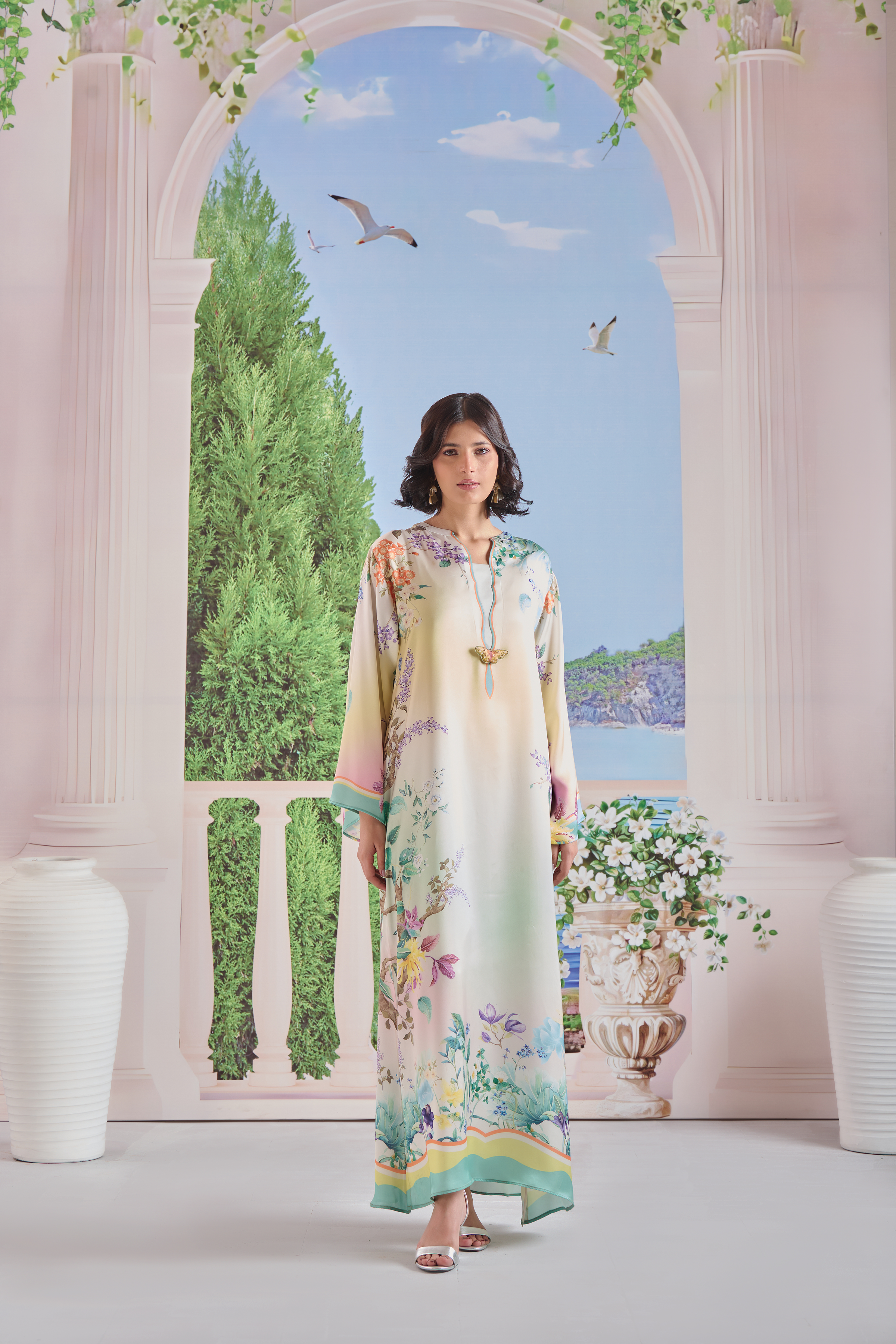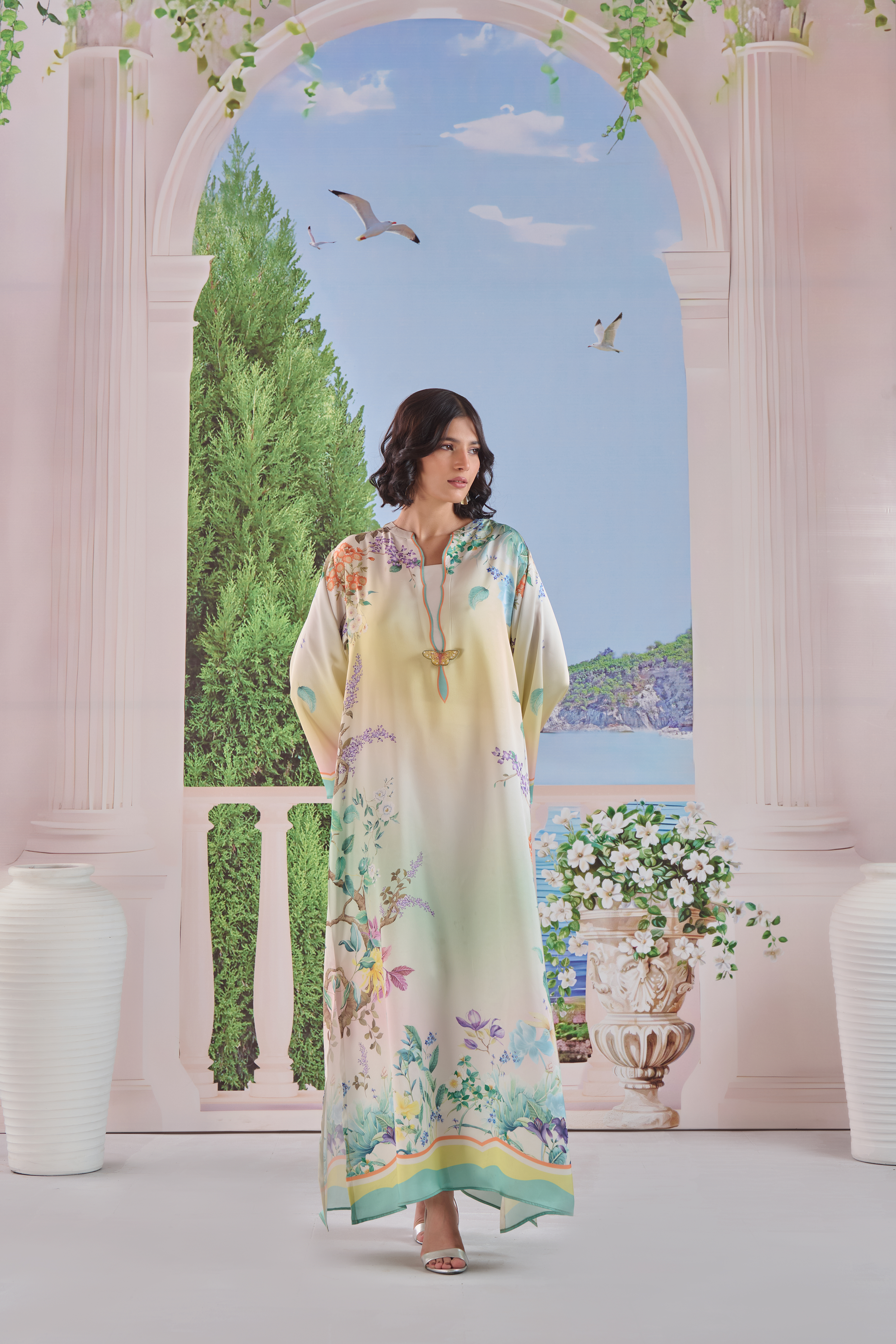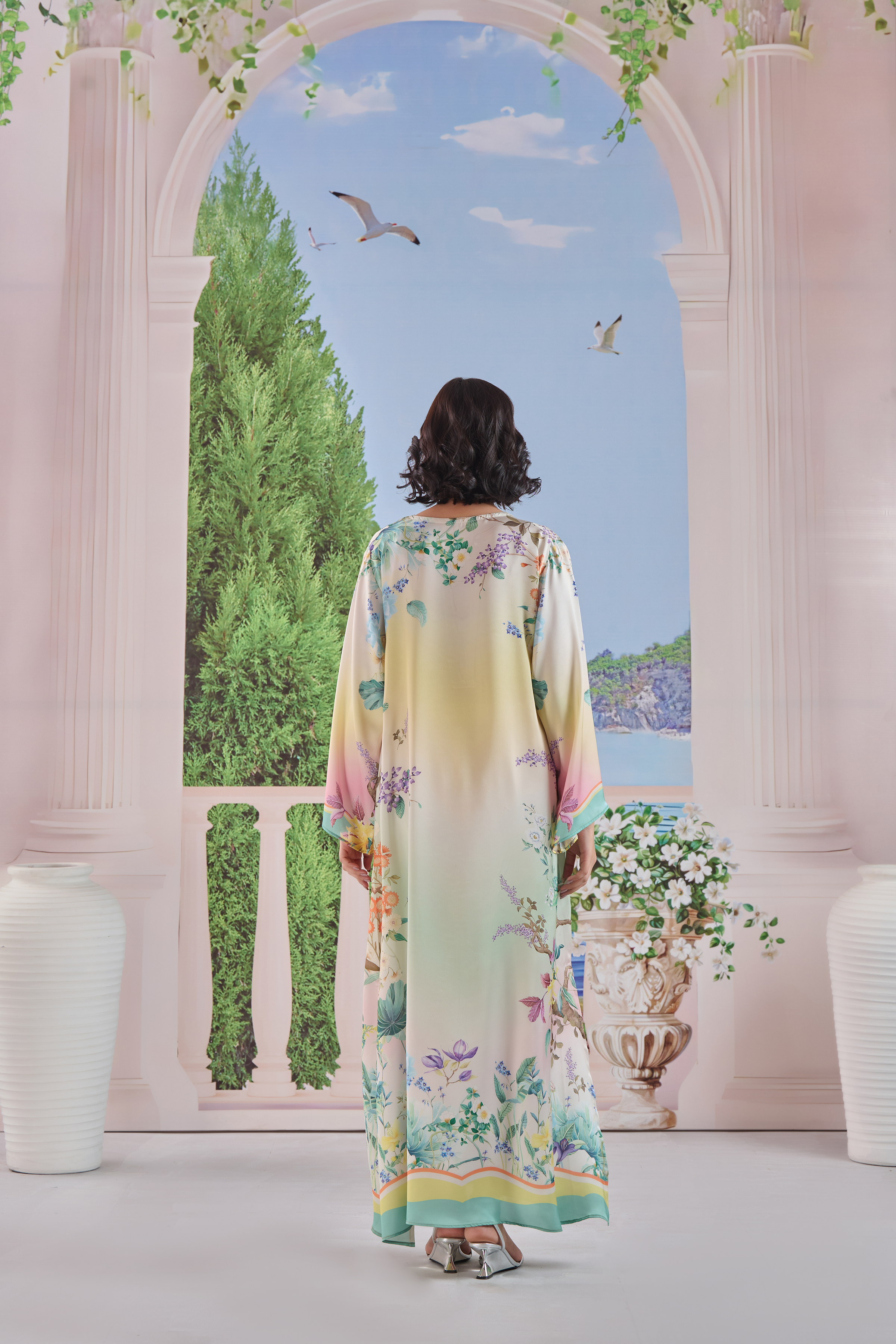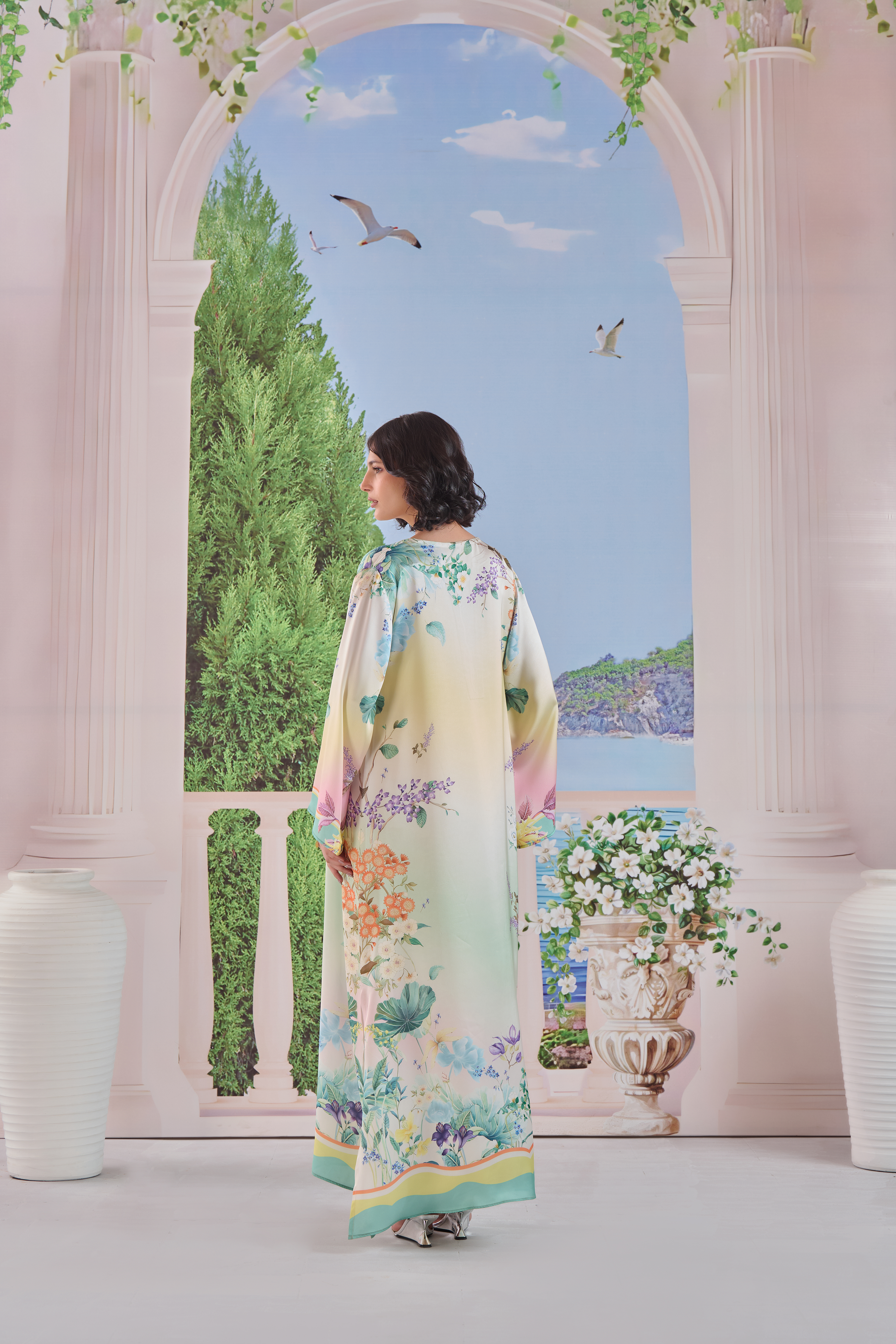The Petal Veil Kaftaan floats in delicate shamoise, washed in gentle pastel ombré tones. Hand-illustrated floral botanicals accent the sides and hem, creating a soft, romantic visual story. Effortless and graceful, it’s a timeless addition for those who love subtle drama and fluid silhouettes.