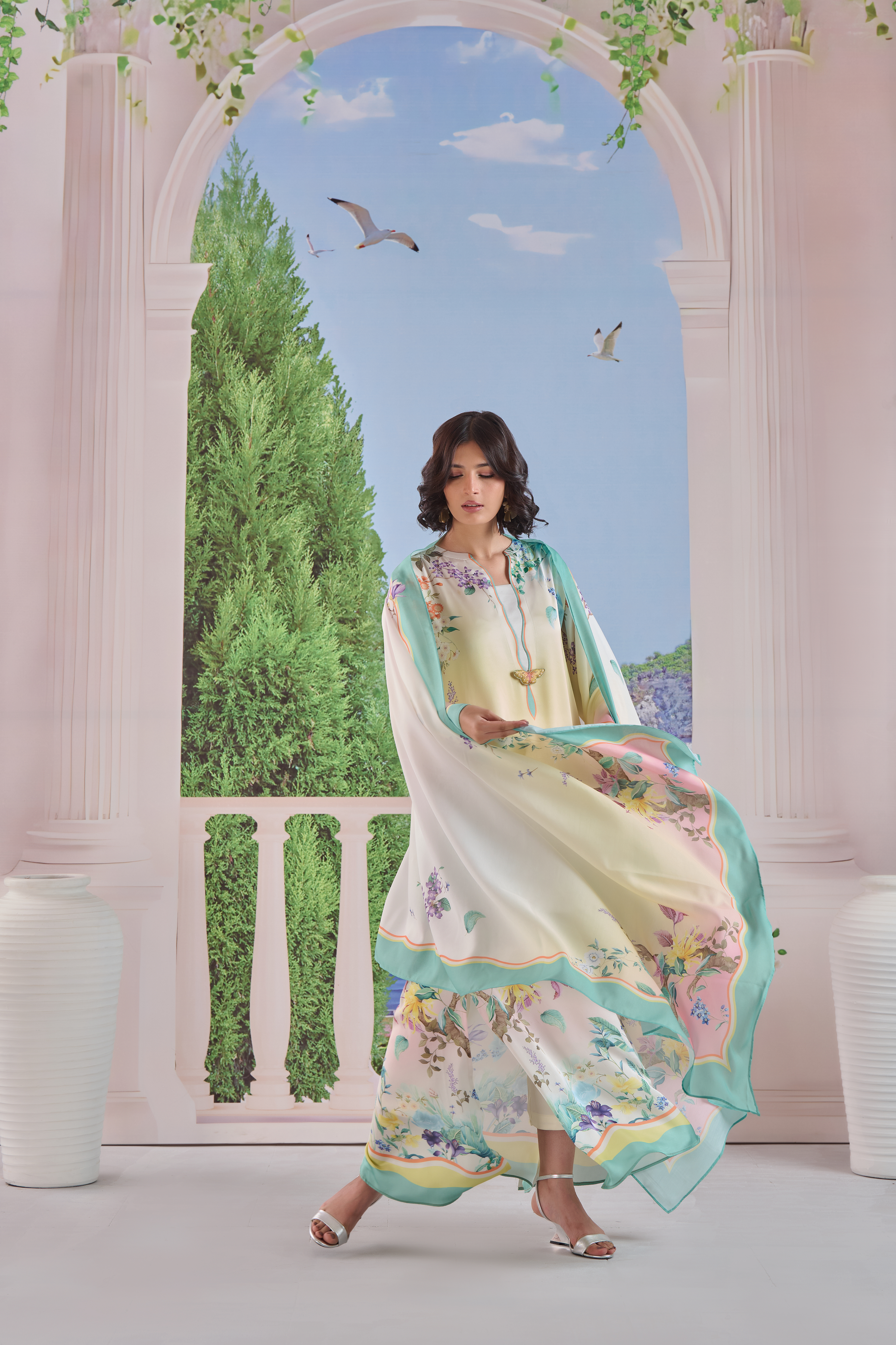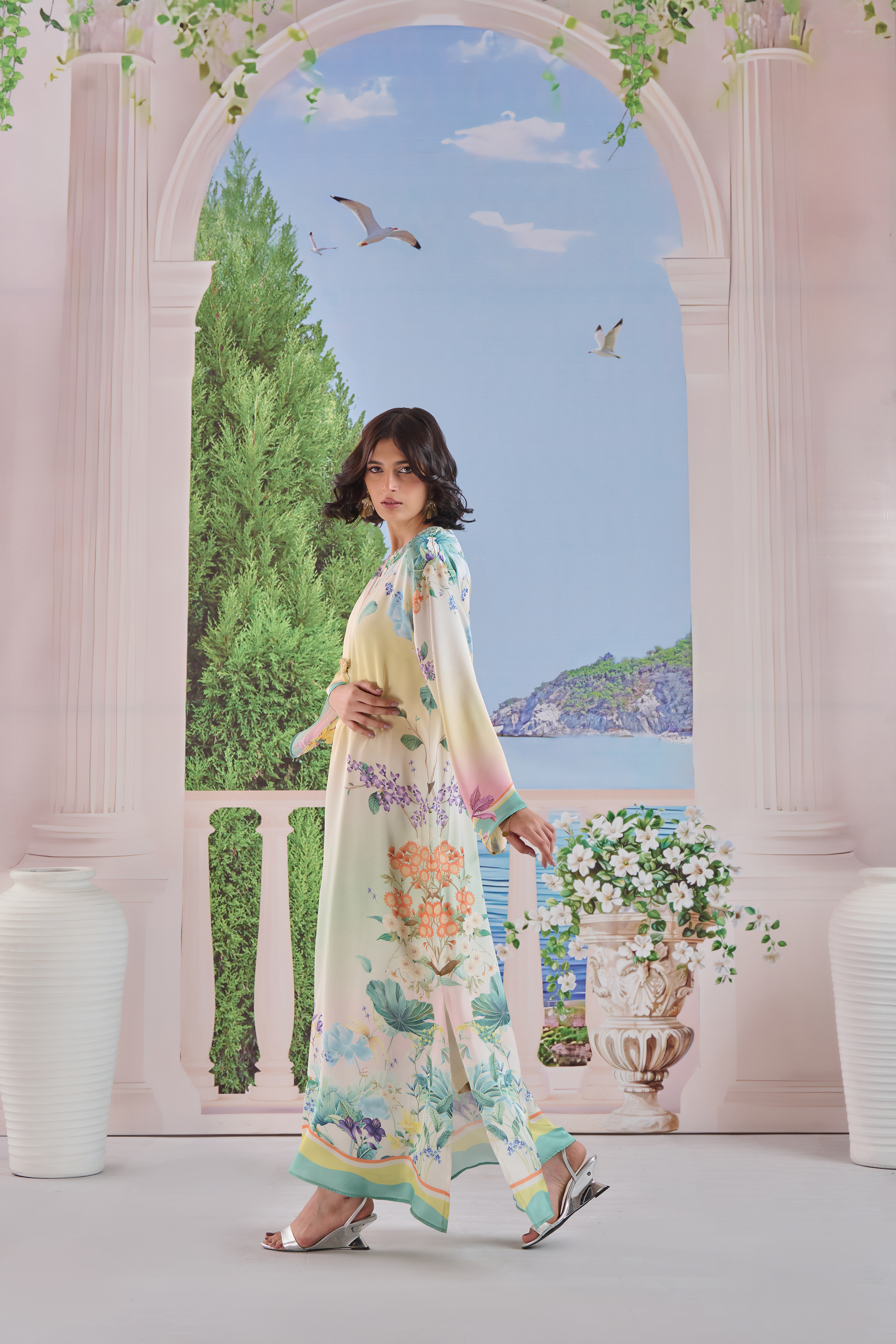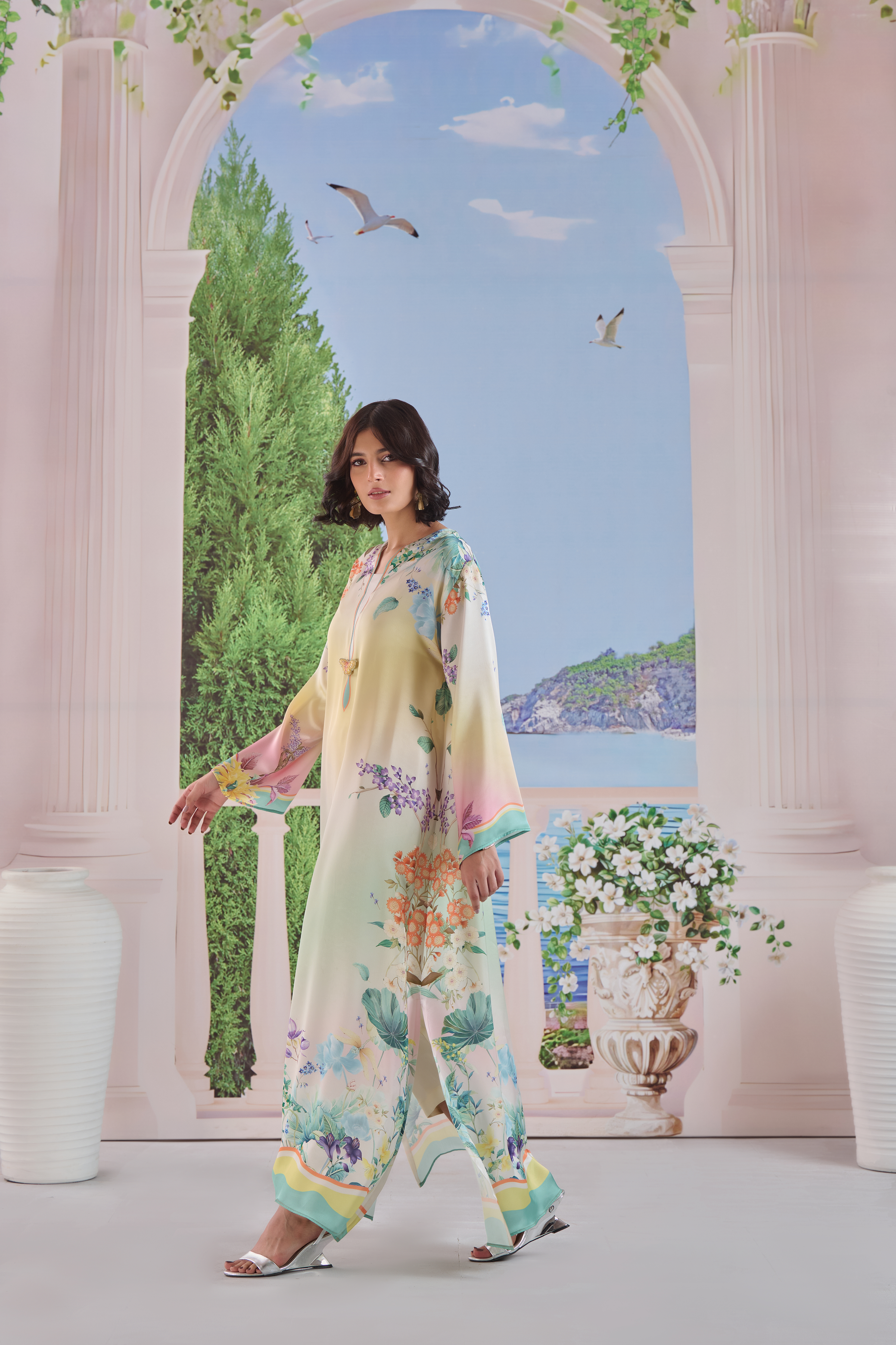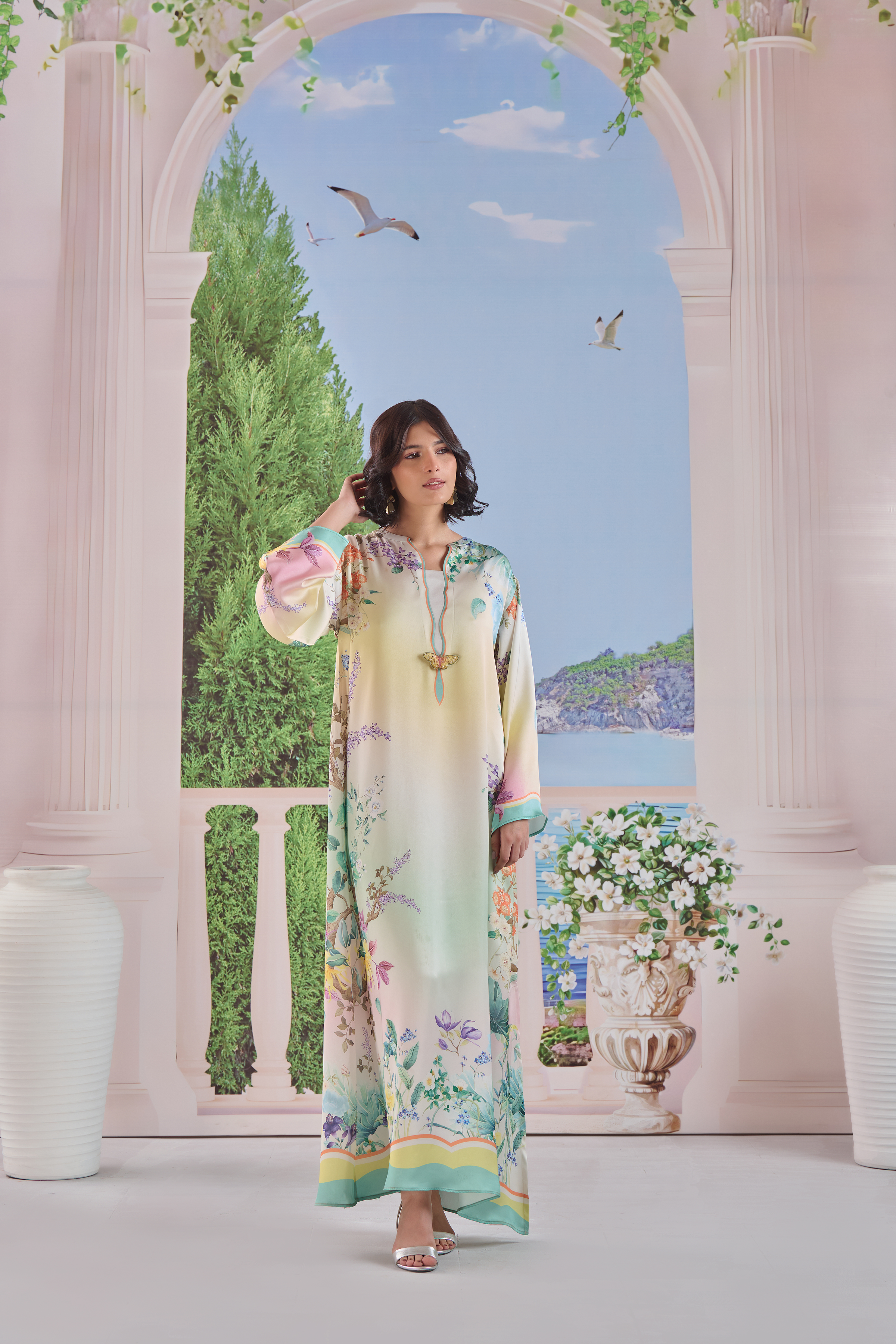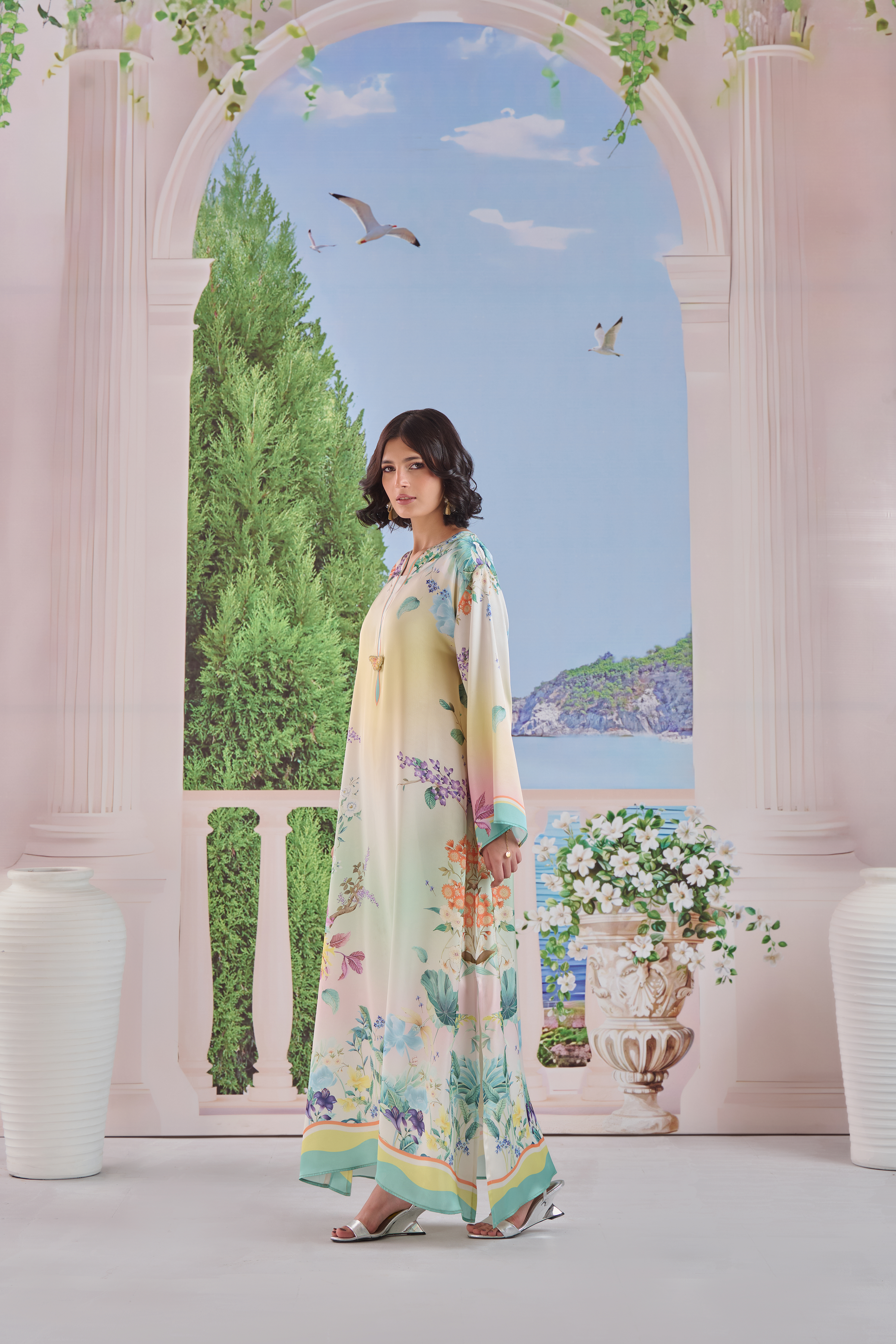 The Petal Veil Kaftaan floats in delicate shamoise, washed in gentle pastel ombré tones. Hand-illustrated floral botanicals accent the sides and hem, creating a soft, romantic visual story. Effortless and graceful, it’s a timeless addition for those who love subtle drama and fluid silhouettes.