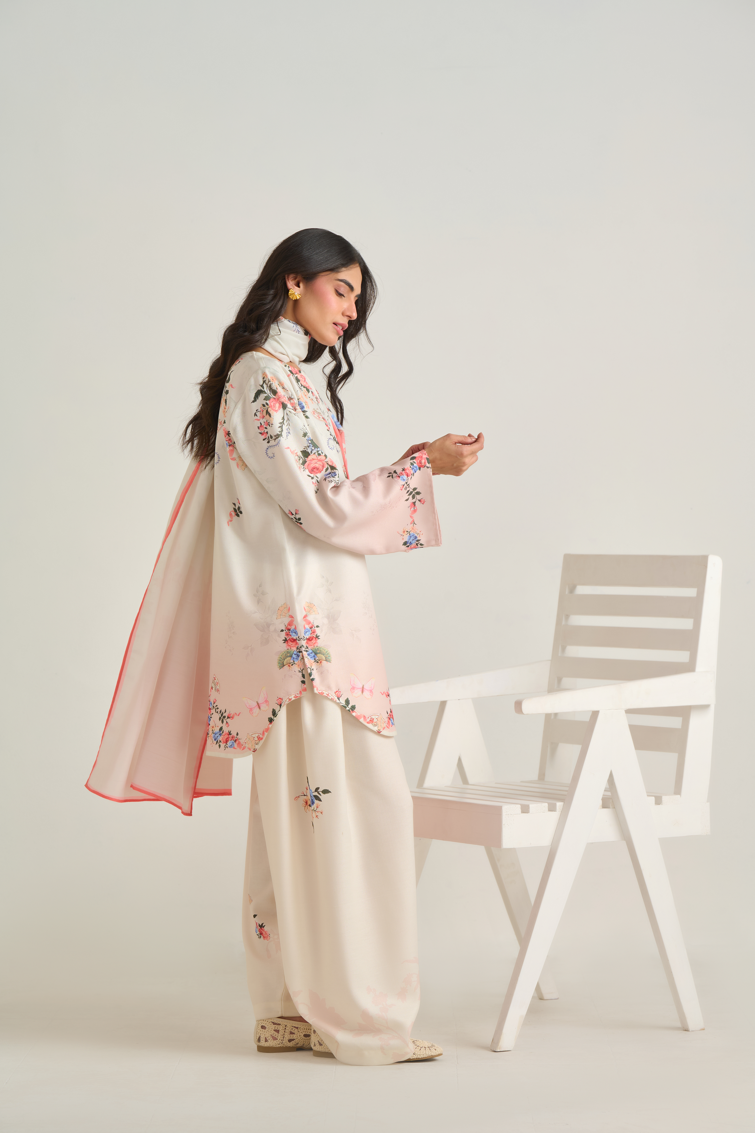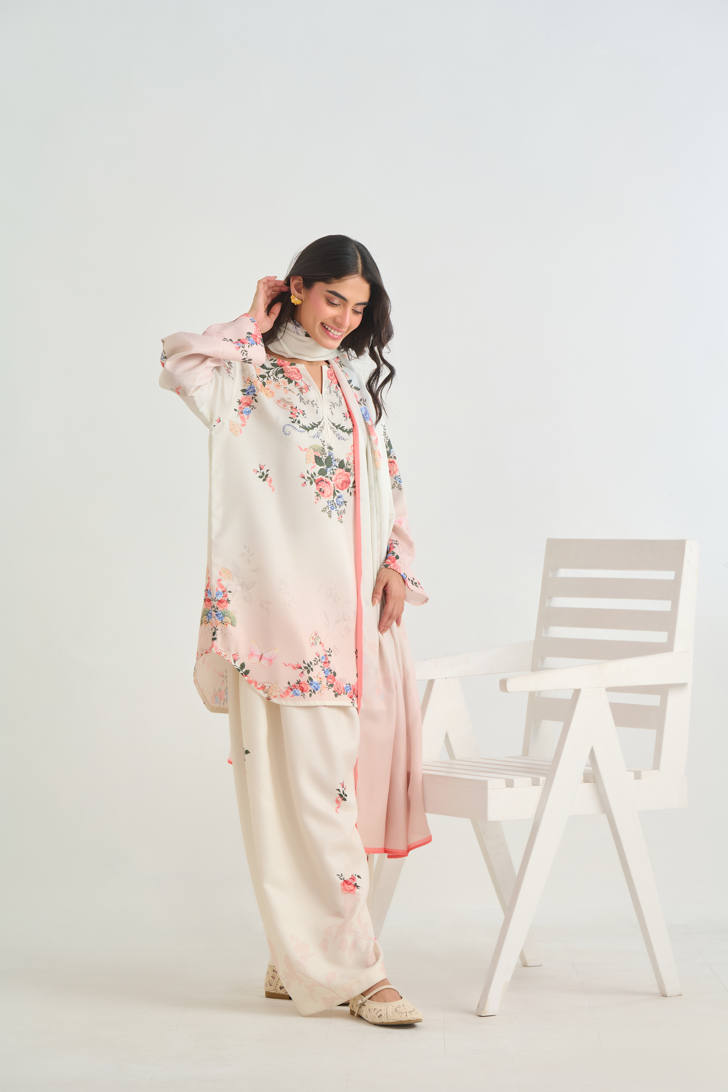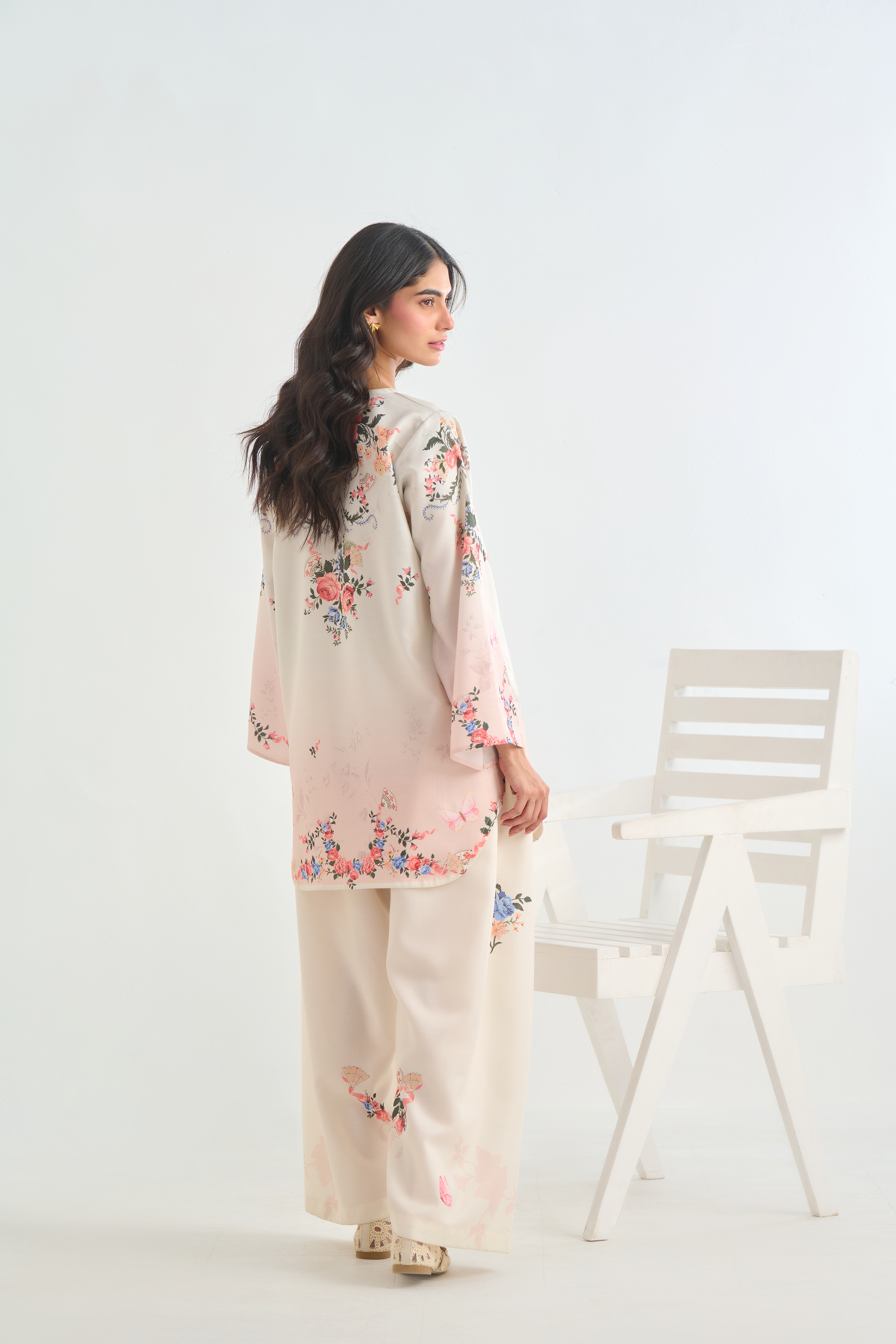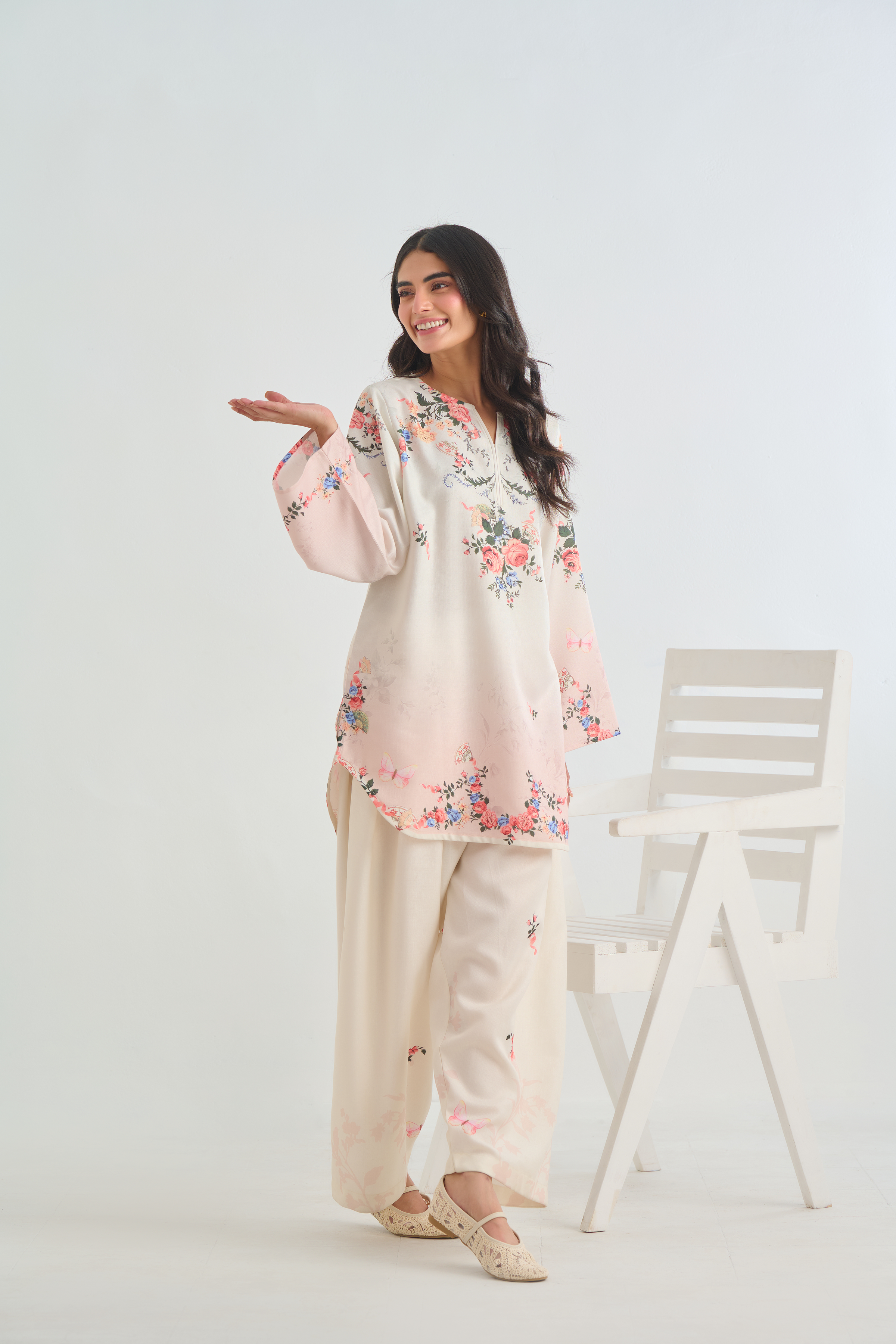 Description: The shirt adorns a botanical floral design with clusters of roses, foliage, and tiny butterflies scattered gracefully on offwhite base with hint of blush ombre. The color palette includes shades of soft peach, rose pink, and ivory, lending a delicate, feminine feel.