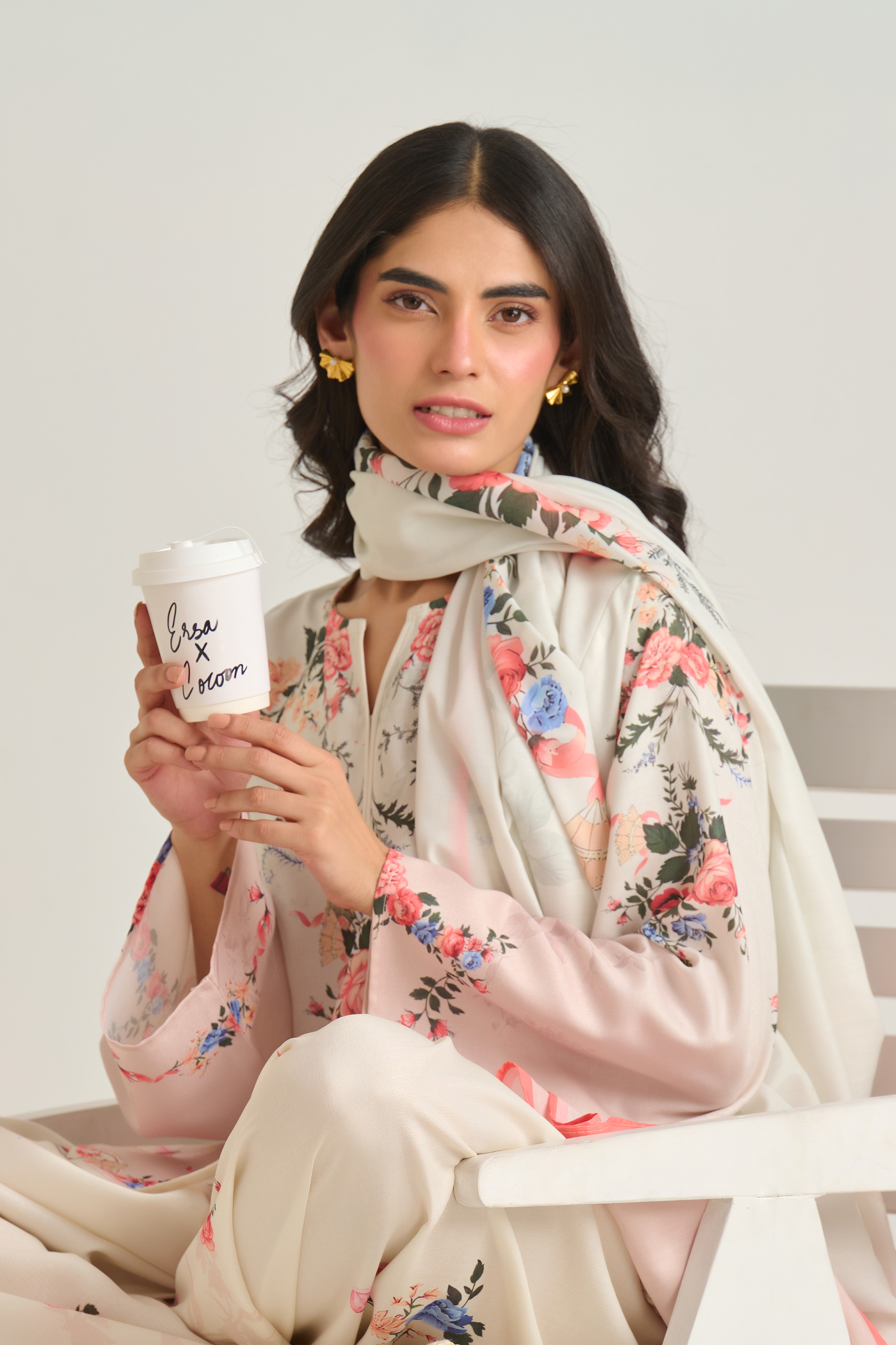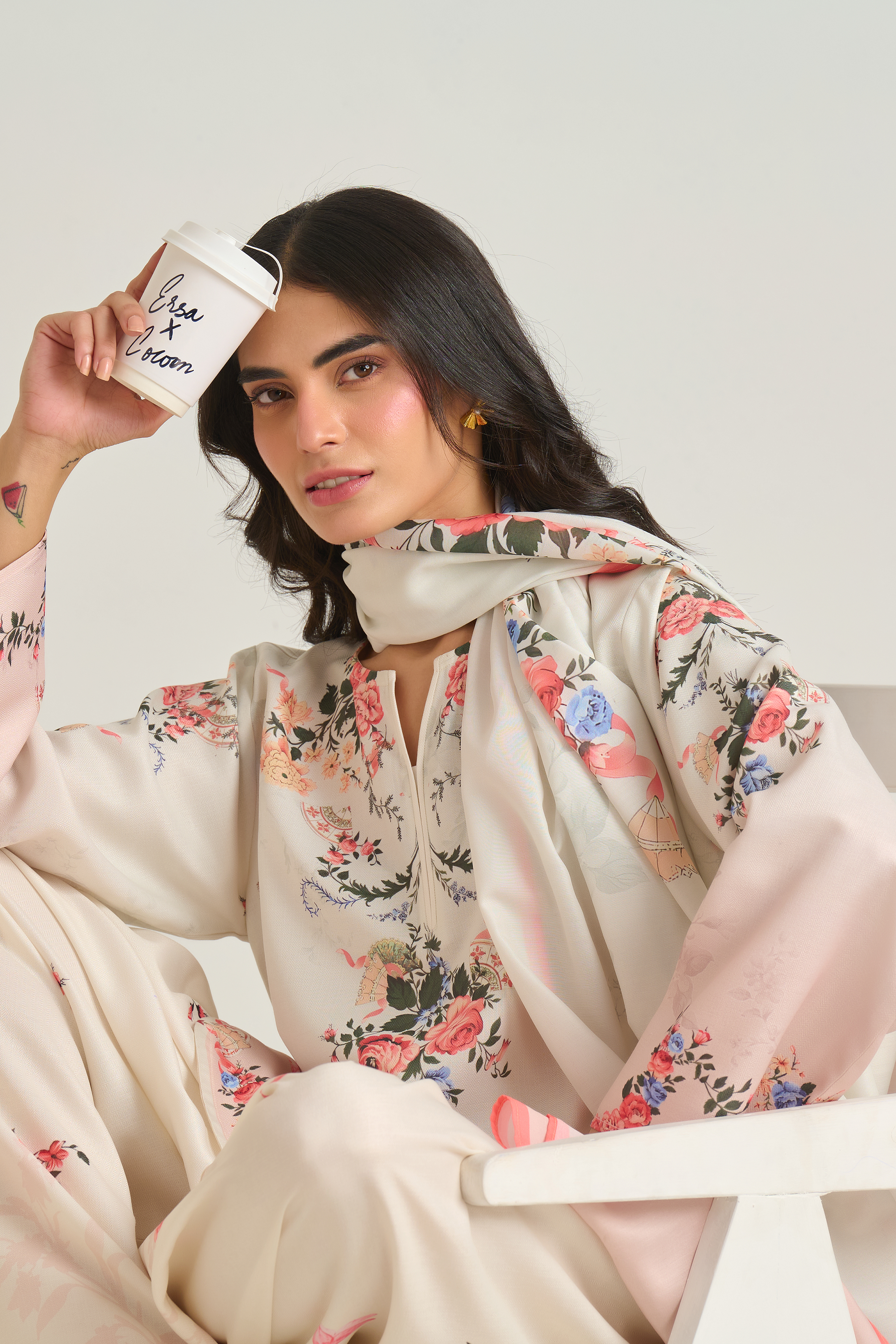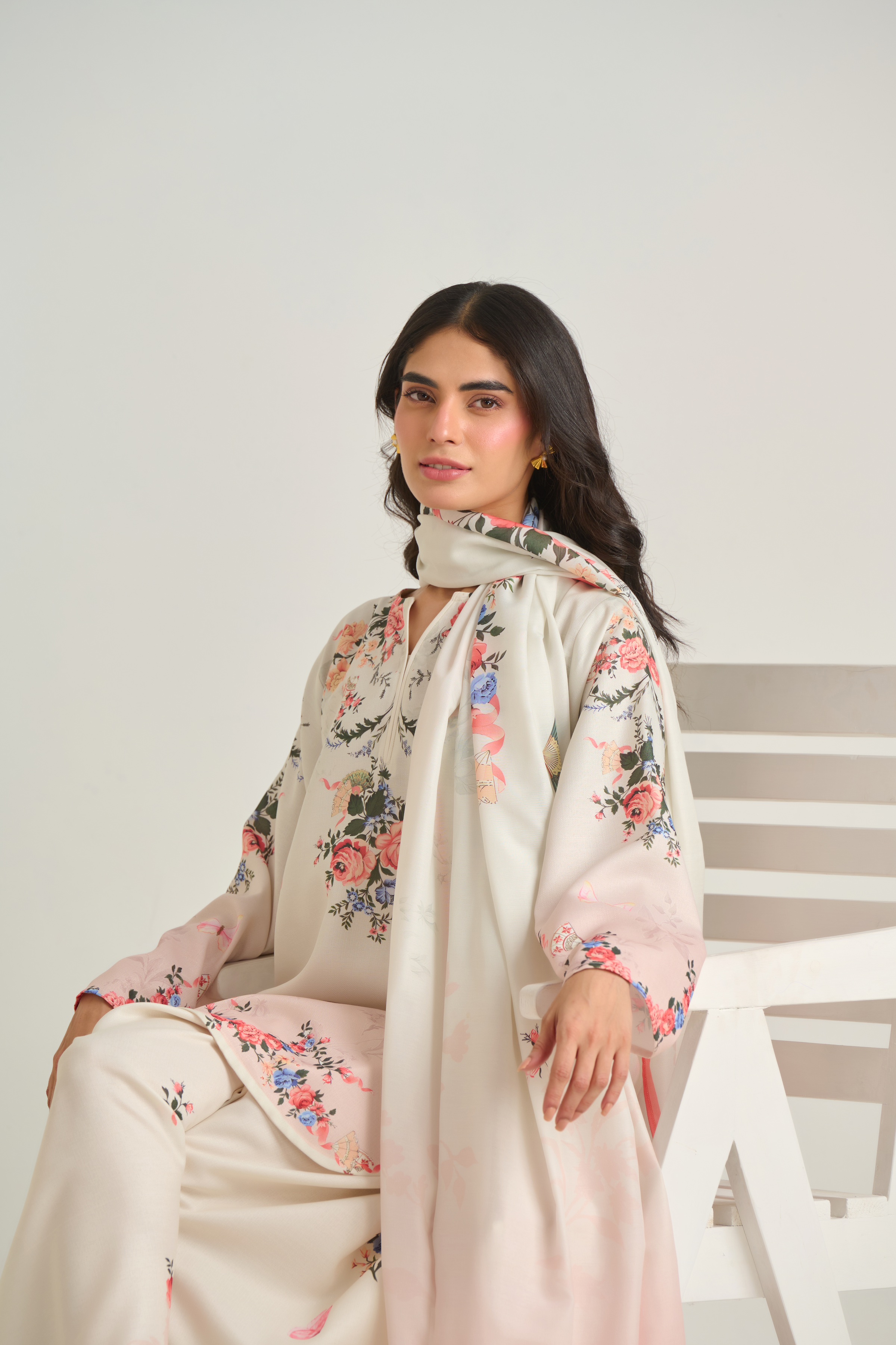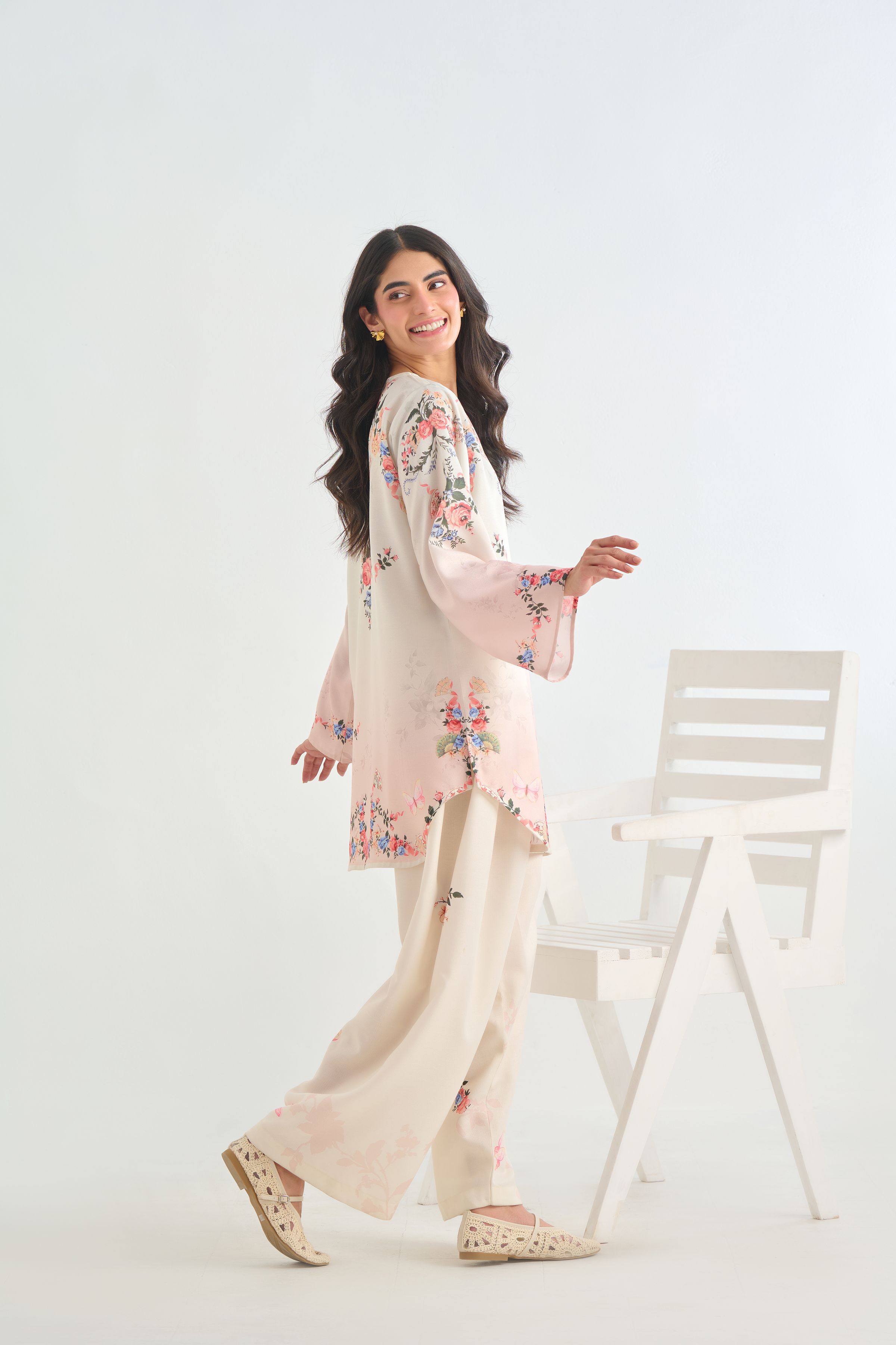Description: The shirt adorns a botanical floral design with clusters of roses, foliage, and tiny butterflies scattered gracefully on offwhite base with hint of blush ombre. The color palette includes shades of soft peach, rose pink, and ivory, lending a delicate, feminine feel.