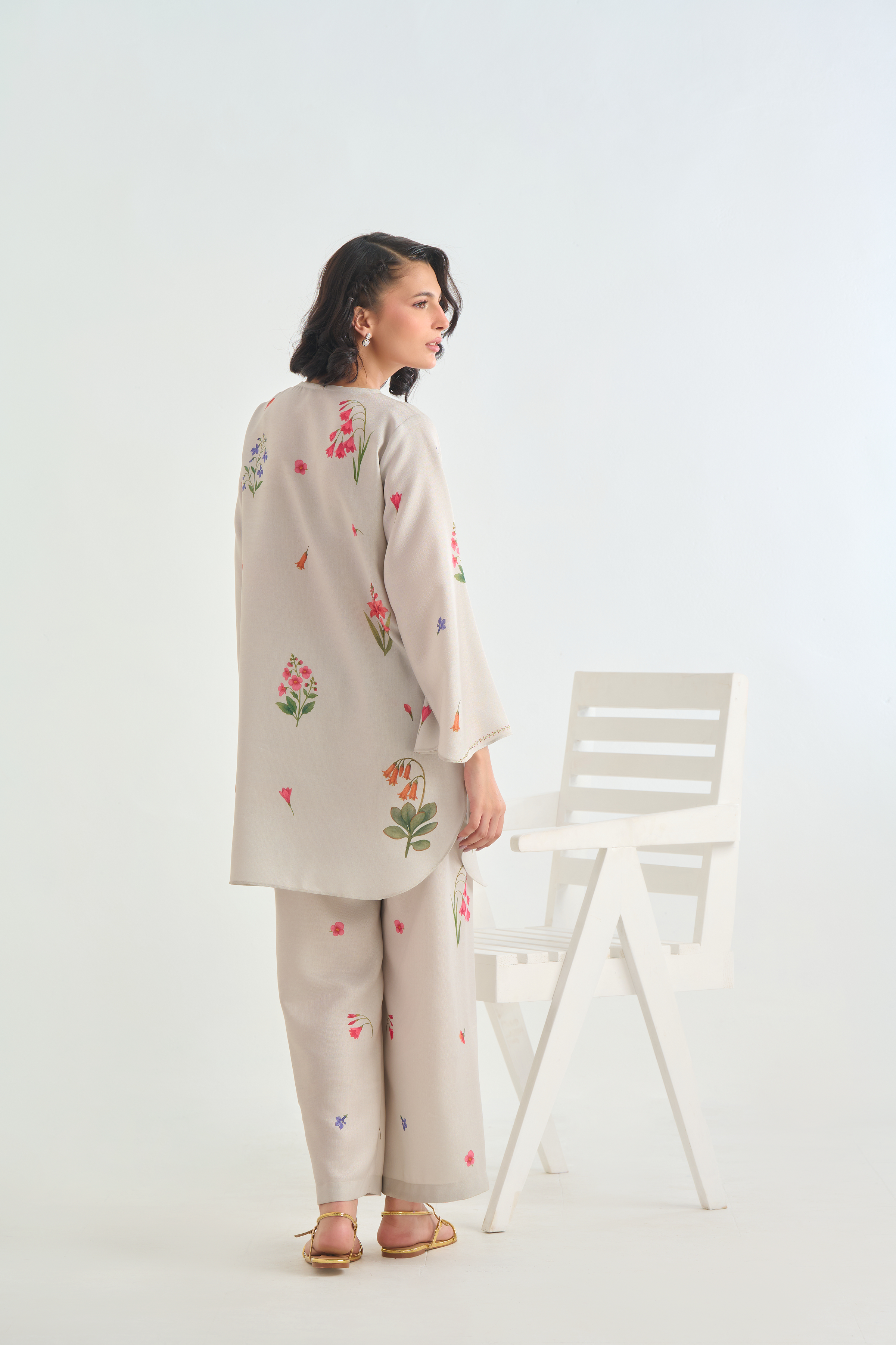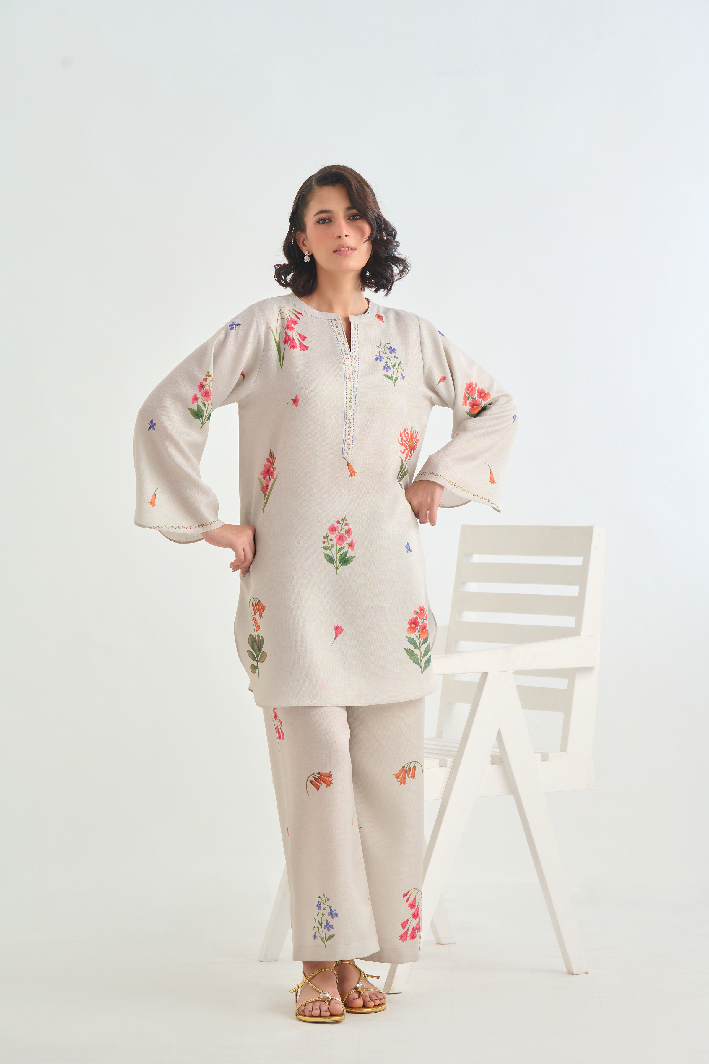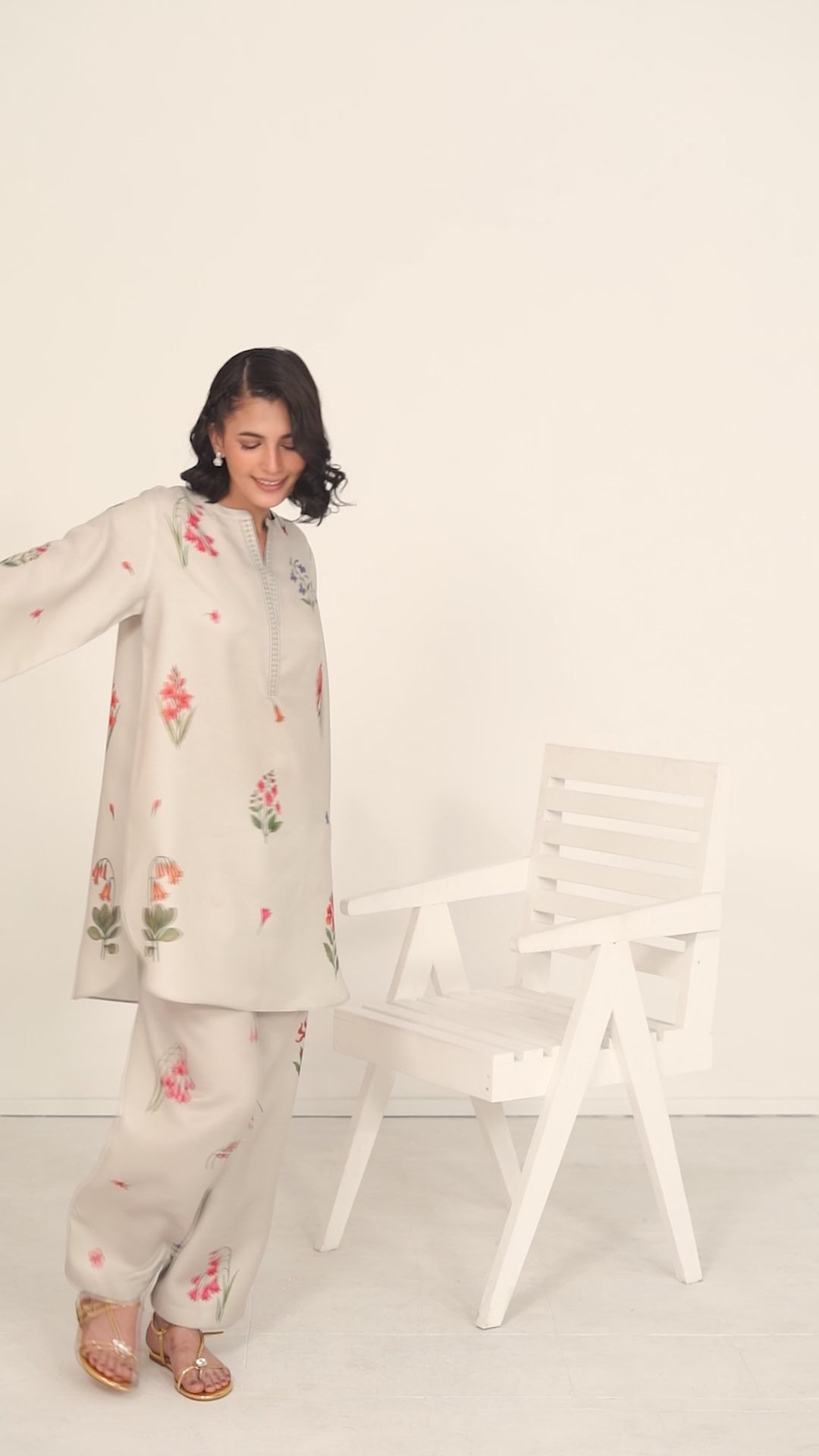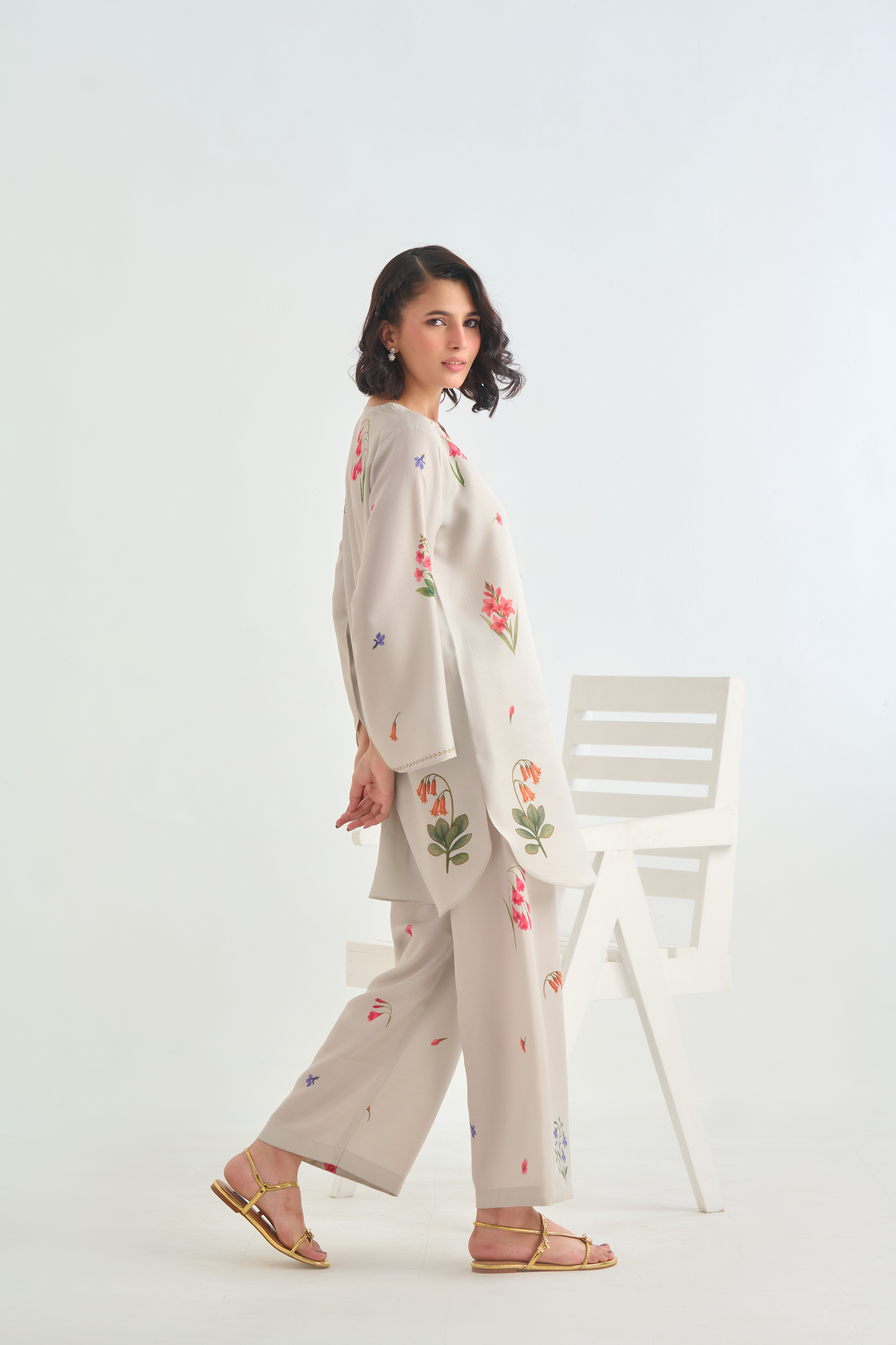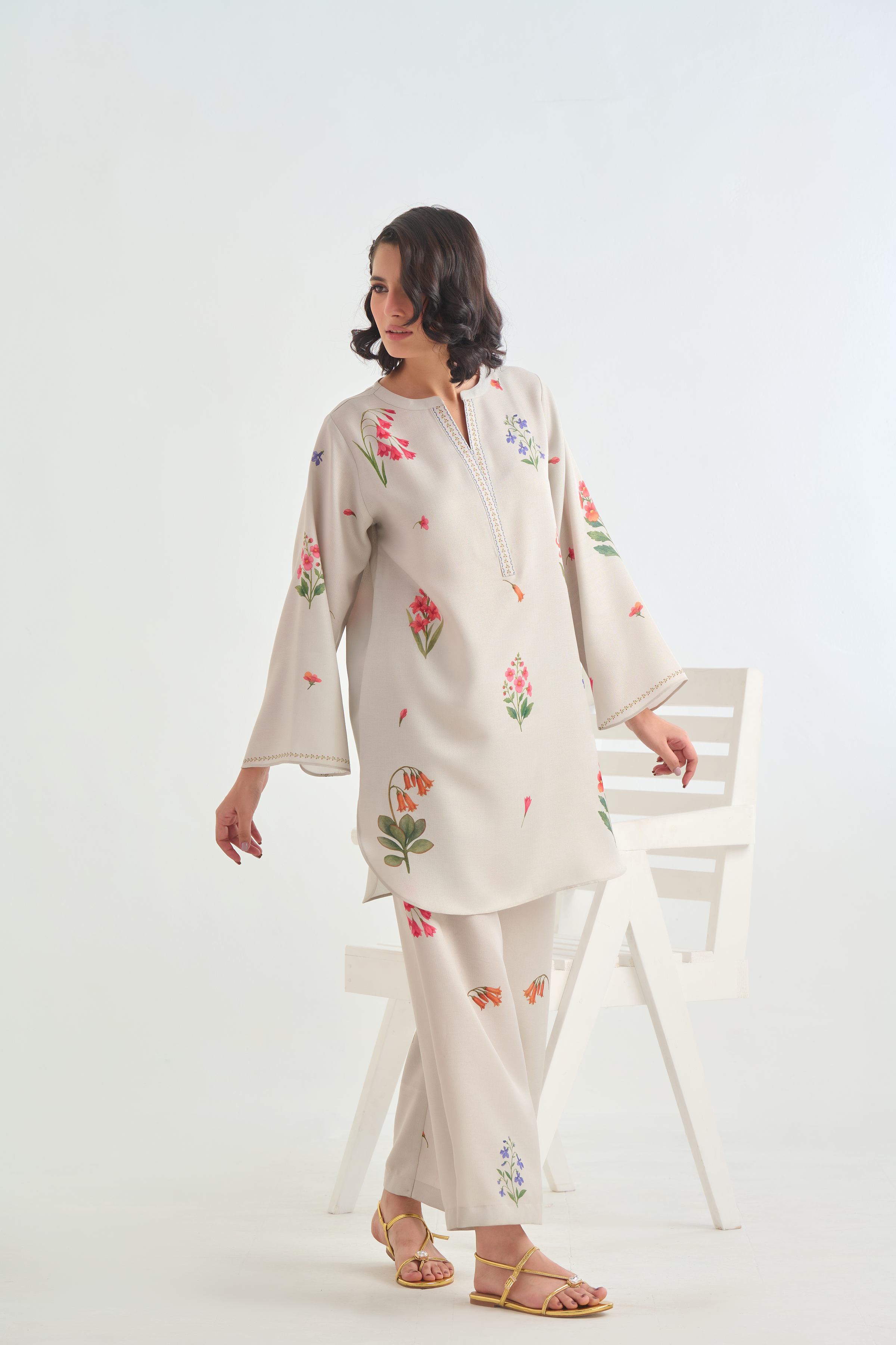 Description: Elevate your wardrobe with this exquisite ivory cord set, thoughtfully designed for both comfort and style. The ensemble features a shirt and matching trousers, beautifully adorned with scattered multi-colour botanical motifs that add a touch of natural elegance.