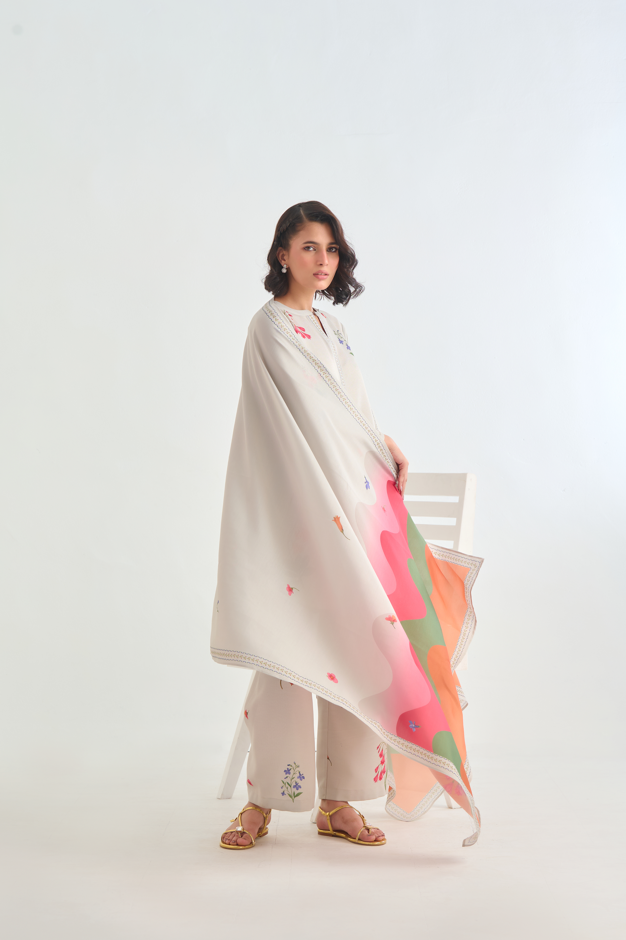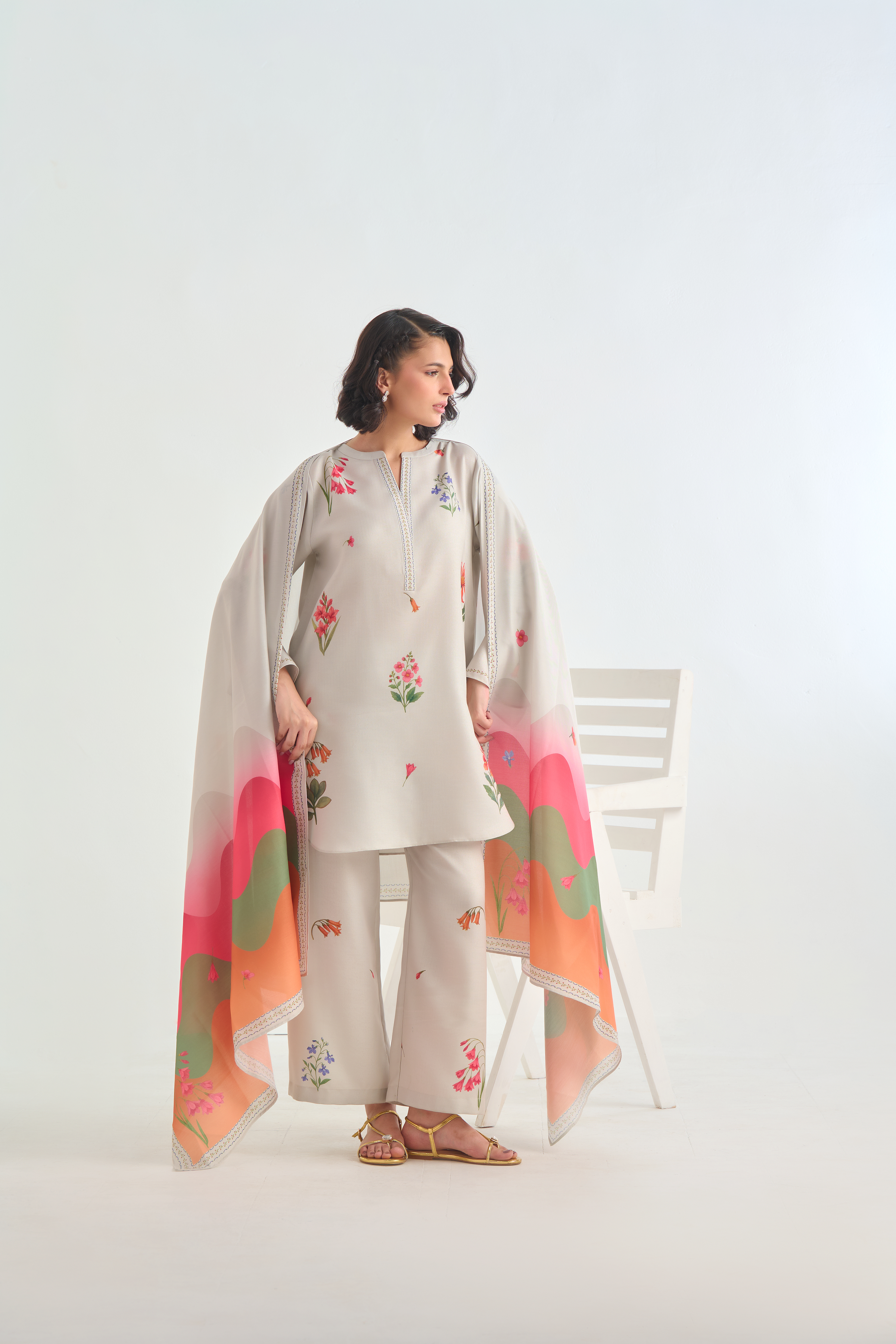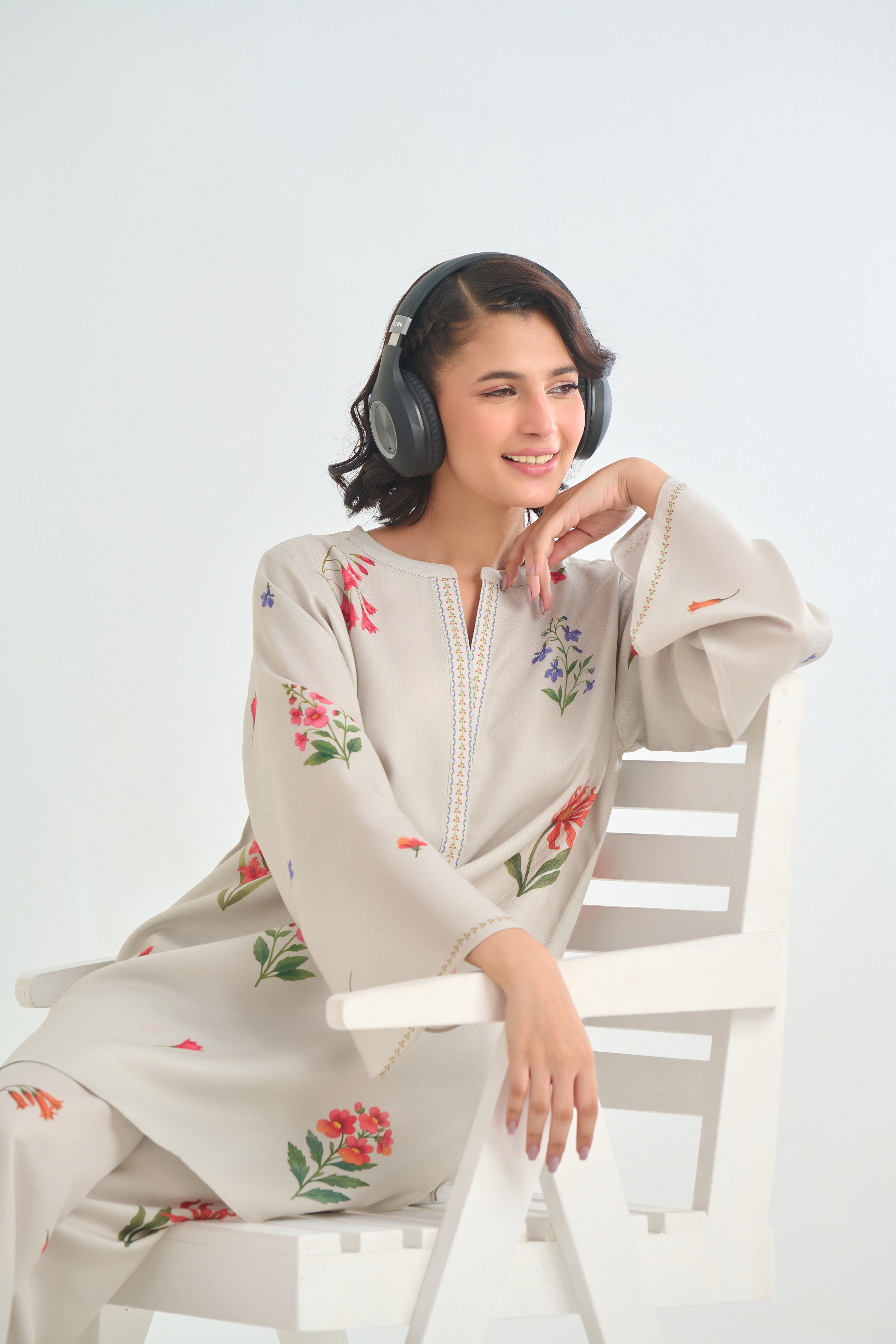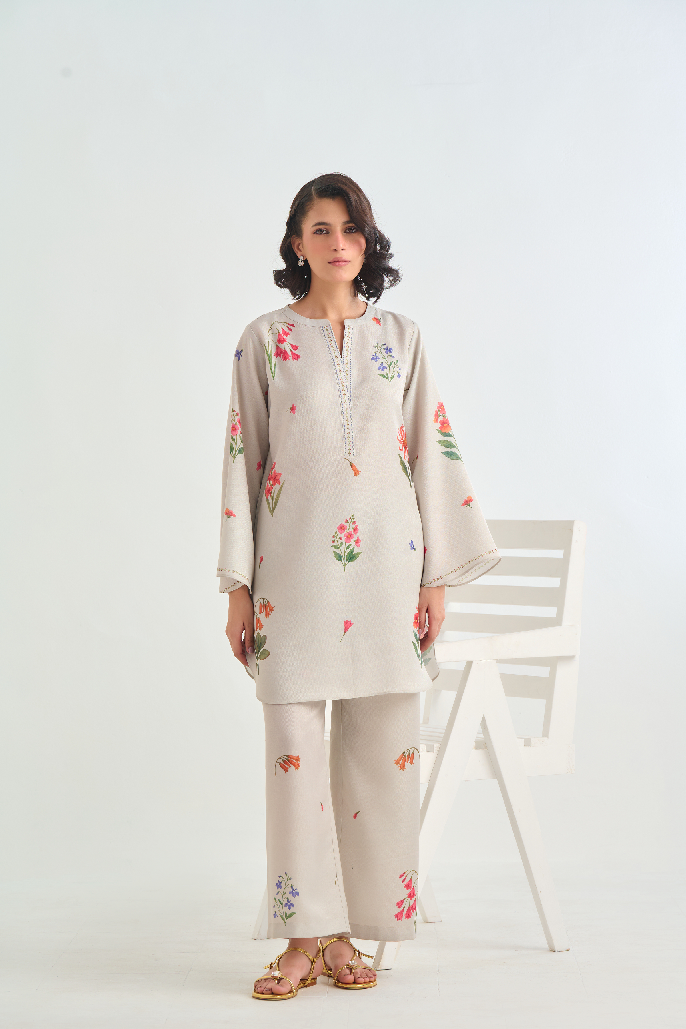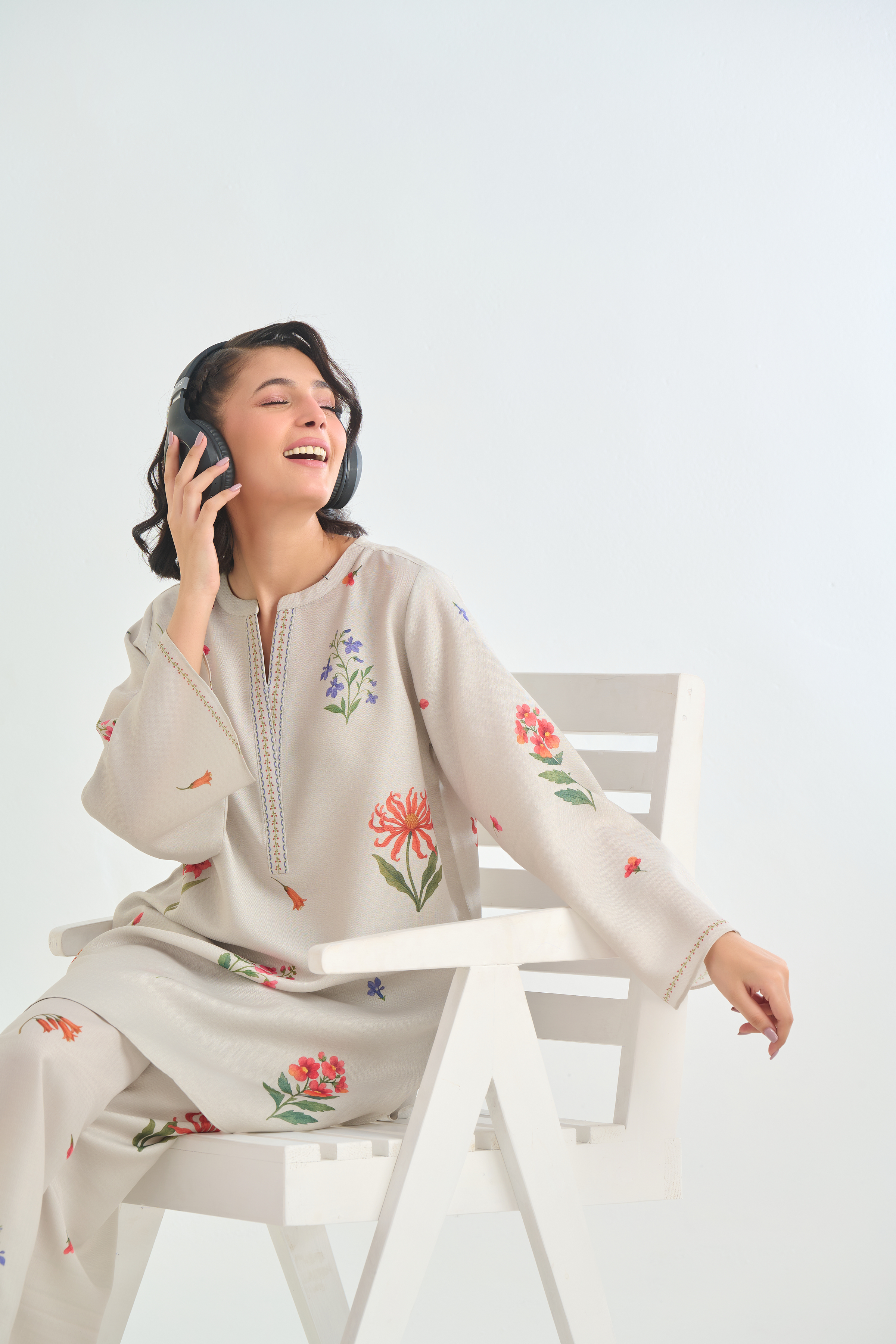 Description: Elevate your wardrobe with this exquisite ivory cord set, thoughtfully designed for both comfort and style. The ensemble features a shirt and matching trousers, beautifully adorned with scattered multi-colour botanical motifs that add a touch of natural elegance.
