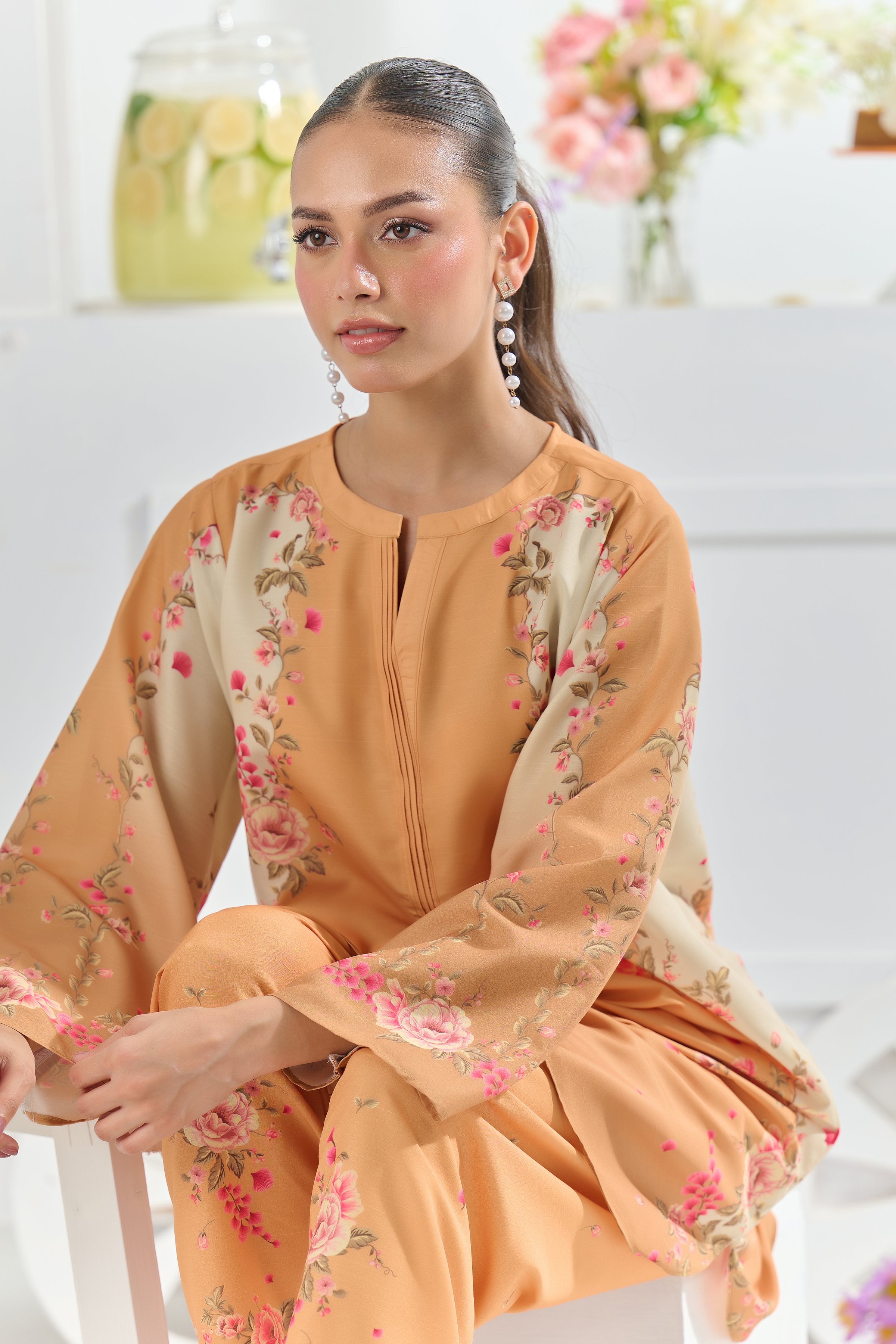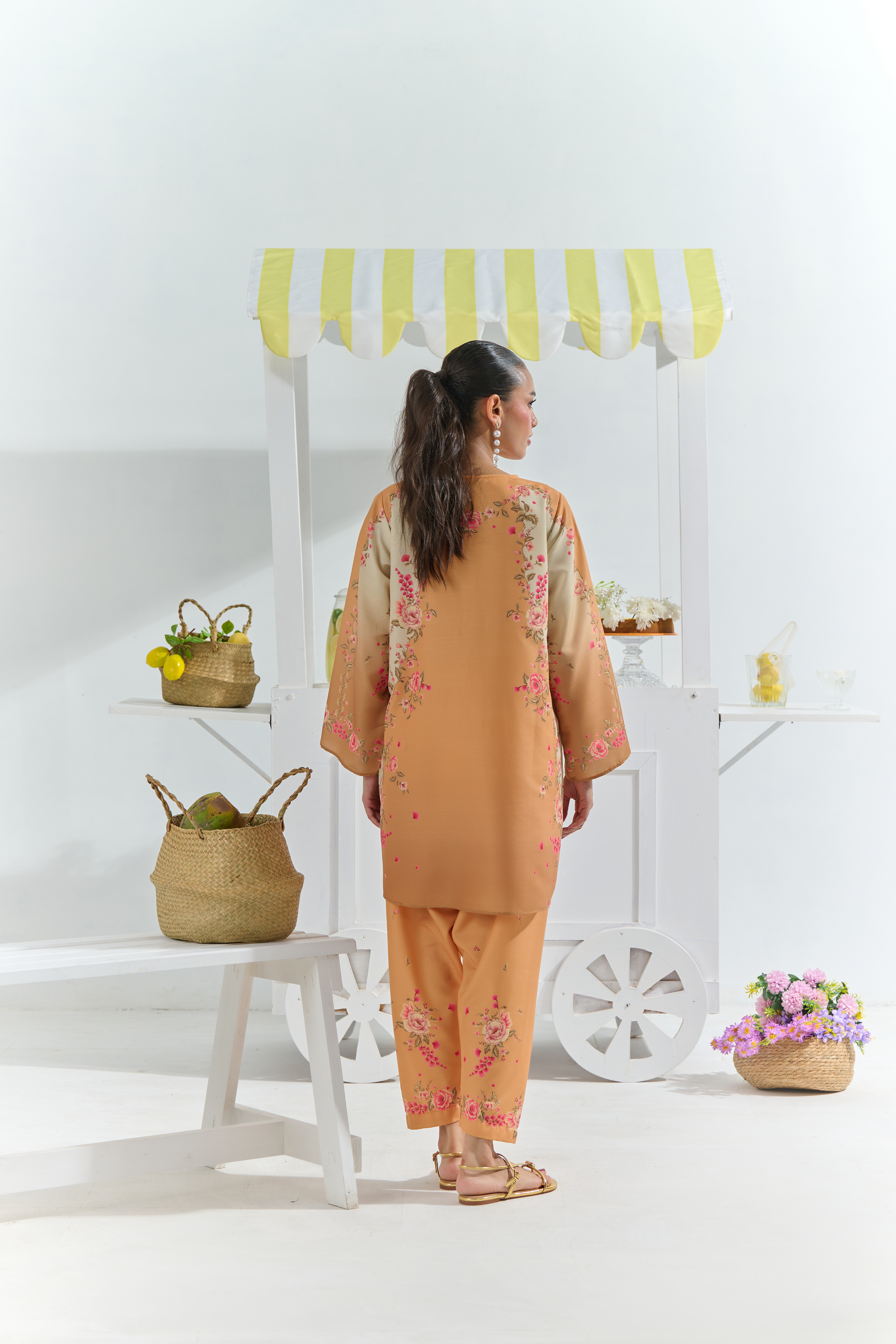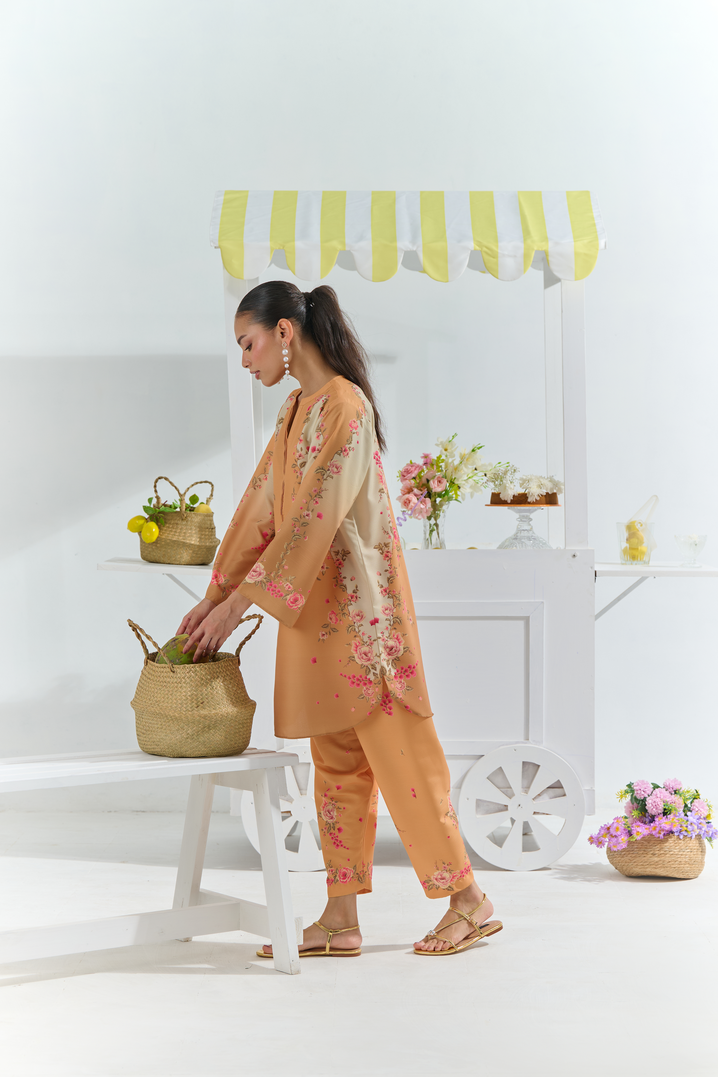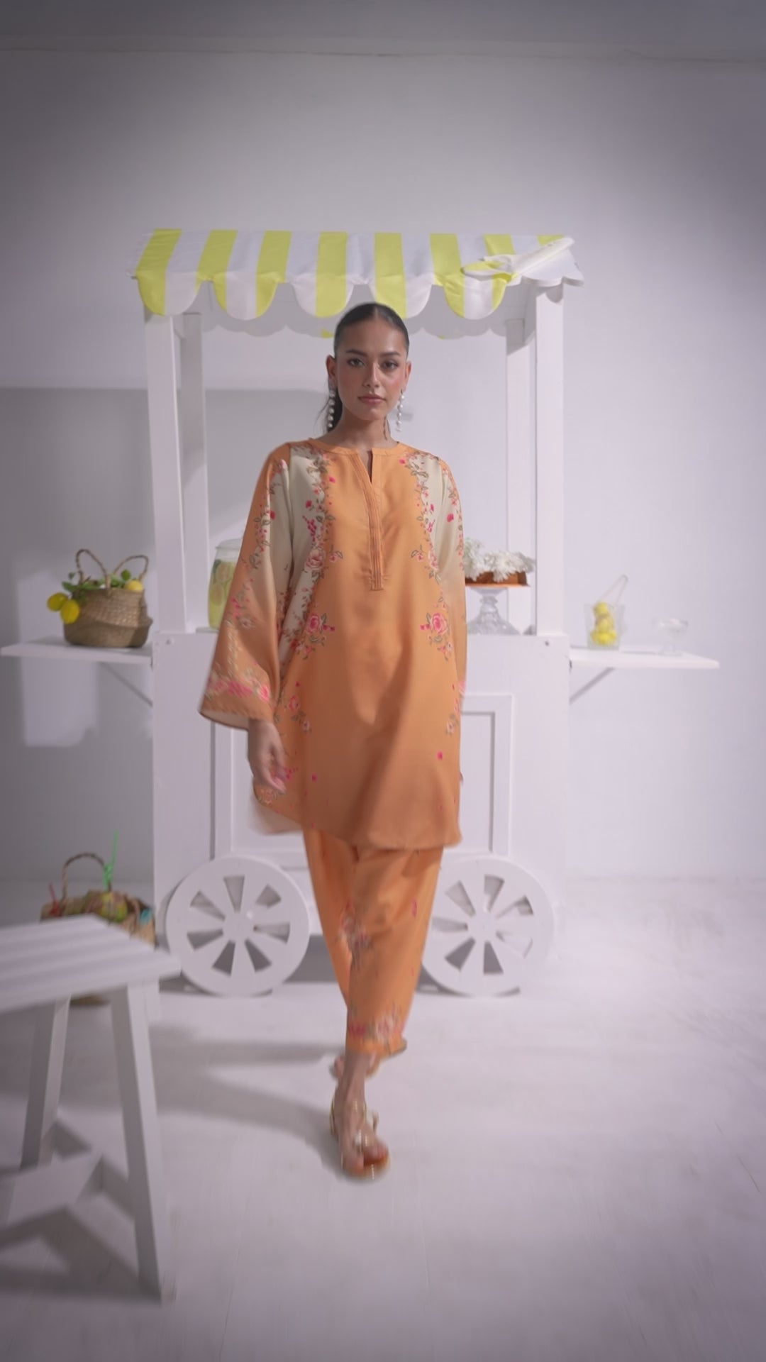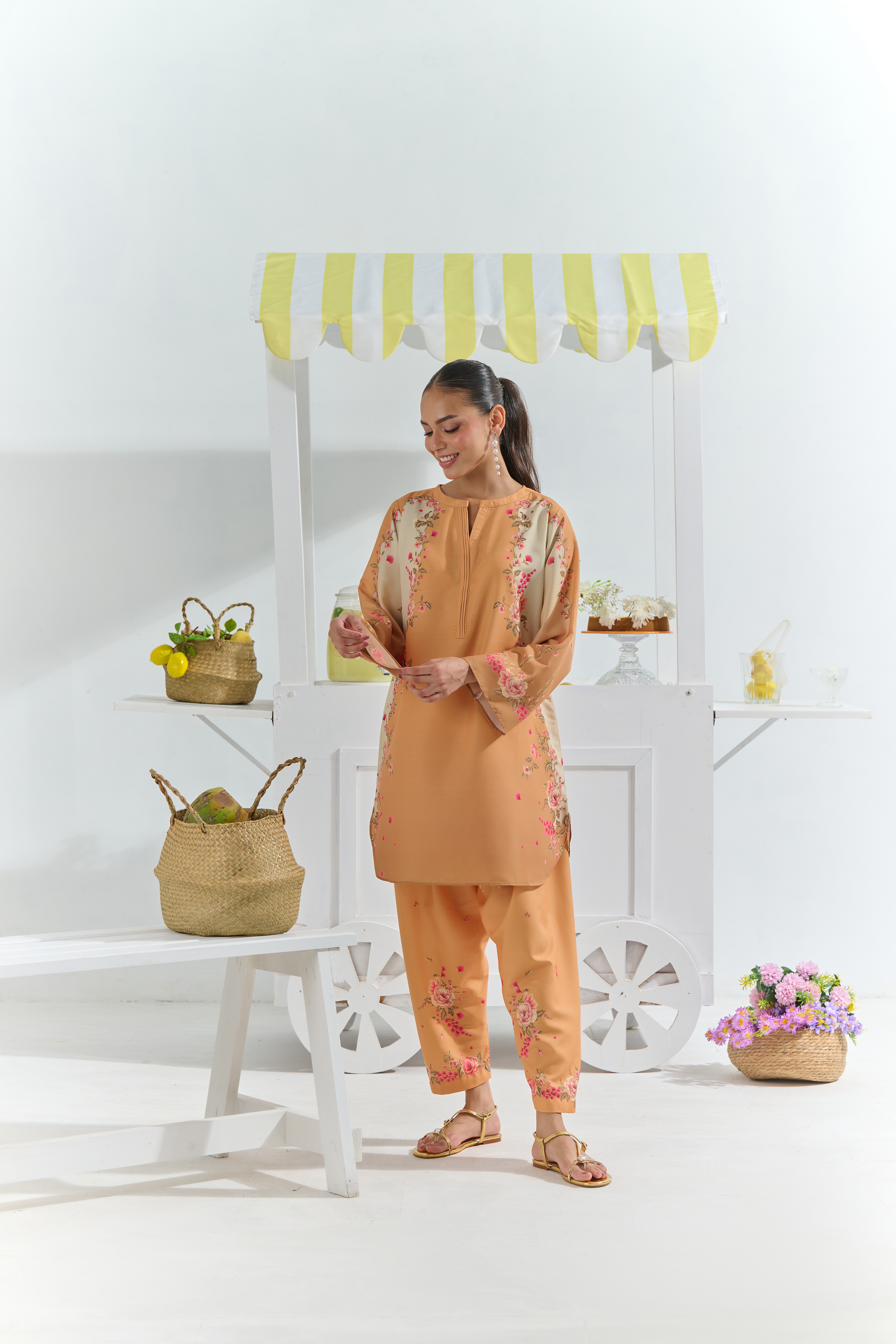 Description: Drape yourself in Sunset Orange and Cream set– a classic outfit that speaks volumes in style.