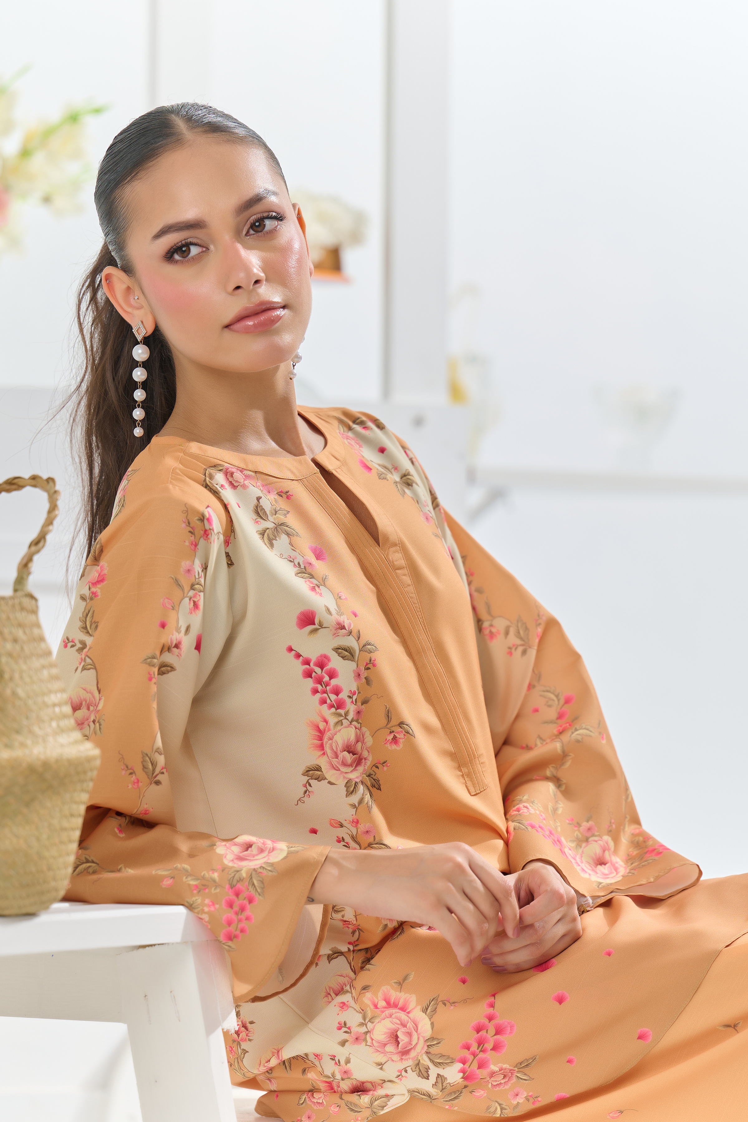Color: Sunset orange with floral patterns in shades of pink and cream.