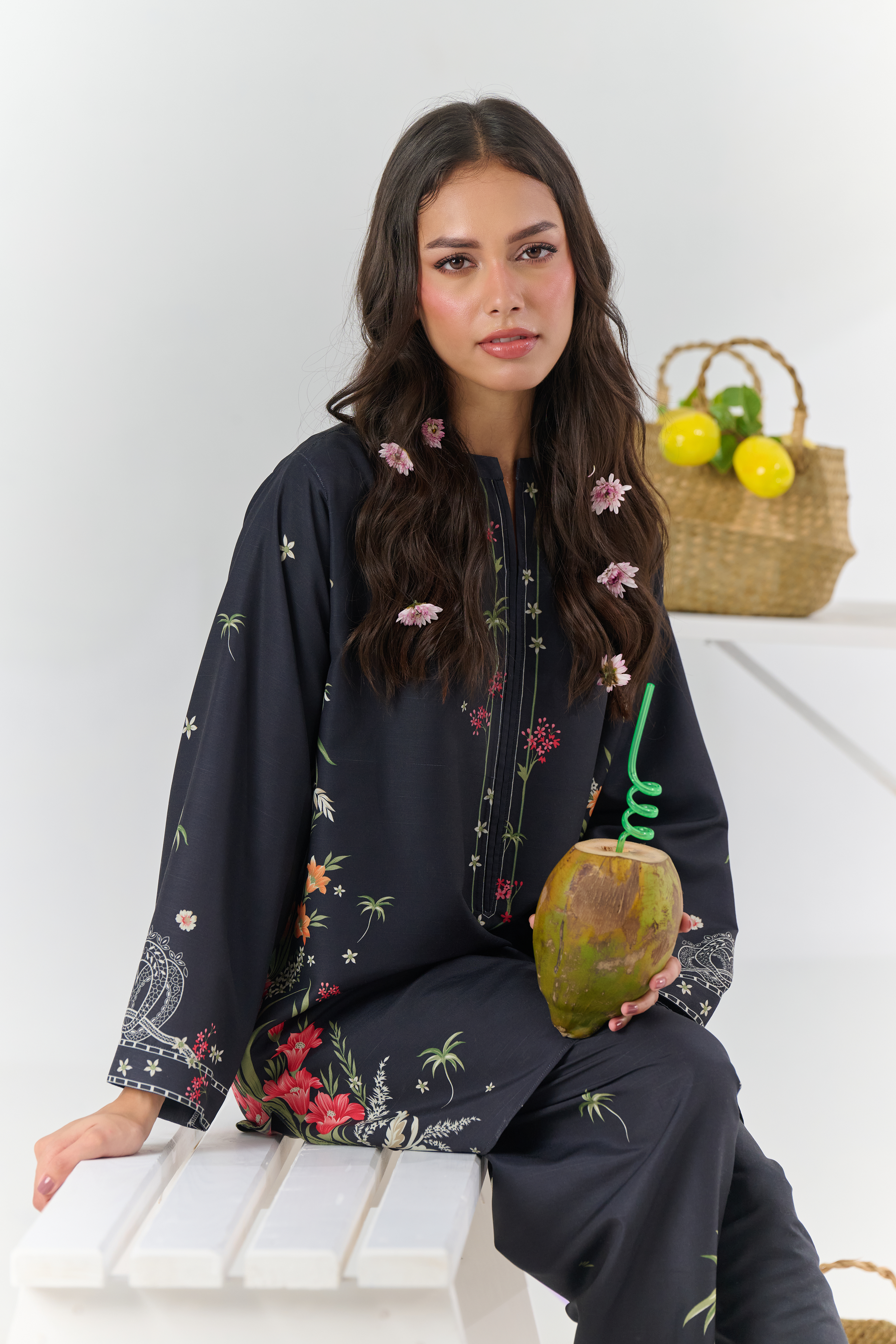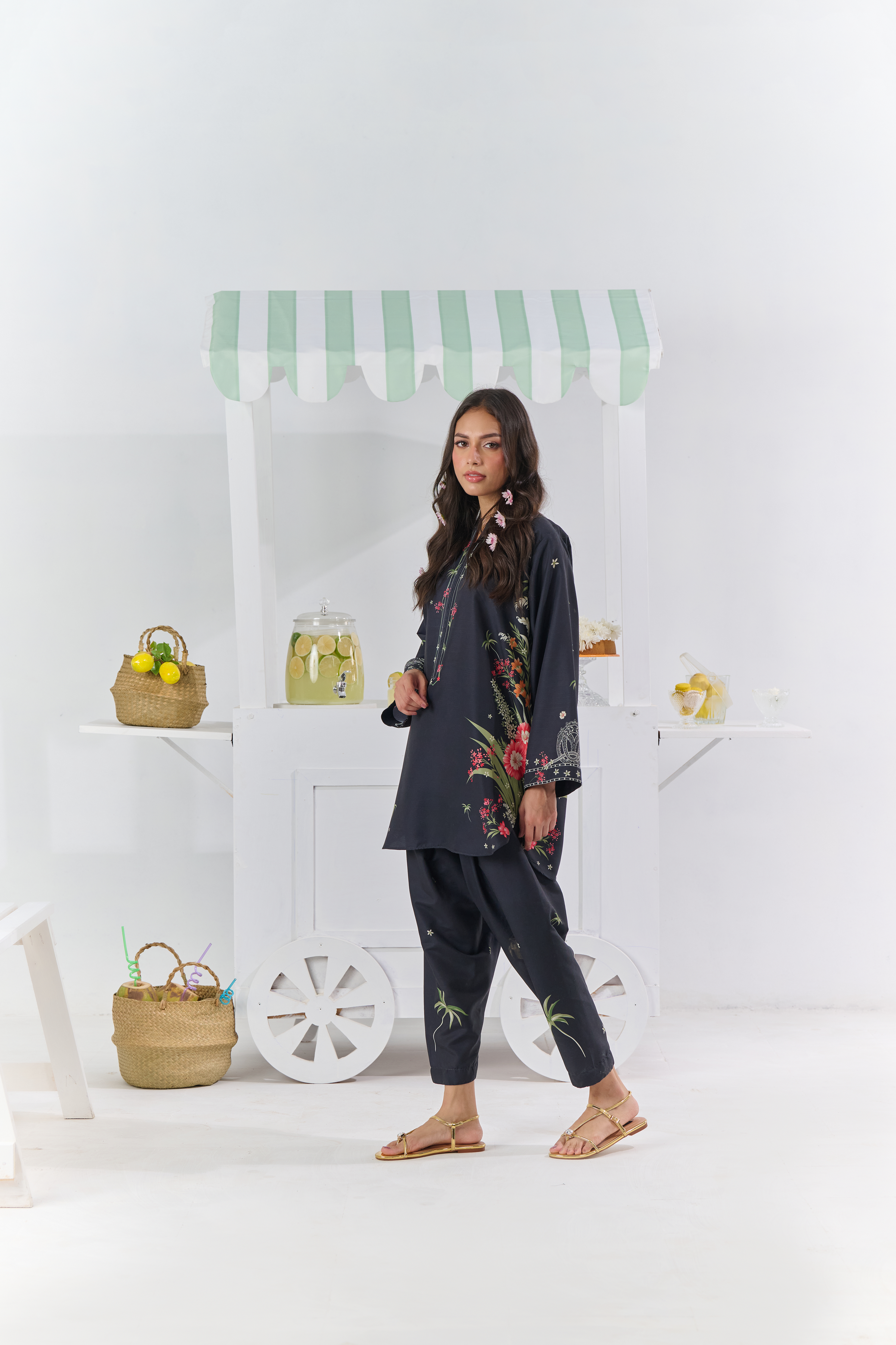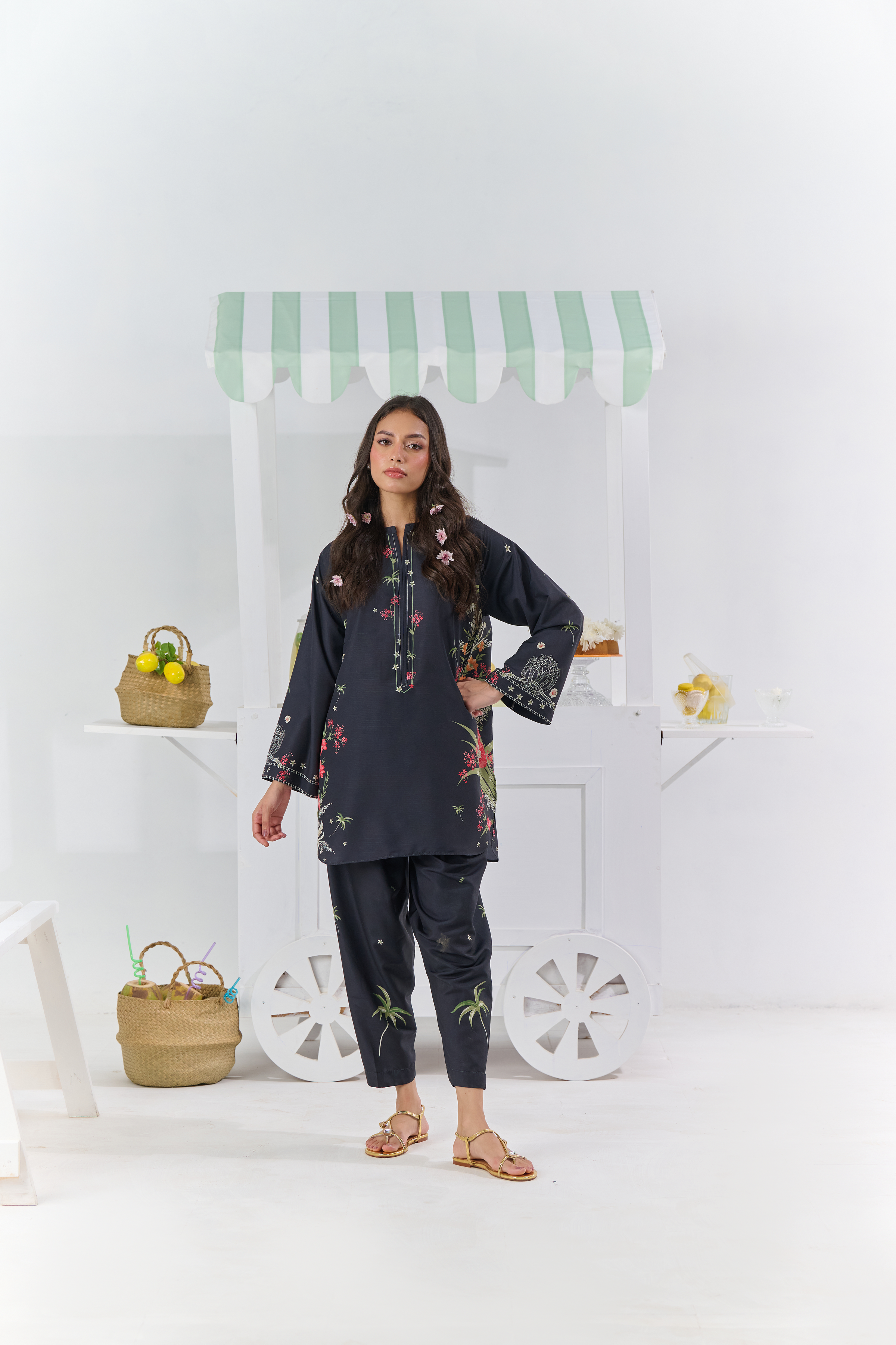 Color: A black set adorned with a vibrant multi-colour floral print is delicately highlighted by charming hints of daisies, adding a fresh and playful touch.